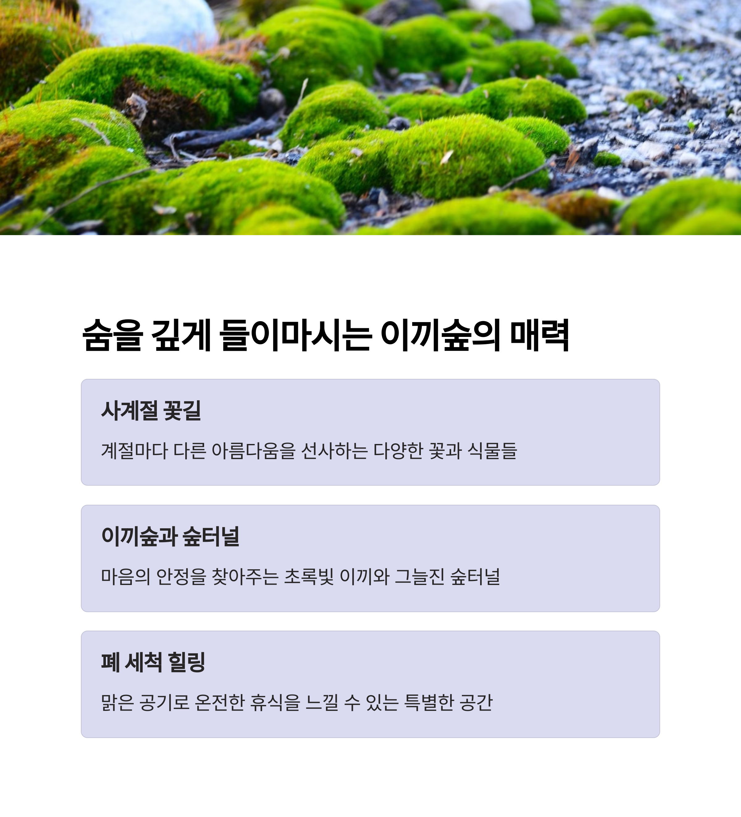 이끼숲소길 산책 600m 자연 산책로와 포토존이 있는 숲속 카페