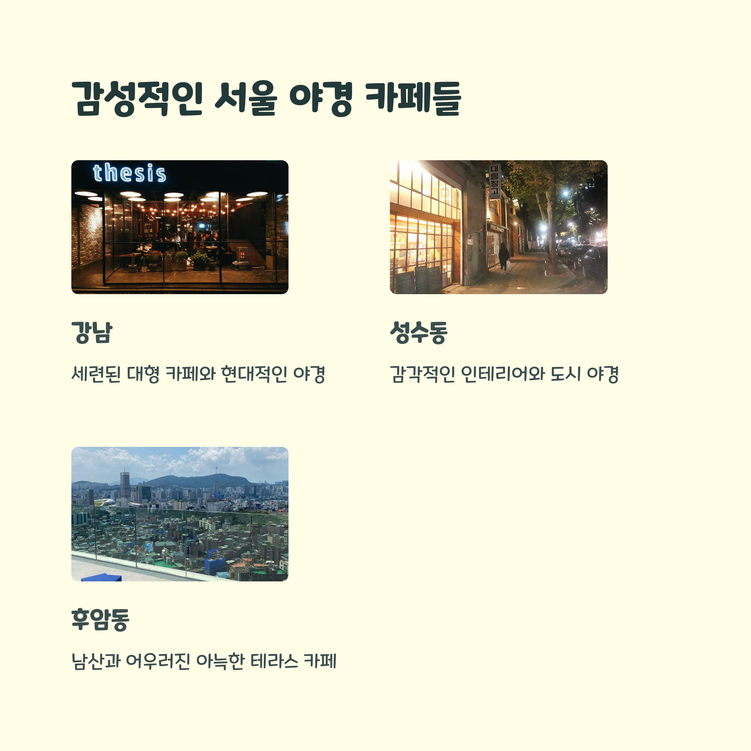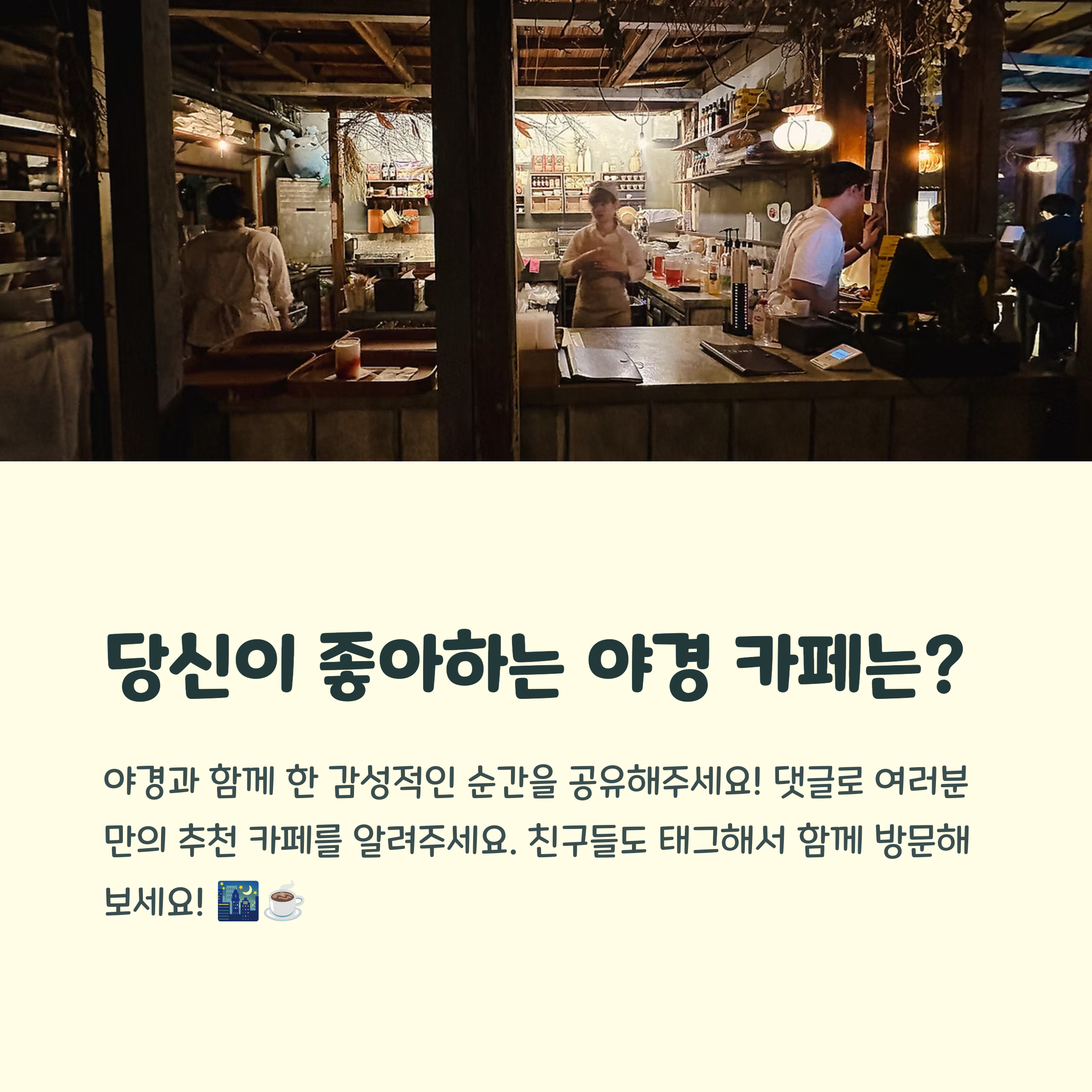 야경이 예뻤던 서울 카페, 분위기 좋은 밤 감성 카페가 있다면 댓글로 공유해주세요! 여러분의 경험이 더 많은 이들에게 특별한 밤을 선물할 수 있어요 ✨