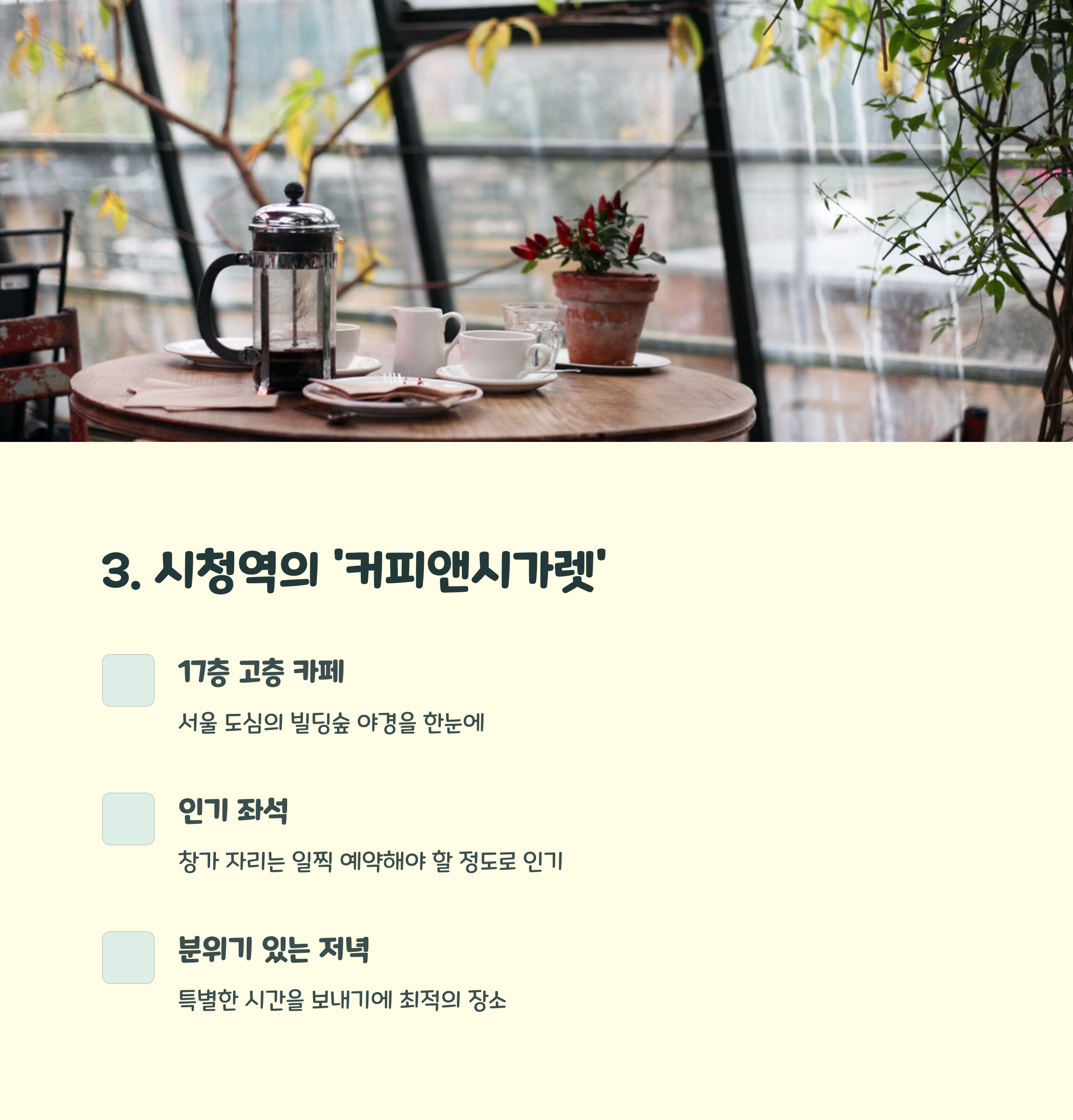 도심 속에서 시티뷰 야경을 즐기고 싶다면 시청역 인근 ‘커피앤시가렛’을 소개할게요. 고층 빌딩 17층에서 내려다보는 서울 도심의 불빛은 마치 영화 속 한 장면처럼 분위기를 연출해 줘요. 특히 창가 좌석 경쟁이 치열할 정도로 인기고, 커피 메뉴 역시 깔끔하고 조용한 음악이 더해져 감성 충전하기 딱 좋은 공간이랍니다.