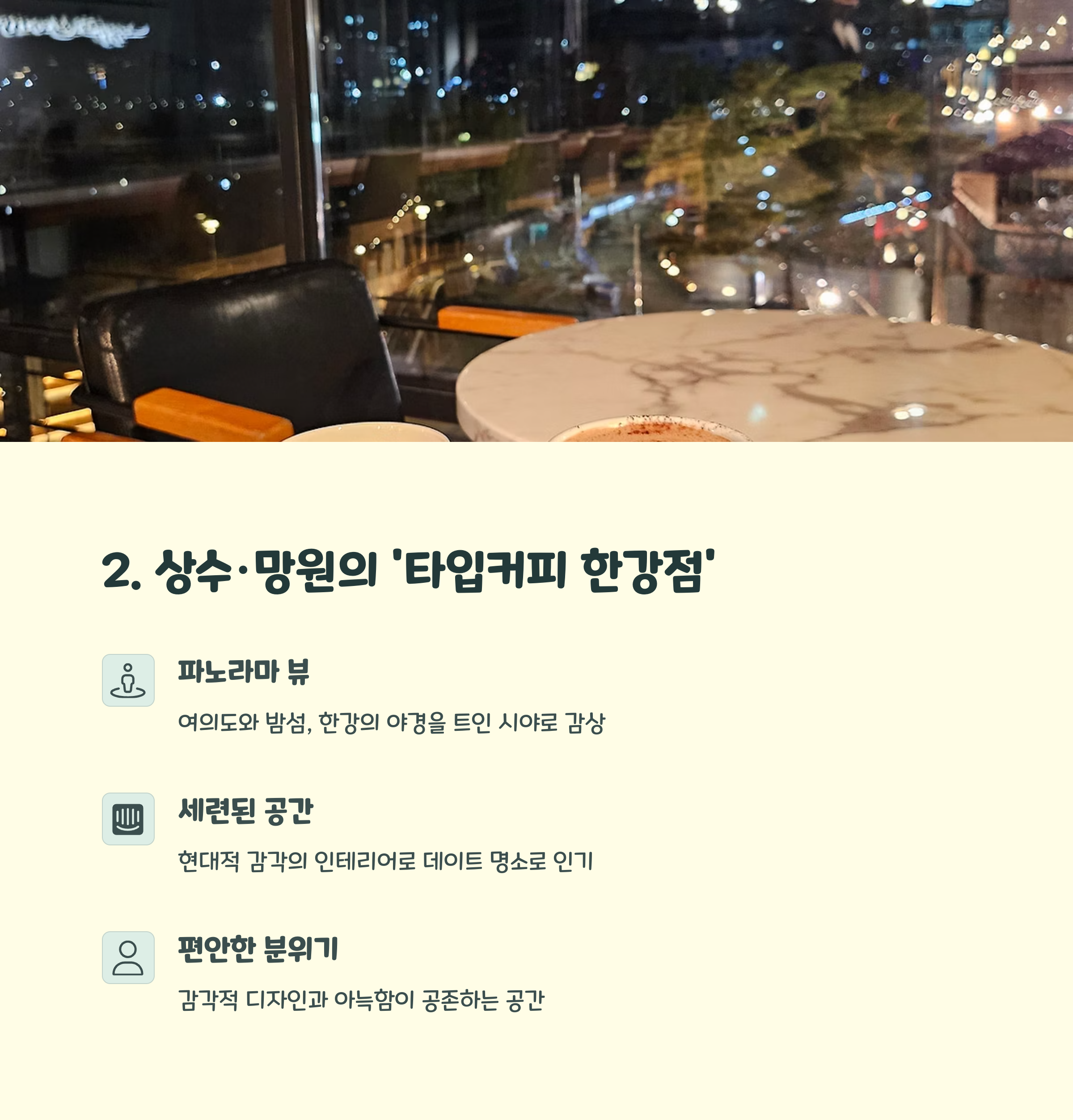 | 블러, 타입커피 등 합정·상수 인근 한강 야경 카페 추천 | 커피앤시가렛처럼 고층에서 서울 도심 뷰 감상하기 좋아요 | 노들섬 더한강, 강남·성수 일대 야경 카페도 인기 |