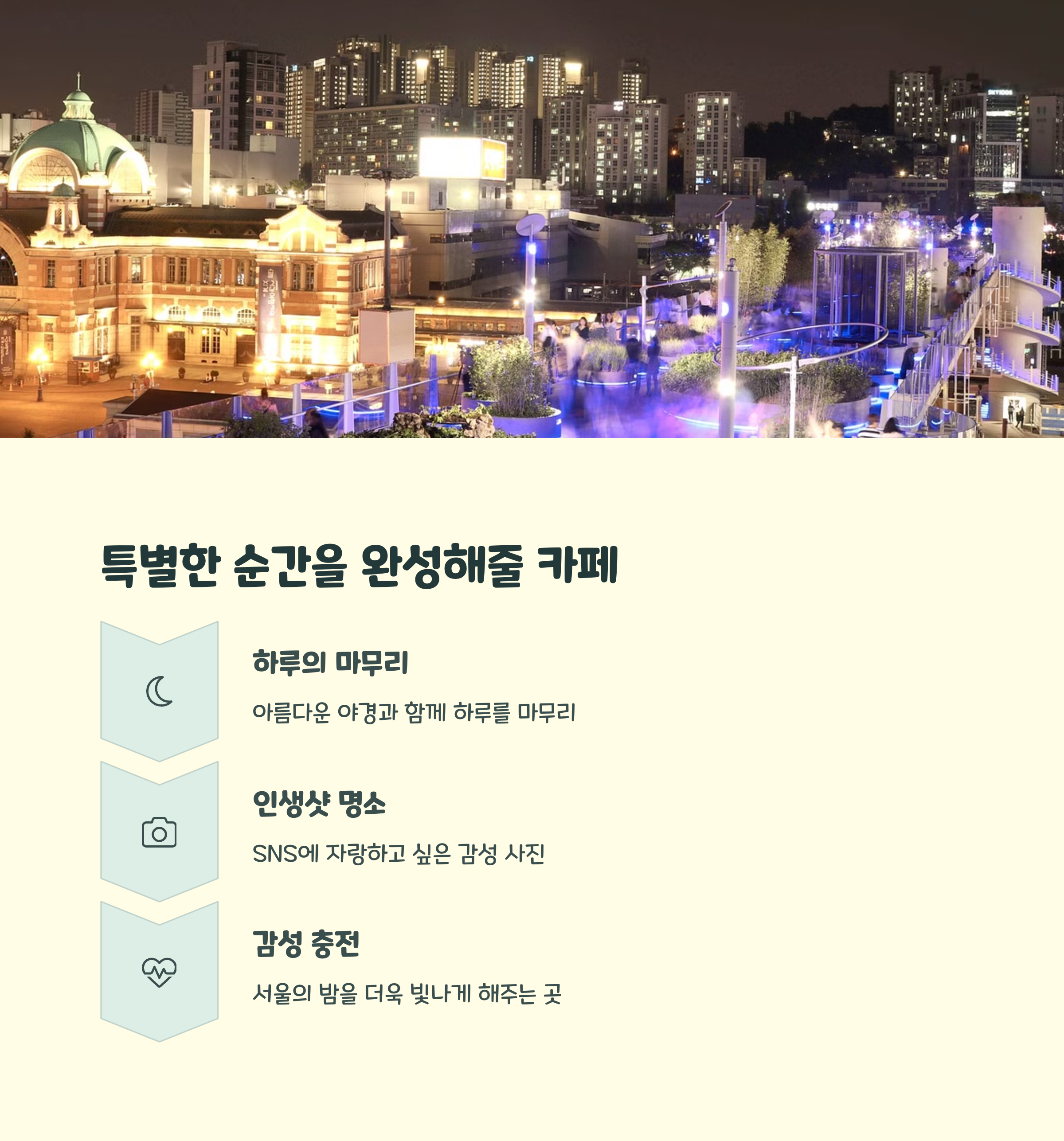 | 야경과 함께 감성 충전 가능한 조용한 분위기 | 데이트, 혼자 힐링, 친구와 대화 모두 가능한 공간 | 인스타 감성 가득한 야경 포토존 카페로도 추천! |