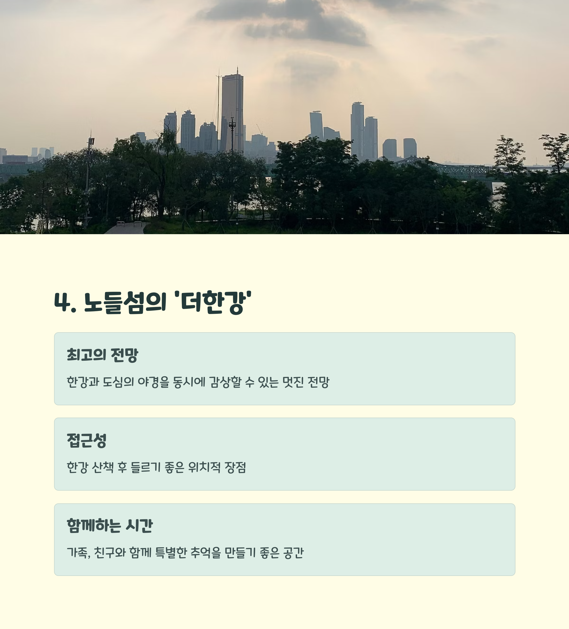노들섬 ‘더한강’은 서울 도심에서 한강과 빌딩 불빛을 동시에 감상할 수 있어 산책 후 들르기 좋은 위치로 많은 사랑을 받고 있어요. 특히 음악 공연이나 문화 공간과도 가까워 복합문화+카페 데이트 코스로 활용되기도 해요. 이 외에도 강남, 성수동 일대에는 고급스러운 야경과 감각적인 인테리어가 어우러진 야간 운영 대형 카페들이 많으니 분위기 있는 서울의 밤을 제대로 즐겨보세요!