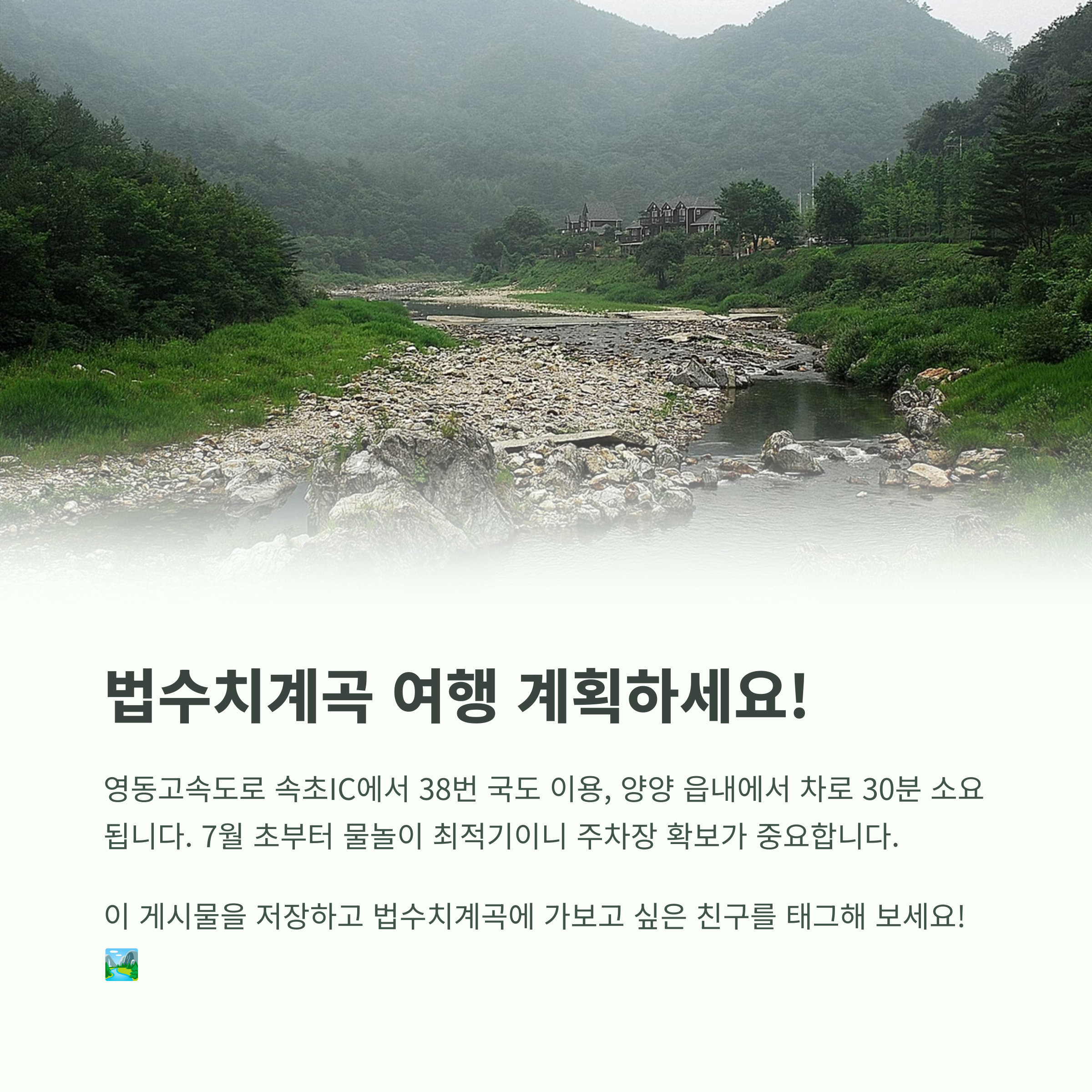 양양 법수치계곡은 자연 속 시원한 물놀이와 함께 조용한 휴식을 누릴 수 있는 여름철 최고의 피서지입니다. 청정 계곡물과 한적한 분위기, 안전한 물놀이 환경까지 모두 갖춘 이곳에서 가족, 연인, 친구와 함께 잊지 못할 여름 추억을 만들어보세요.