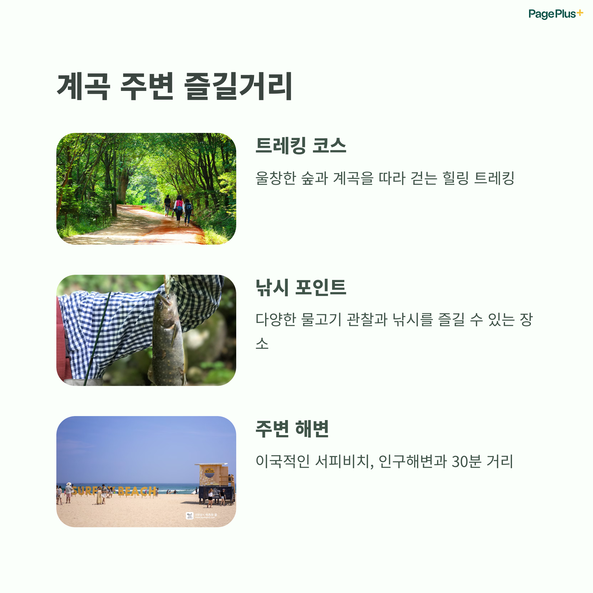 | 맑은 계곡물, 기암절벽, 한적한 자연 속 물놀이 | 펜션, 민박, 캠핑장 다수 (계곡 근접 숙소) | 구명조끼 필수, 물살 주의, 자연 보호 캠페인 동참 |