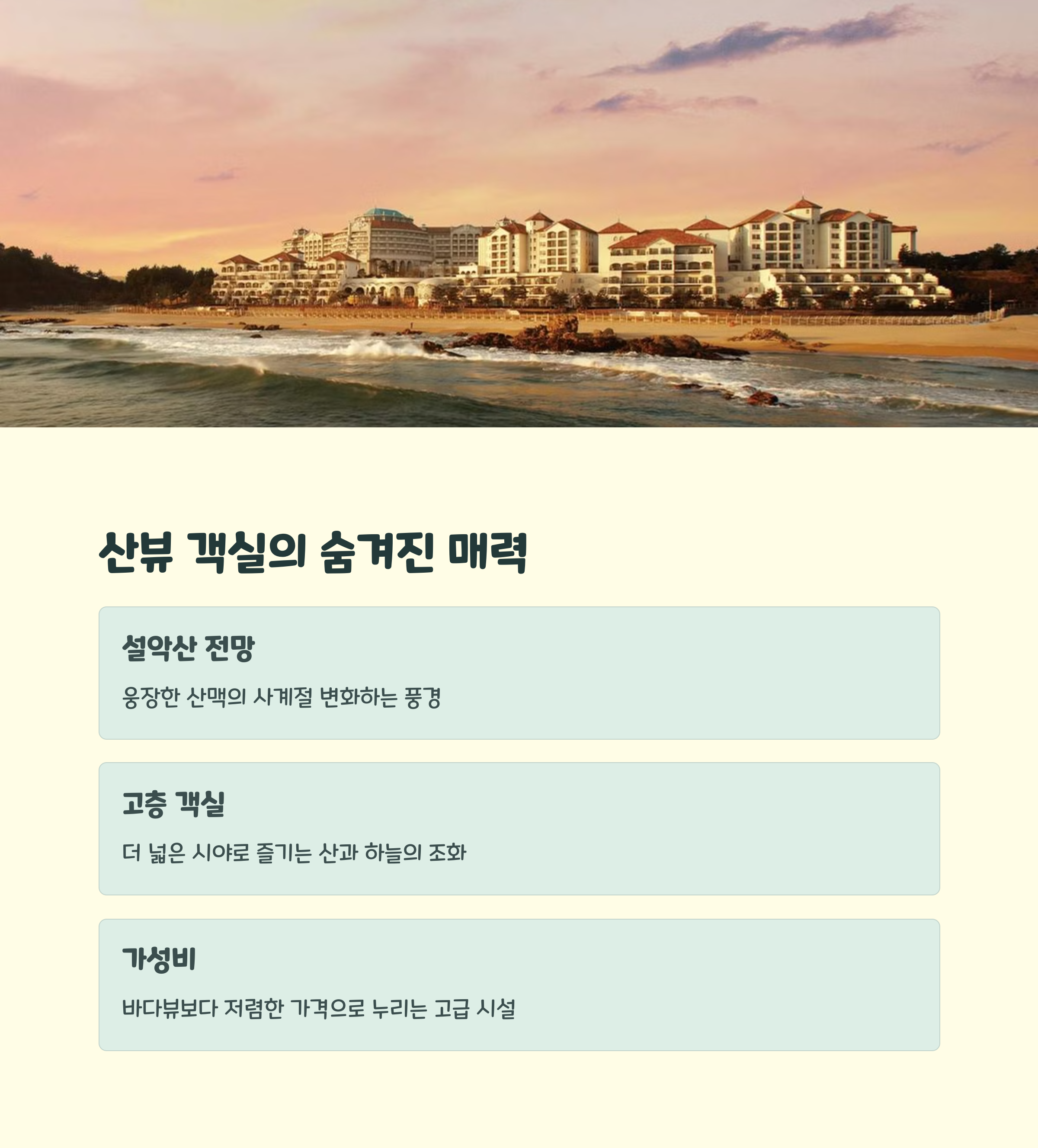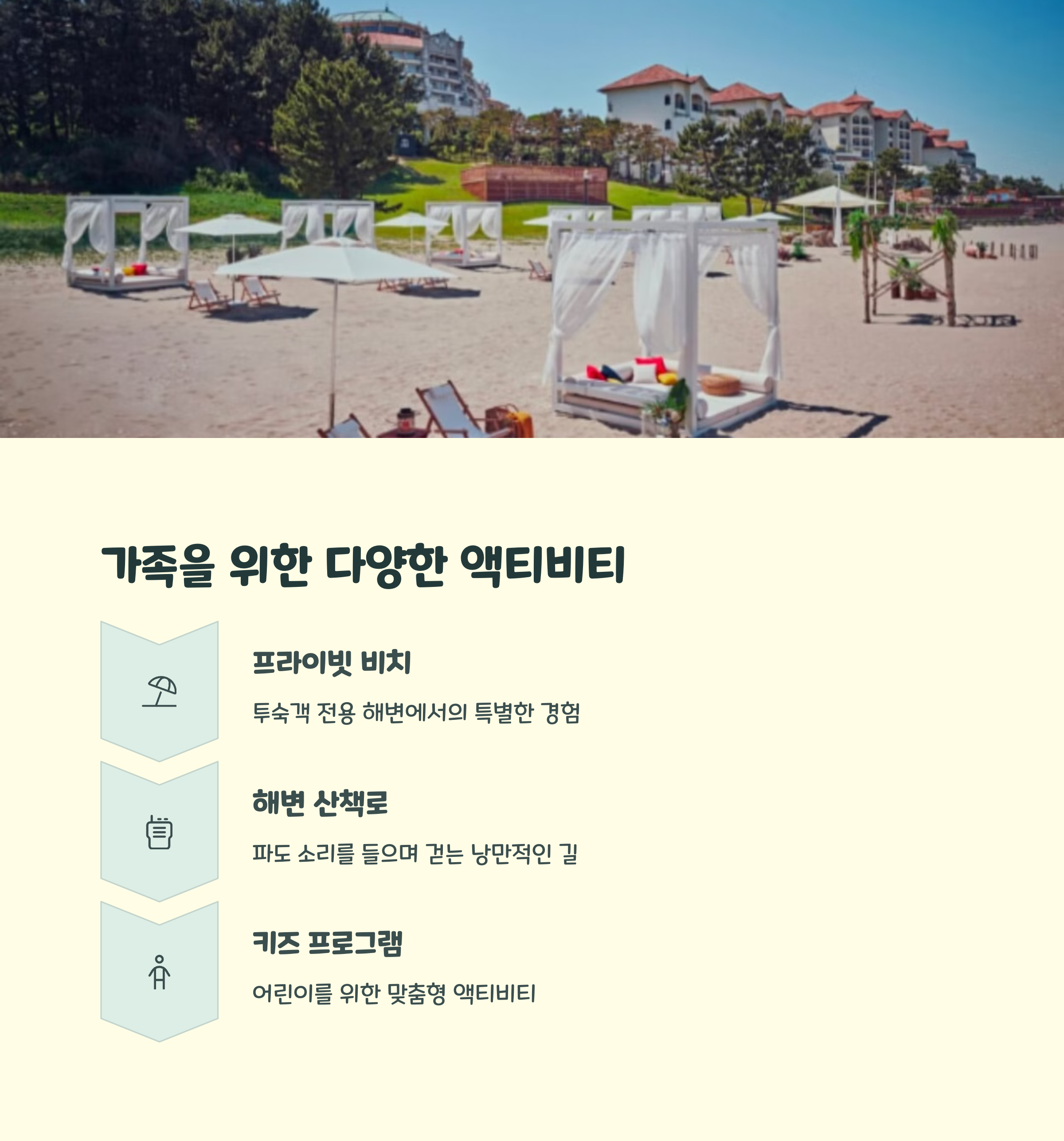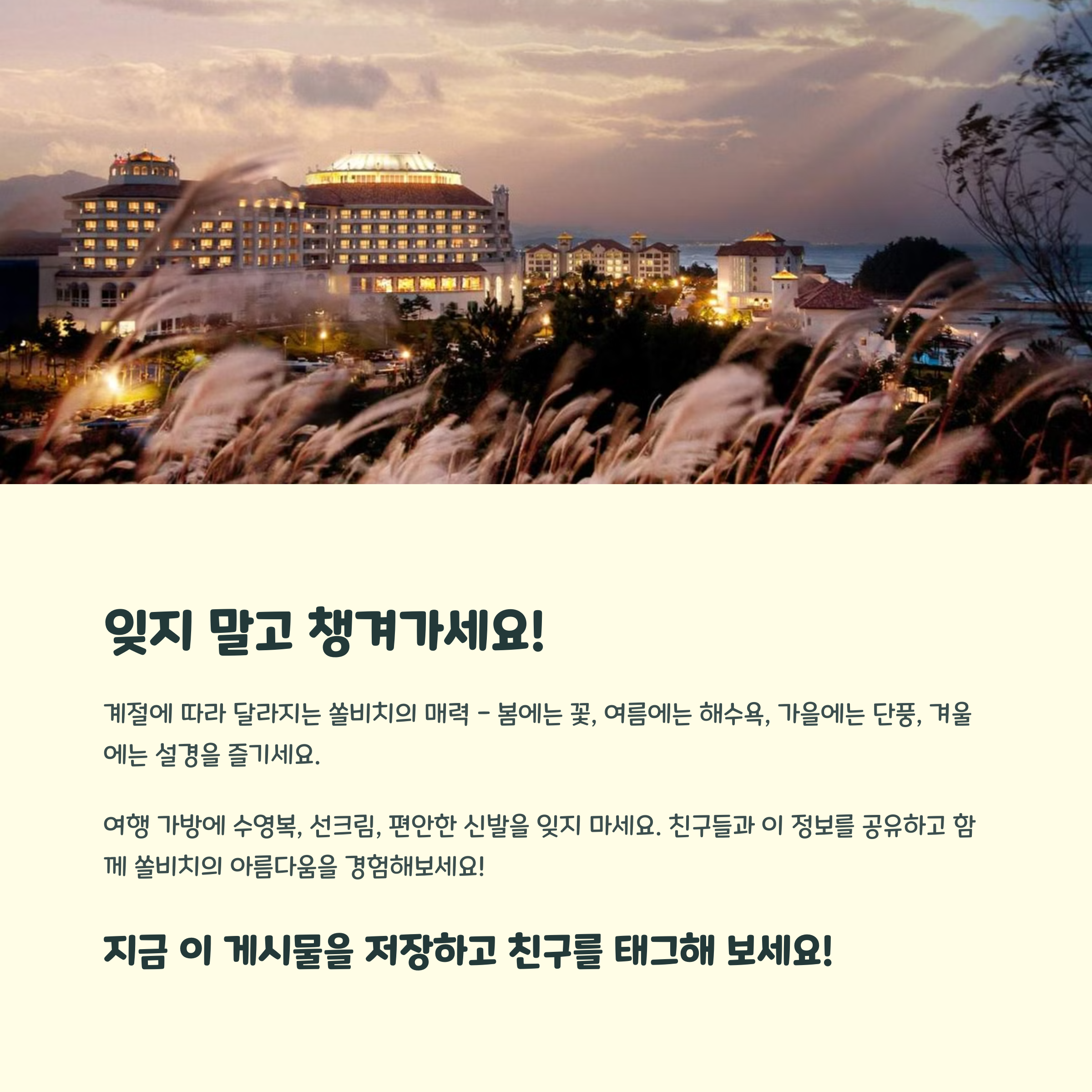 양양 쏠비치 리조트는 자연과 휴식, 이국적인 풍경을 모두 즐길 수 있는 프리미엄 숙소입니다. 바다 뷰 객실에서의 낭만은 말로 다 표현하기 어려울 정도로 감동적이며, 가족, 커플, 친구 누구와 함께 와도 만족스러운 시간을 보낼 수 있습니다. 지금이 바로 바다 뷰를 예약할 타이밍!