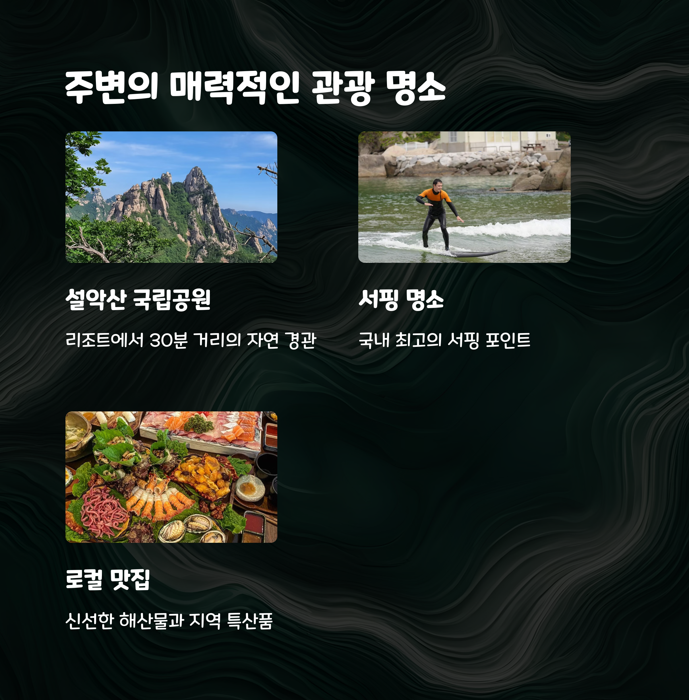 양양 쏠비치 리조트는 동해와 설악산이 동시에 보이는 입지를 자랑하며, 자연의 아름다움과 현대적인 리조트 시설을 함께 누릴 수 있습니다. 스페인식 건축양식으로 설계된 외관은 이국적인 분위기를 자아내고, 내부 객실 또한 모던하고 감각적인 인테리어가 인상적입니다. 특히 해 질 무렵 창문을 통해 붉게 물드는 바다를 바라보는 경험은 많은 여행객들이 이곳을 다시 찾게 만드는 이유 중 하나입니다.