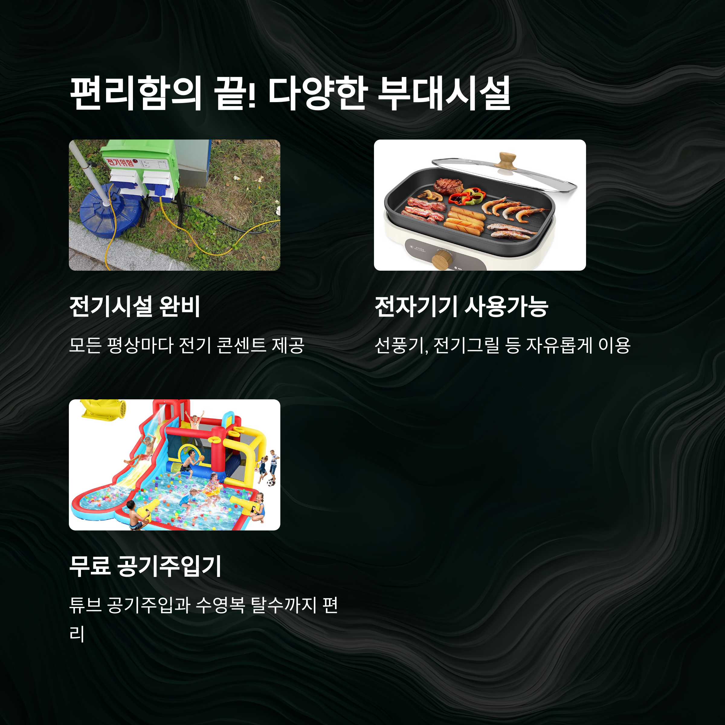 평상마다 전기가 들어와 선풍기, 전기그릴 등 다양한 전기기기 사용이 가능해 더욱 쾌적한 피서를 즐길 수 있어요.
