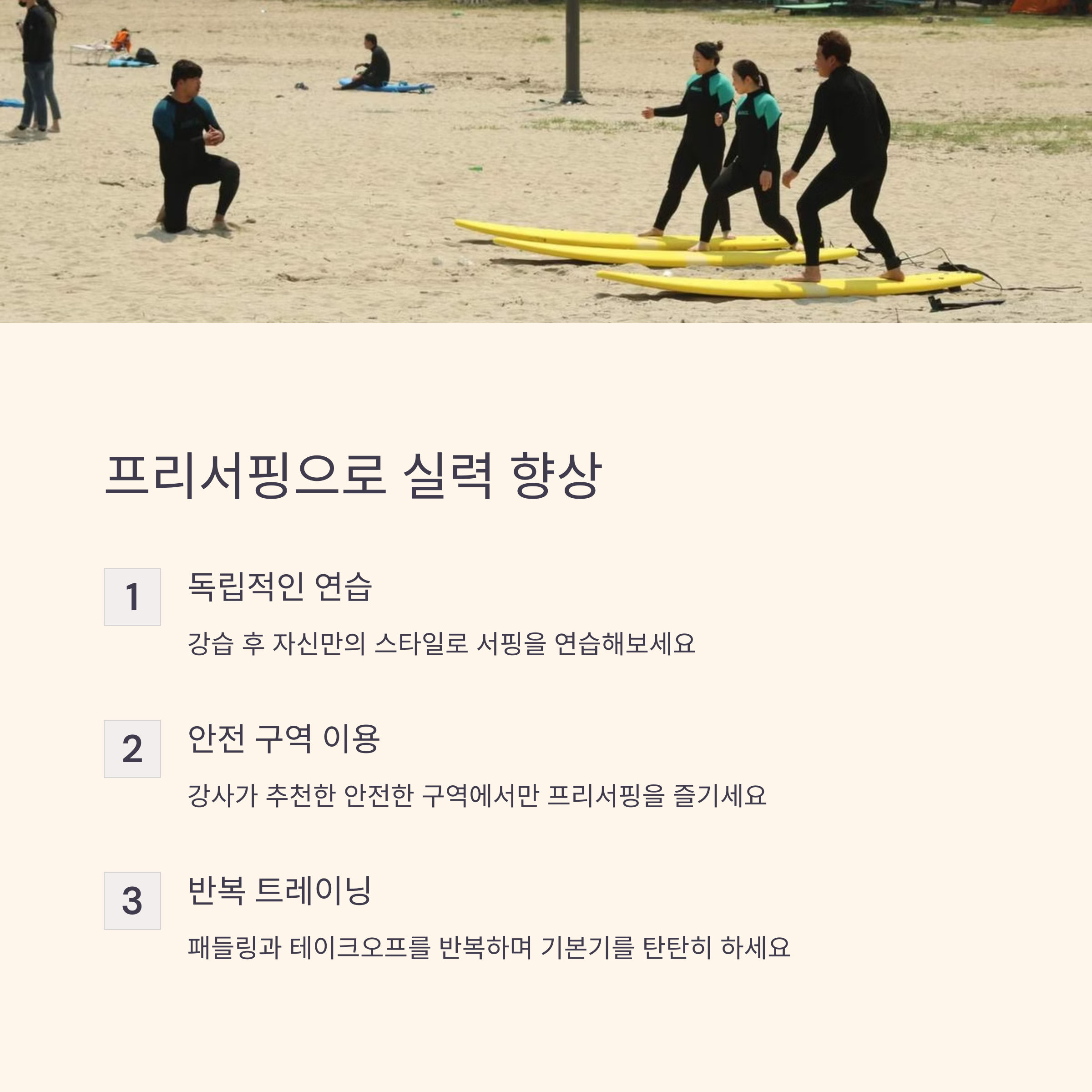 | 이론 → 육상 연습 → 바다 실습 순의 체계적인 구성 초보자도 OK! | 보드, 수트, 래쉬가드 등 대부분 현장 대여 가능 | 서핑 페스티벌, 야외 공연, 프리서핑 구역 등 다양한 활동 포함 |
