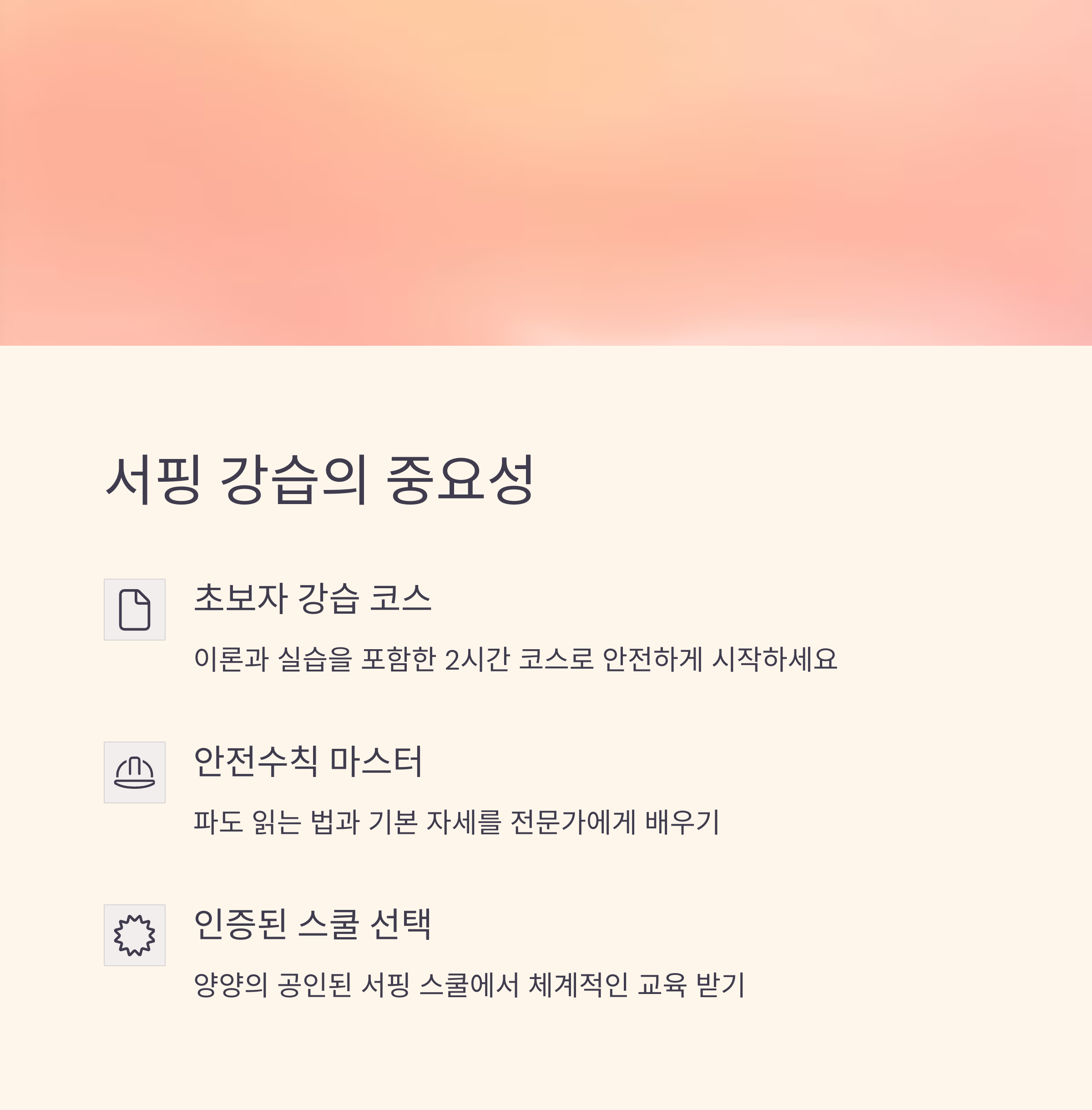 장비 걱정은 하지 않아도 됩니다! 대부분의 스쿨에서는 서핑보드, 수트 등 기본 장비를 모두 대여해 주며, 여름철에는 수트 대신 래쉬가드 착용도 가능합니다. 단, 선크림, 모자, 물, 방수팩 등 자외선과 안전을 위한 개인 용품은 꼭 챙기는 것이 좋아요. 또한, 실력에 맞는 파도를 선택하는 것도 중요한데요, 초보자는 잔잔하고 규칙적인 파도가 있는 포인트에서 천천히 시작하는 것이 안전하고 재미있습니다.