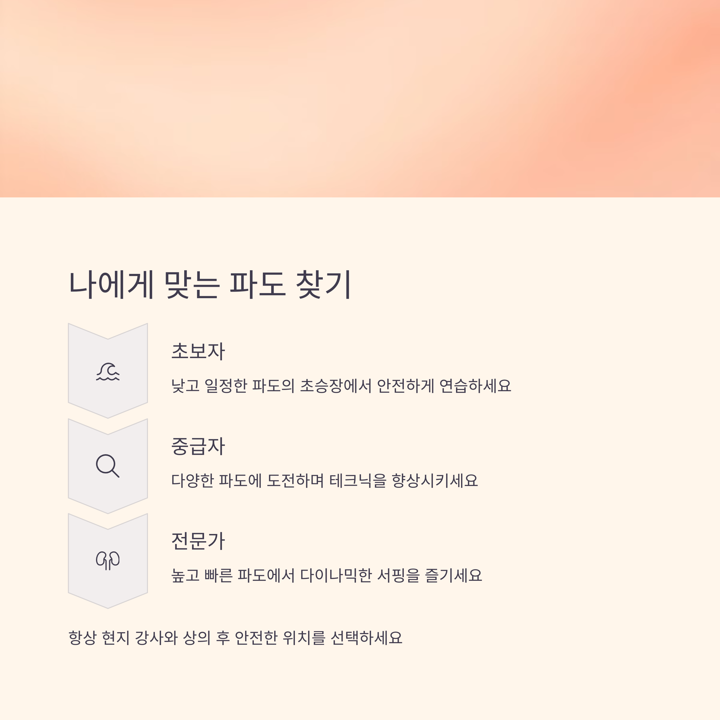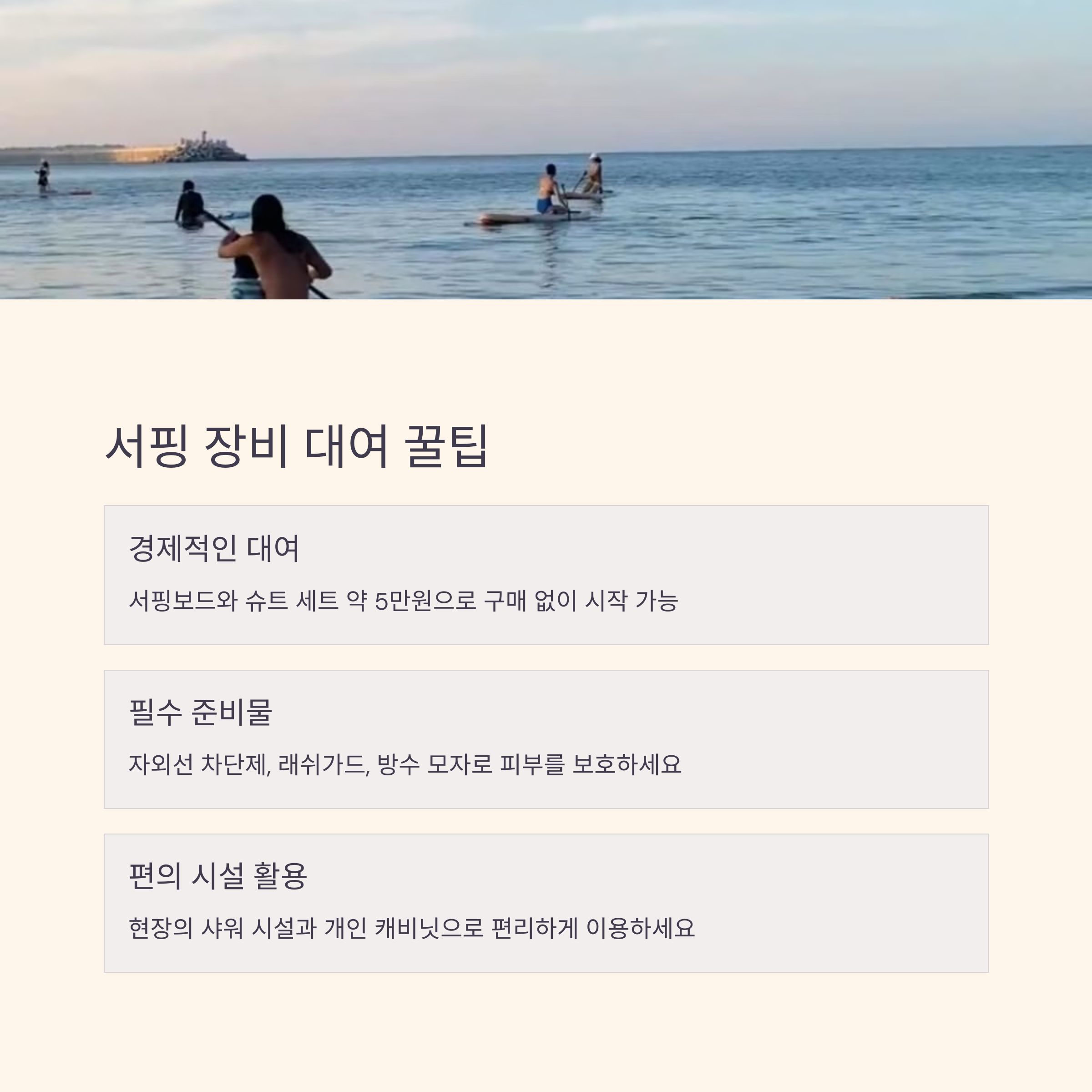 장비 걱정은 하지 않아도 됩니다! 대부분의 스쿨에서는 서핑보드, 수트 등 기본 장비를 모두 대여해 주며, 여름철에는 수트 대신 래쉬가드 착용도 가능합니다. 단, 선크림, 모자, 물, 방수팩 등 자외선과 안전을 위한 개인 용품은 꼭 챙기는 것이 좋아요. 또한, 실력에 맞는 파도를 선택하는 것도 중요한데요, 초보자는 잔잔하고 규칙적인 파도가 있는 포인트에서 천천히 시작하는 것이 안전하고 재미있습니다.