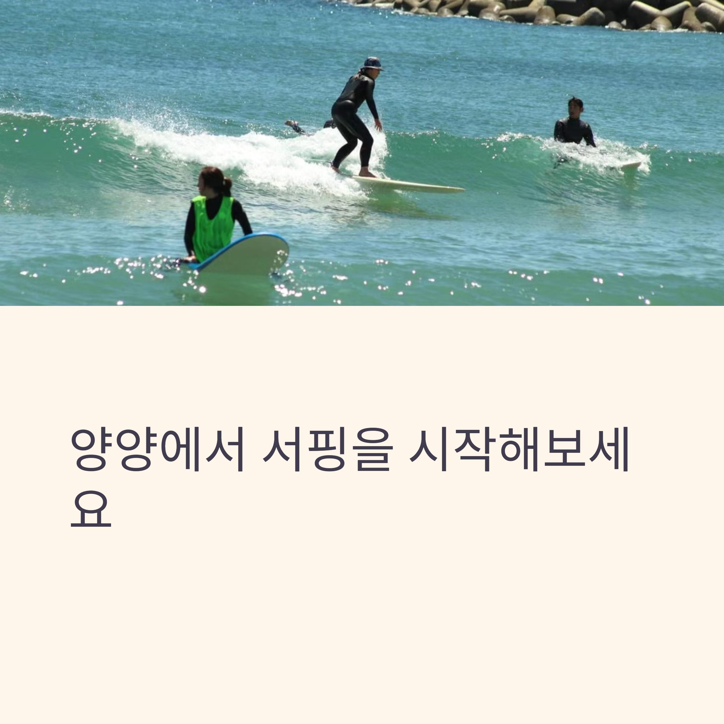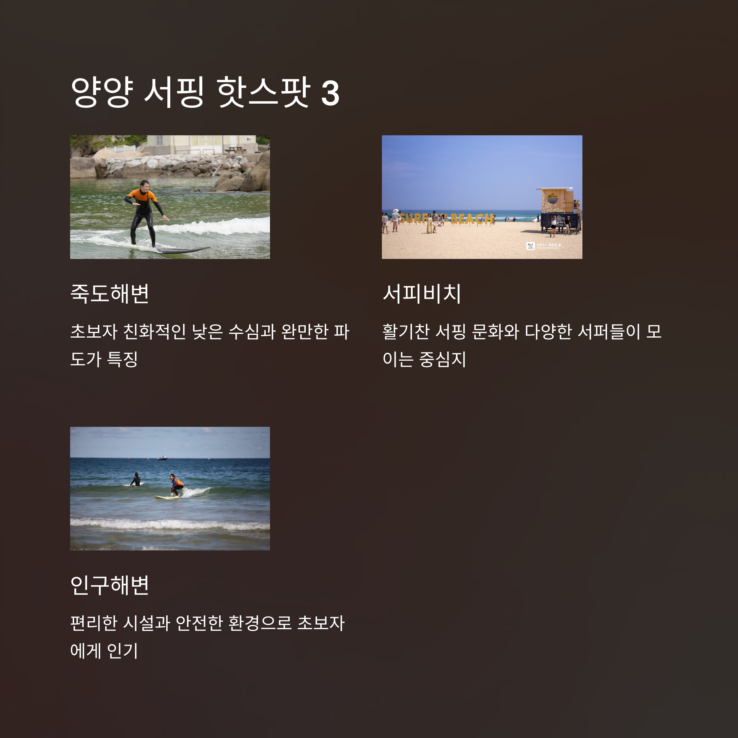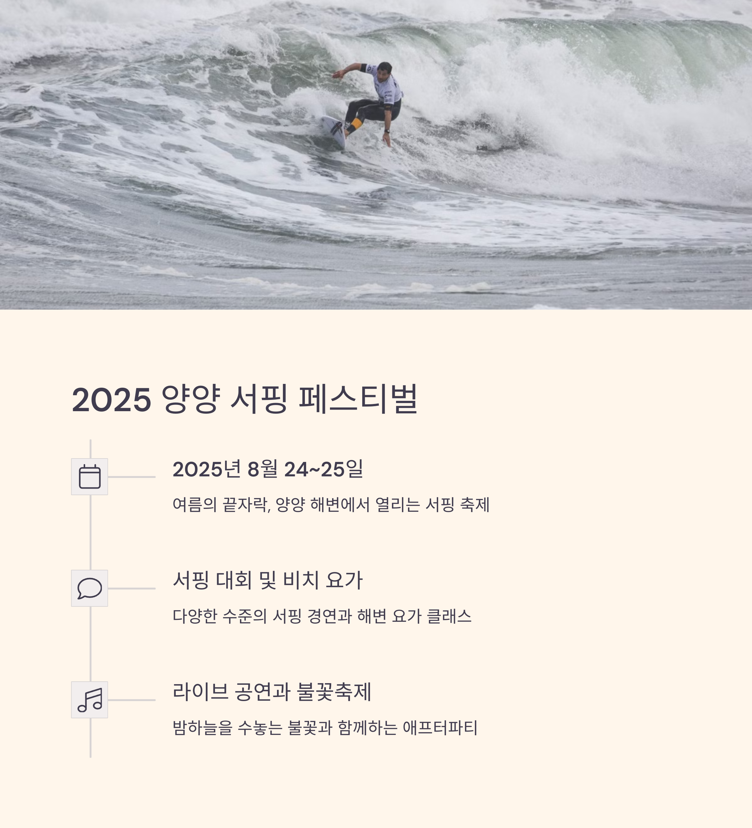 | 이론 → 육상 연습 → 바다 실습 순의 체계적인 구성 초보자도 OK! | 보드, 수트, 래쉬가드 등 대부분 현장 대여 가능 | 서핑 페스티벌, 야외 공연, 프리서핑 구역 등 다양한 활동 포함 |
