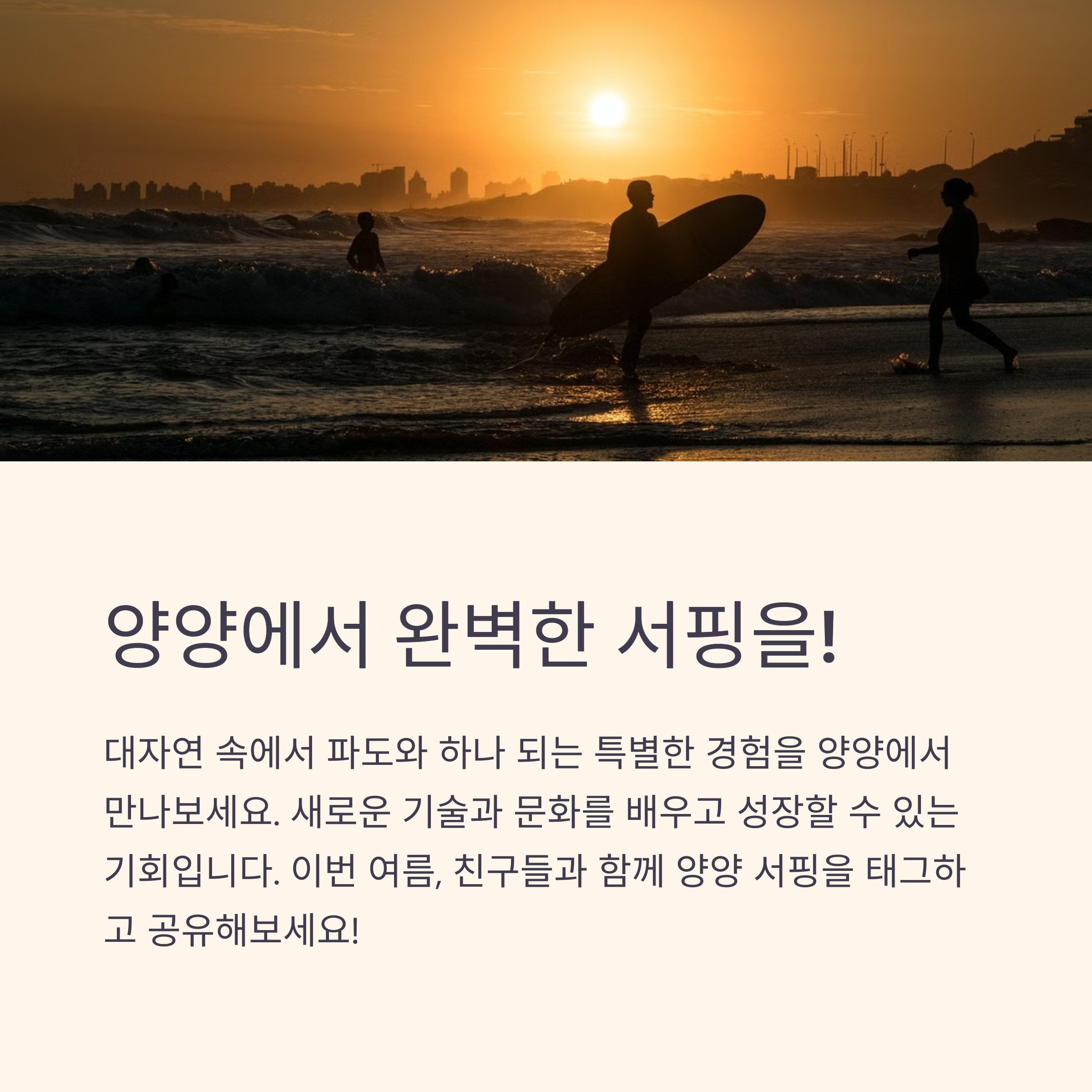 양양은 단순한 해변 여행지가 아니라, 서핑이라는 액티비티를 통해 몸과 마음을 자유롭게 풀어낼 수 있는 진정한 힐링 공간입니다. 장비가 없어도, 경험이 없어도 괜찮아요. 올여름엔 파도를 타며 조금 더 생생한 삶의 순간을 느껴보세요. 강원도 양양, 지금 가장 서핑다운 서핑을 시작할 수 있는 곳입니다!
