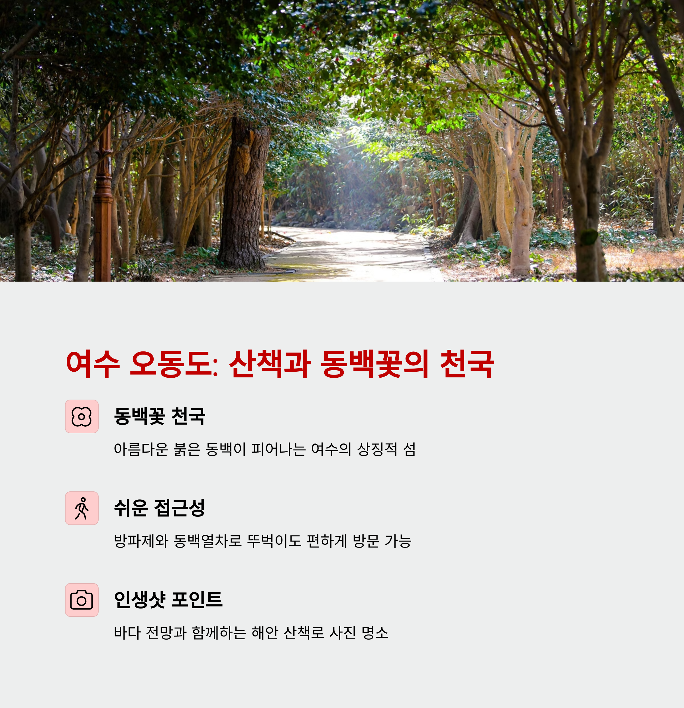 오동도는 여수의 대표적인 섬 명소로, 동백나무 산책길, 방파제, 등대, 동백열차 등 볼거리와 뚜벅이 여행객도 무리 없이 도보 이동이 가능한 코스입니다. 여수항 근처에서 도보로 접근이 가능하며, 도심과 바다를 동시에 즐길 수 있는 경관이 장점입니다.