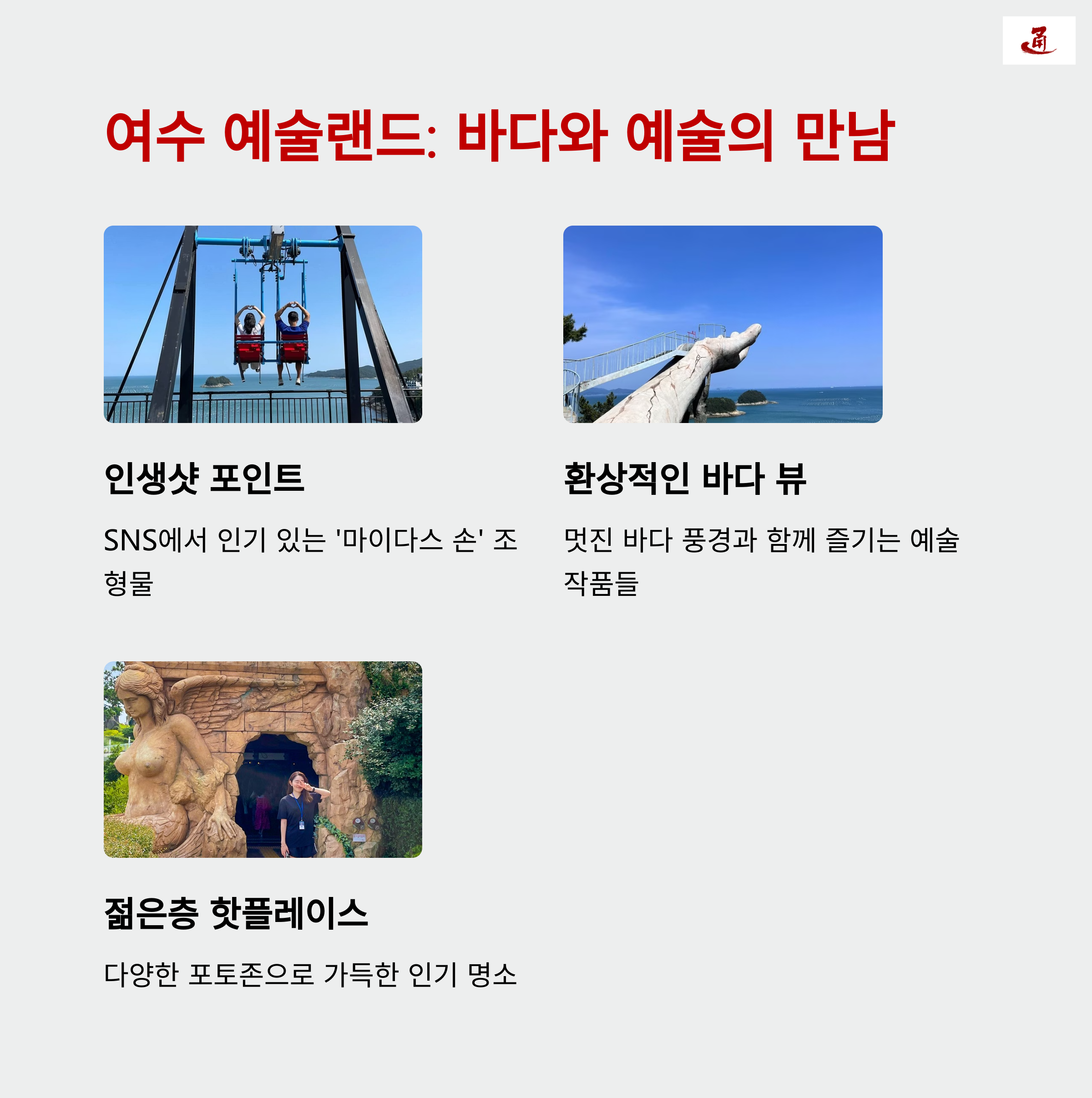 여수 예술랜드 조각공원은 택시 또는 시내버스를 통해 이동 가능하며, 전망 좋은 포토존과 다양한 조형물이 펼쳐진 감성 명소입니다. 여수 바다를 배경으로 한 스카이워크, 인피니티 포토존이 특히 인기며, 젊은 여행객과 커플 여행 코스로 추천됩니다.
