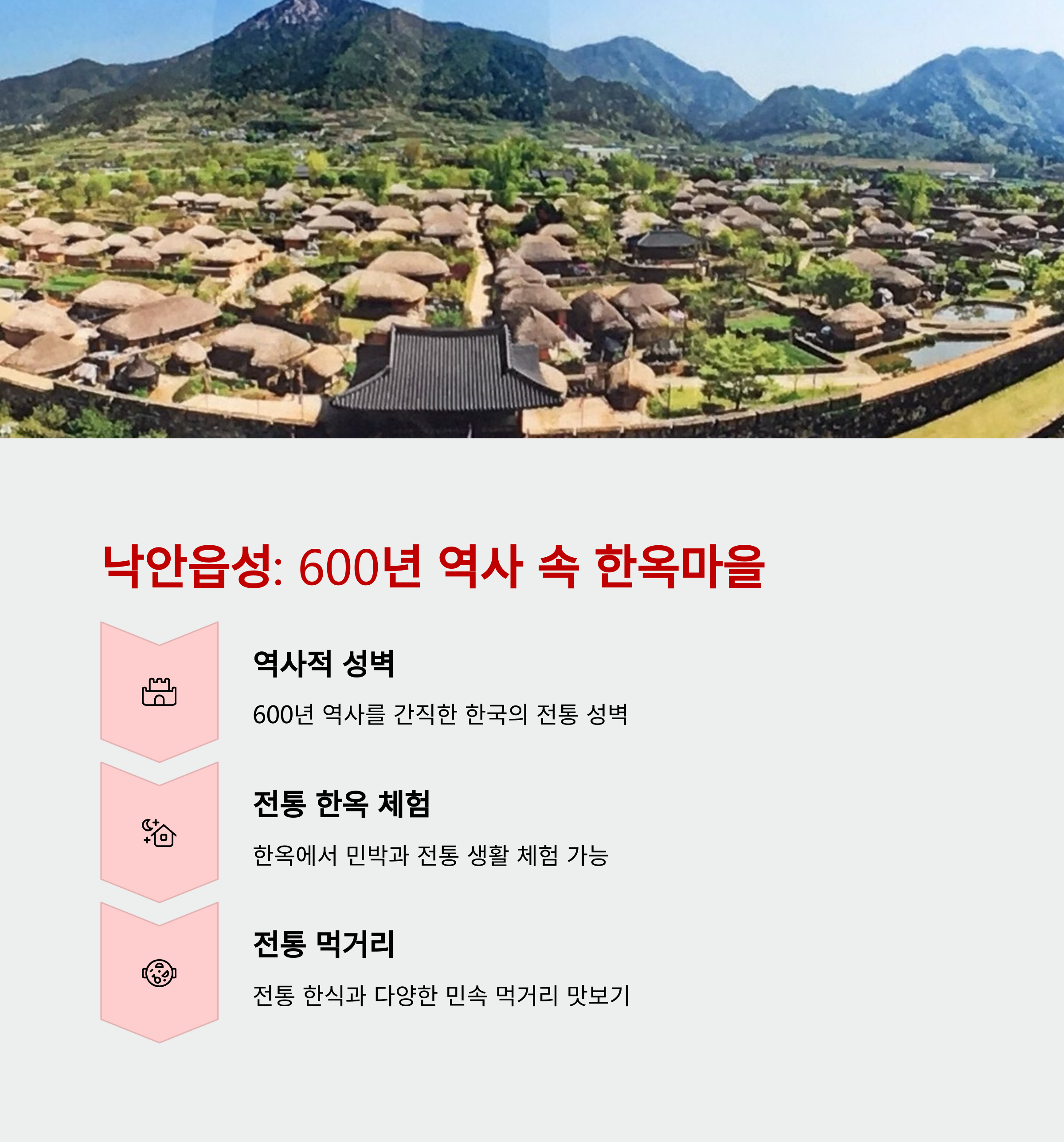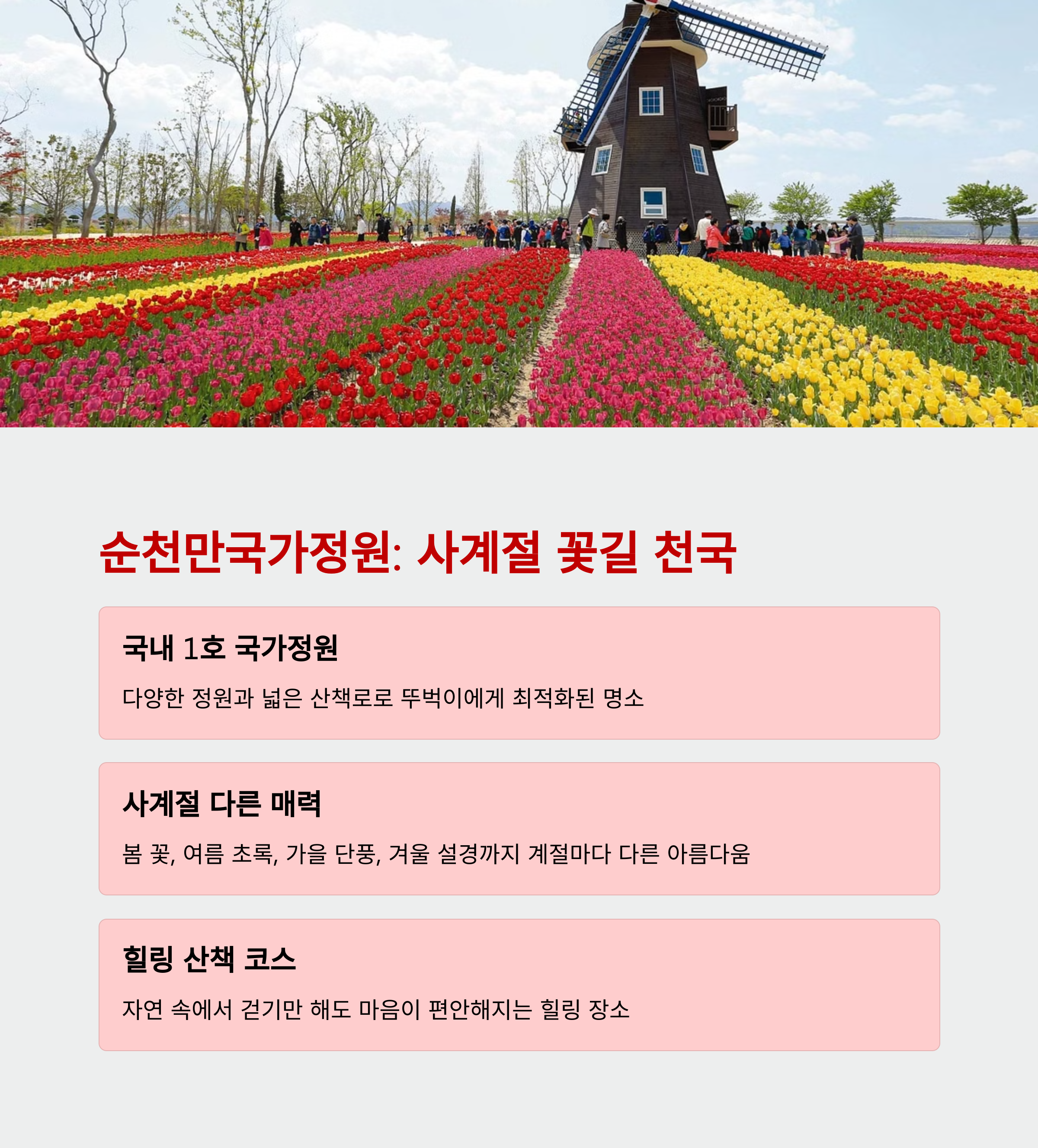 | 순천 추천 코스 | 순천만국가정원, 드라마 촬영장, 낙안읍성 민속마을 |