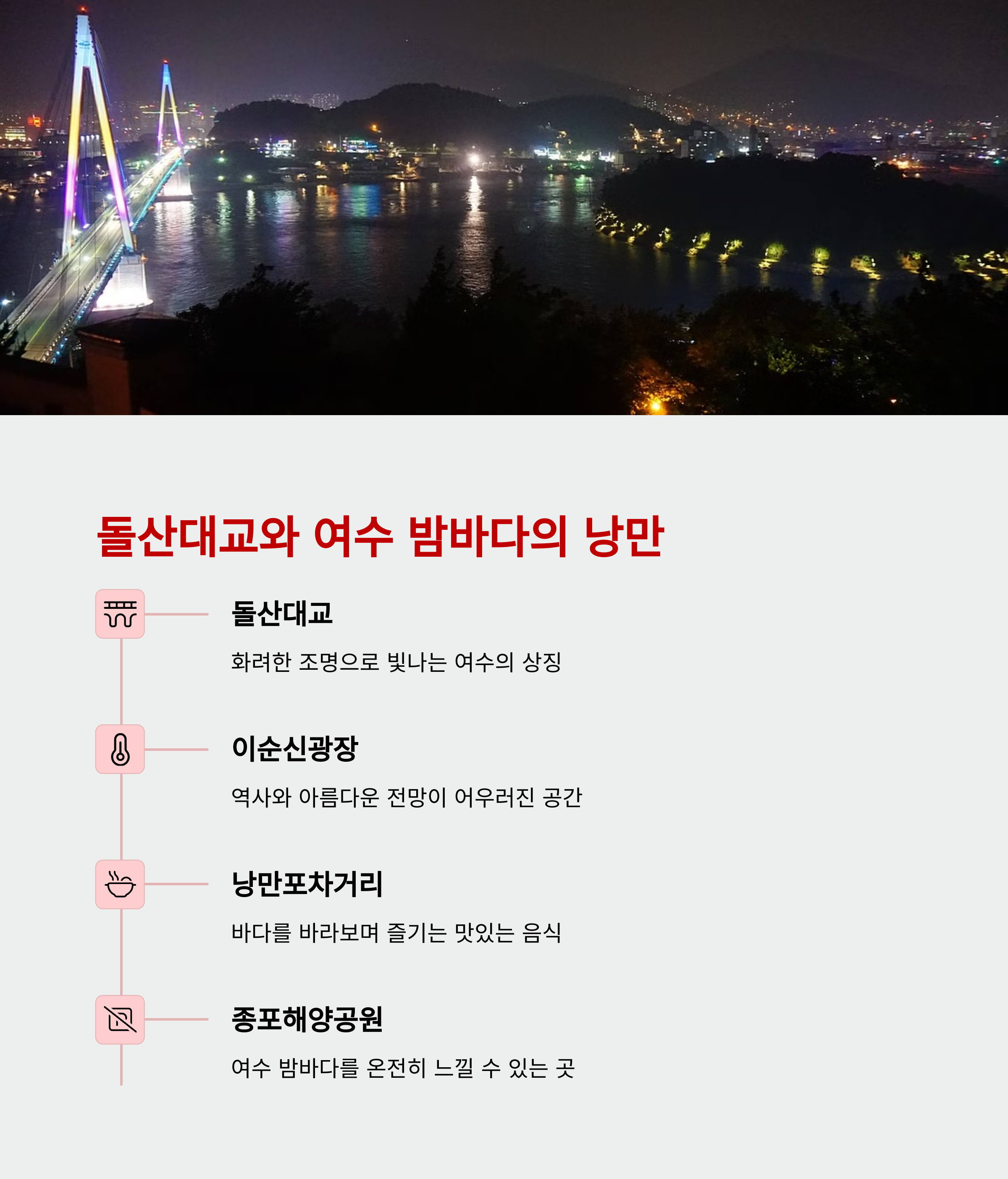 | 여수 추천 코스 | 오동도, 예술랜드 조각공원, 돌산대교·여수 밤바다 |