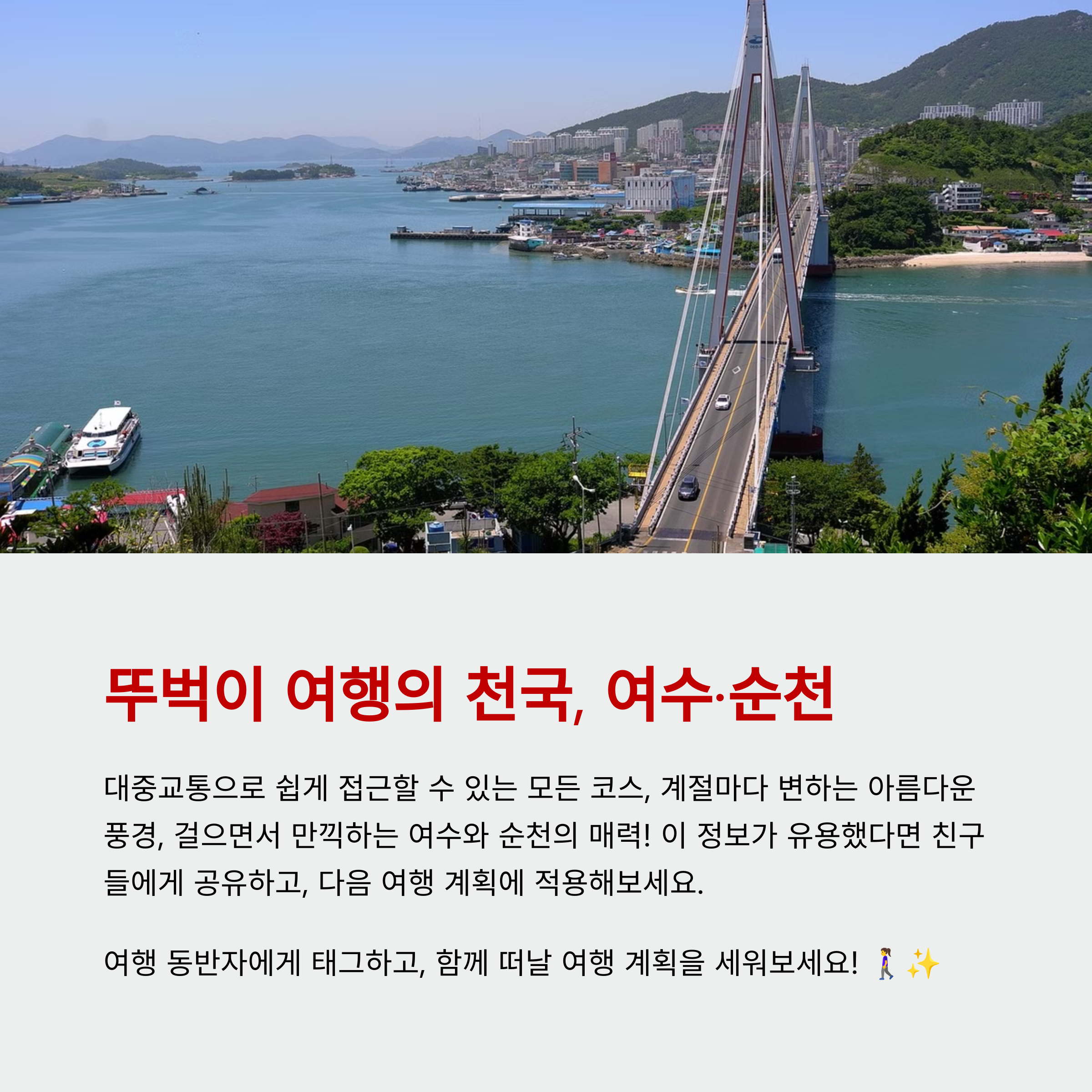 여수와 순천은 뚜벅이 여행자에게도 친절한 도시입니다. 대중교통과 도보만으로도 주요 명소를 충분히 즐길 수 있고, 바다와 자연, 역사와 문화까지 모두 갖춘 알찬 남도 여행지입니다. 이번 여행에서는 가볍게 걷고 깊게 느끼는 뚜벅이 코스로 새로운 남도의 매력을 발견해보세요.