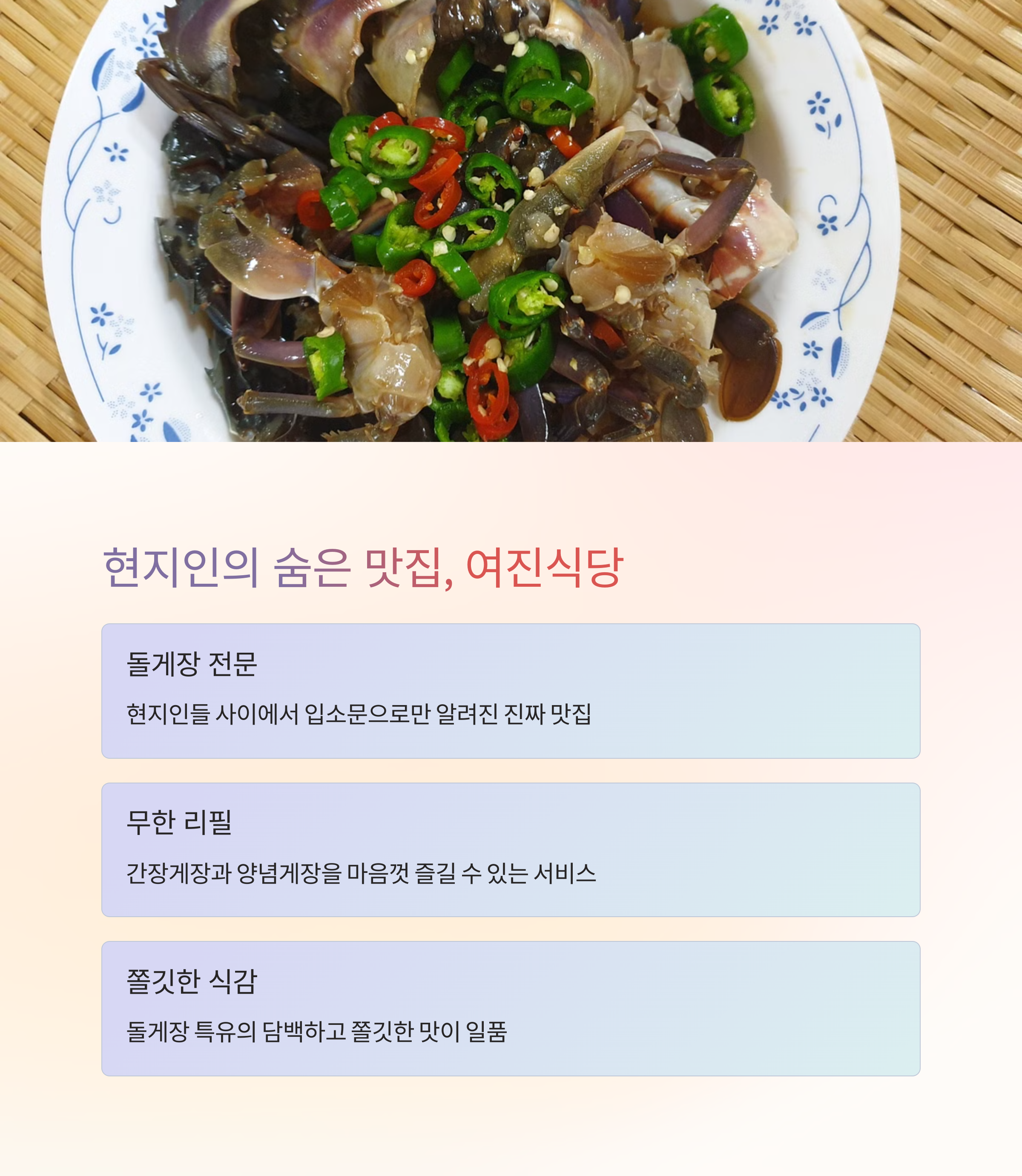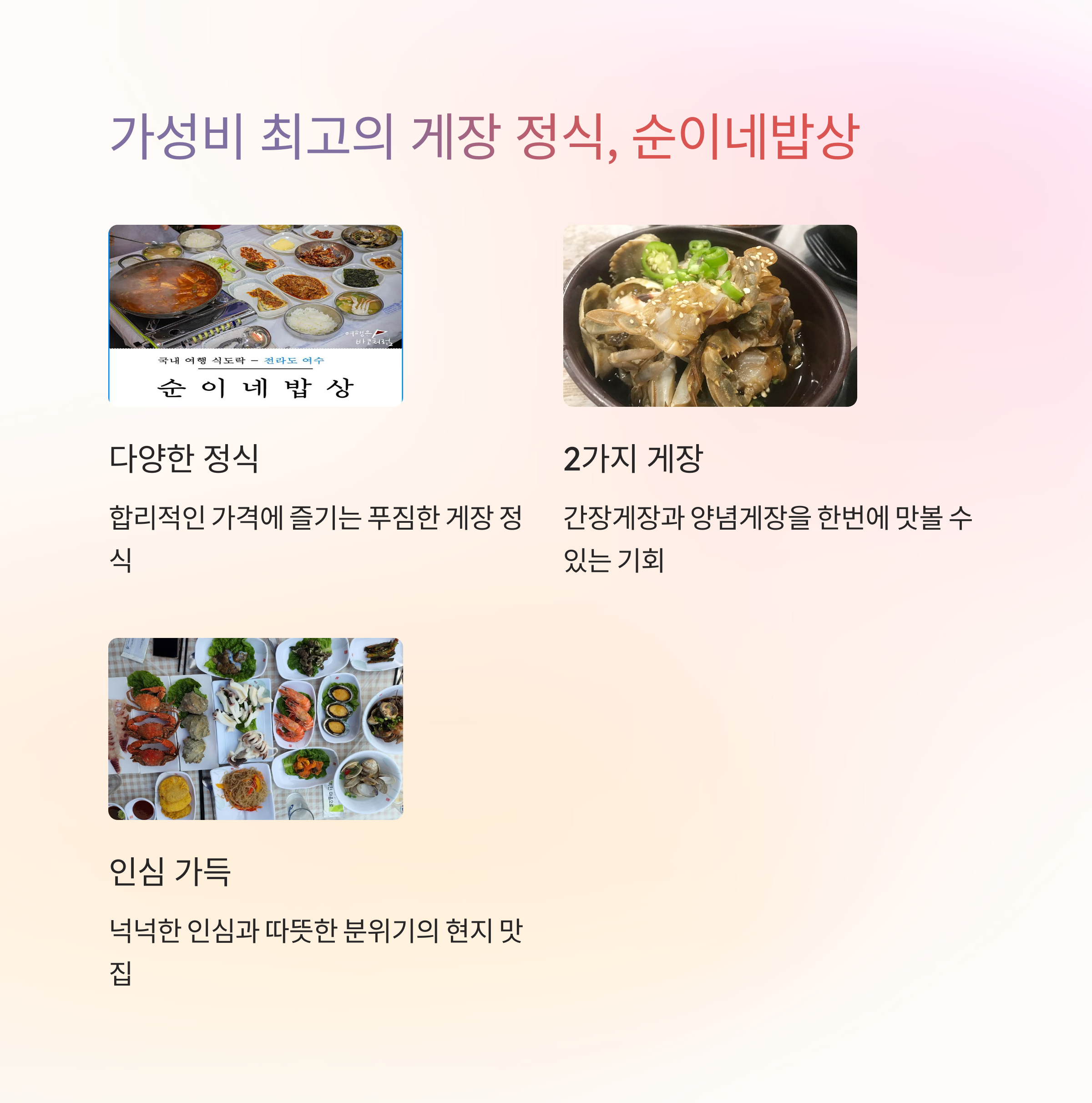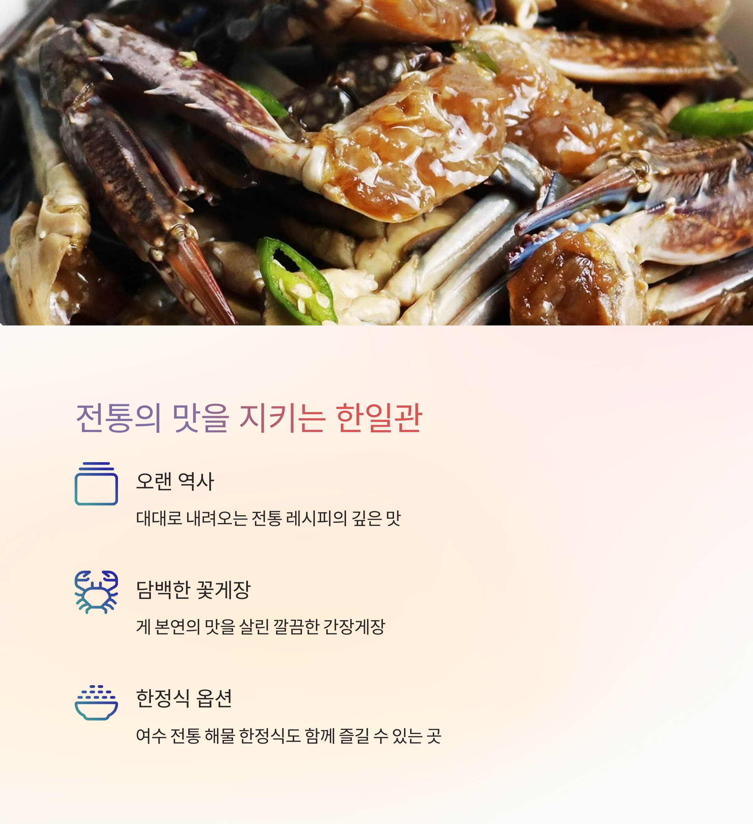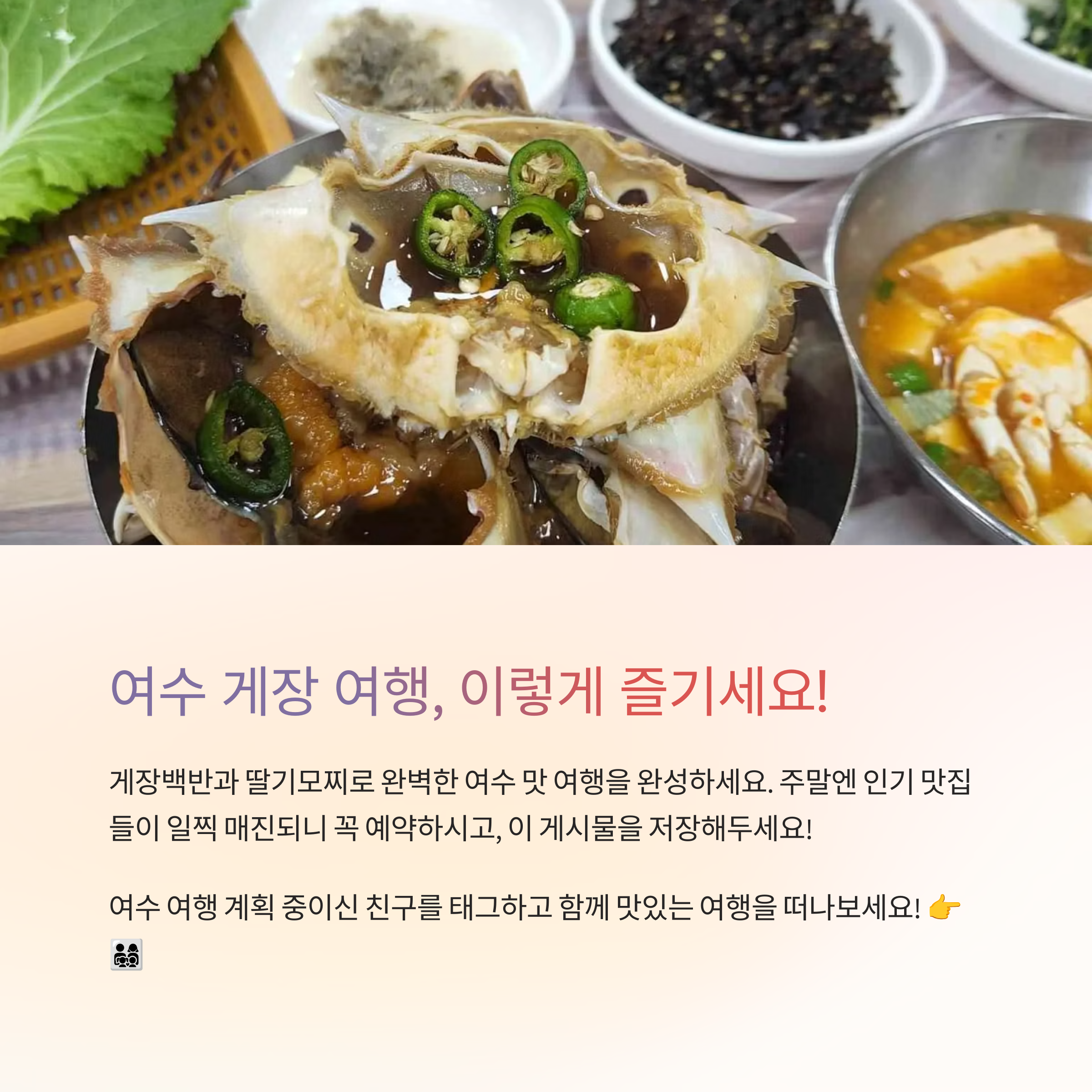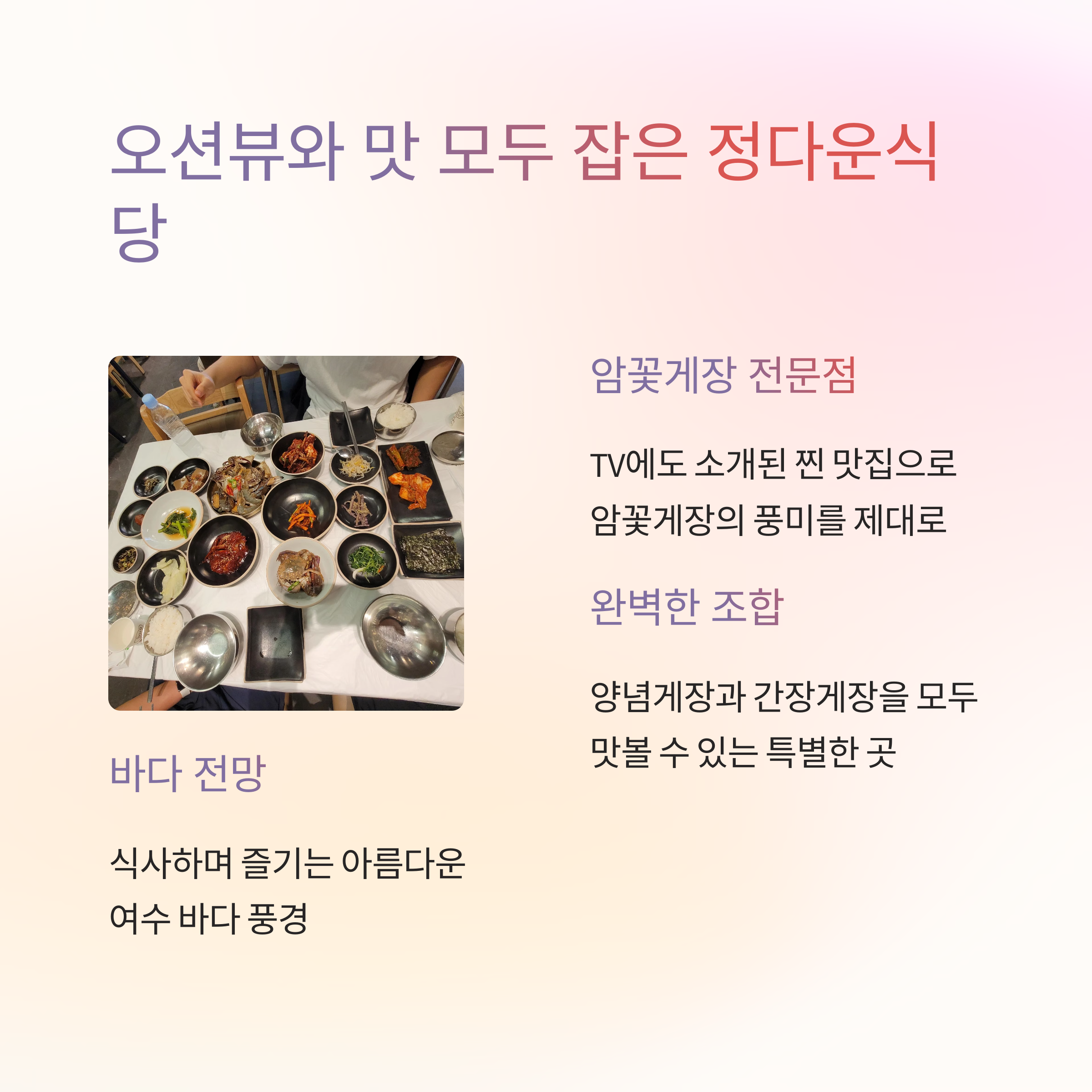 | 꽃게장, 양념게장까지 다양하게 구성 | 여수 감성을 담은 디저트 명소 | 현지인 추천 루트 중심으로 정리 |