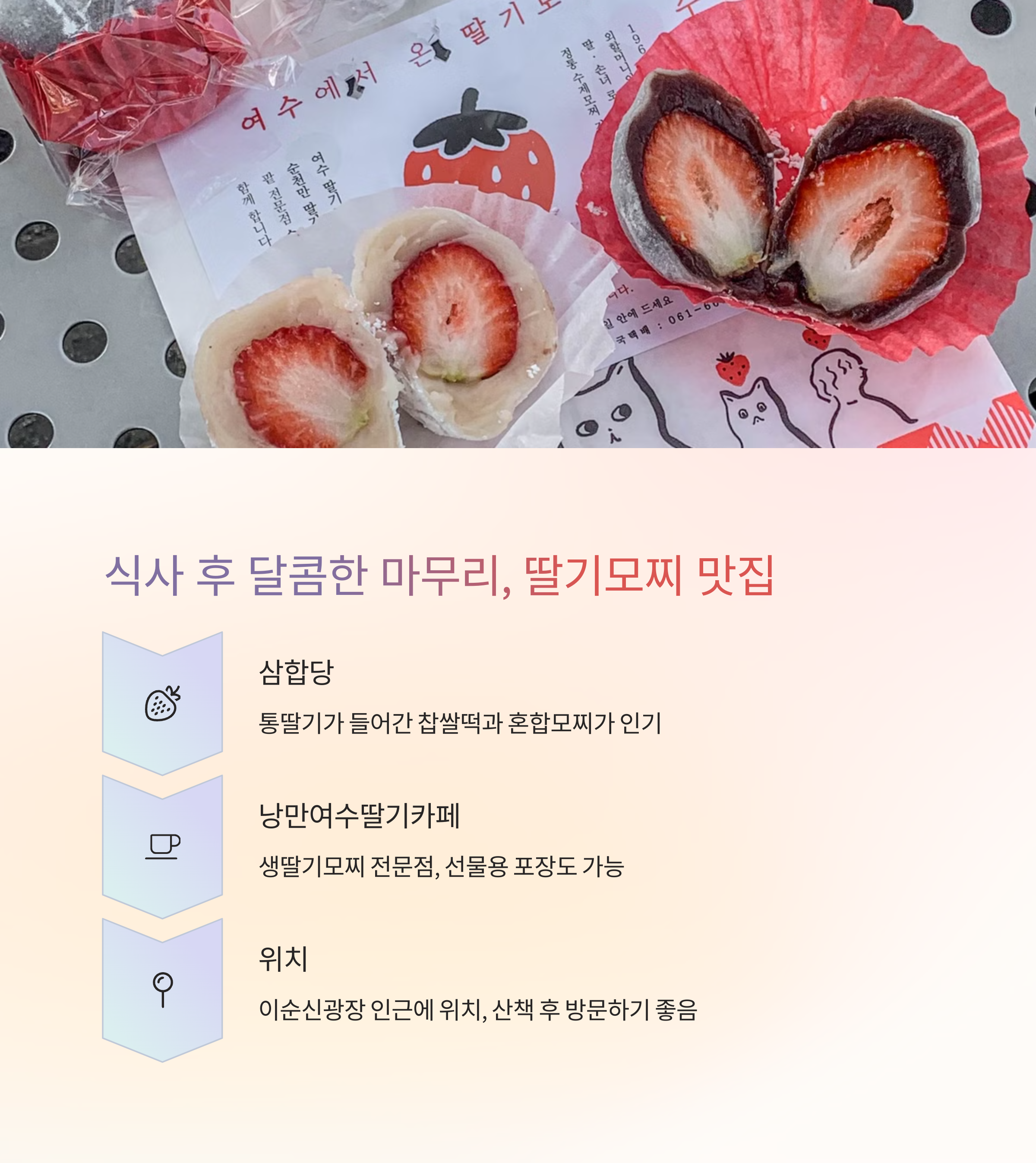 식사 후에는 이순신광장 근처로 이동해 딸기모찌 디저트 코스를 즐겨보세요. 삼합당에서는 통딸기 찹쌀떡과 혼합모찌를, 낭만여수딸기카페에서는 생딸기모찌와 포장 이벤트를 경험할 수 있습니다. 여수의 해산물과 딸기디저트는 환상적인 조합으로 여수 여행을 마무리하기에 딱입니다.