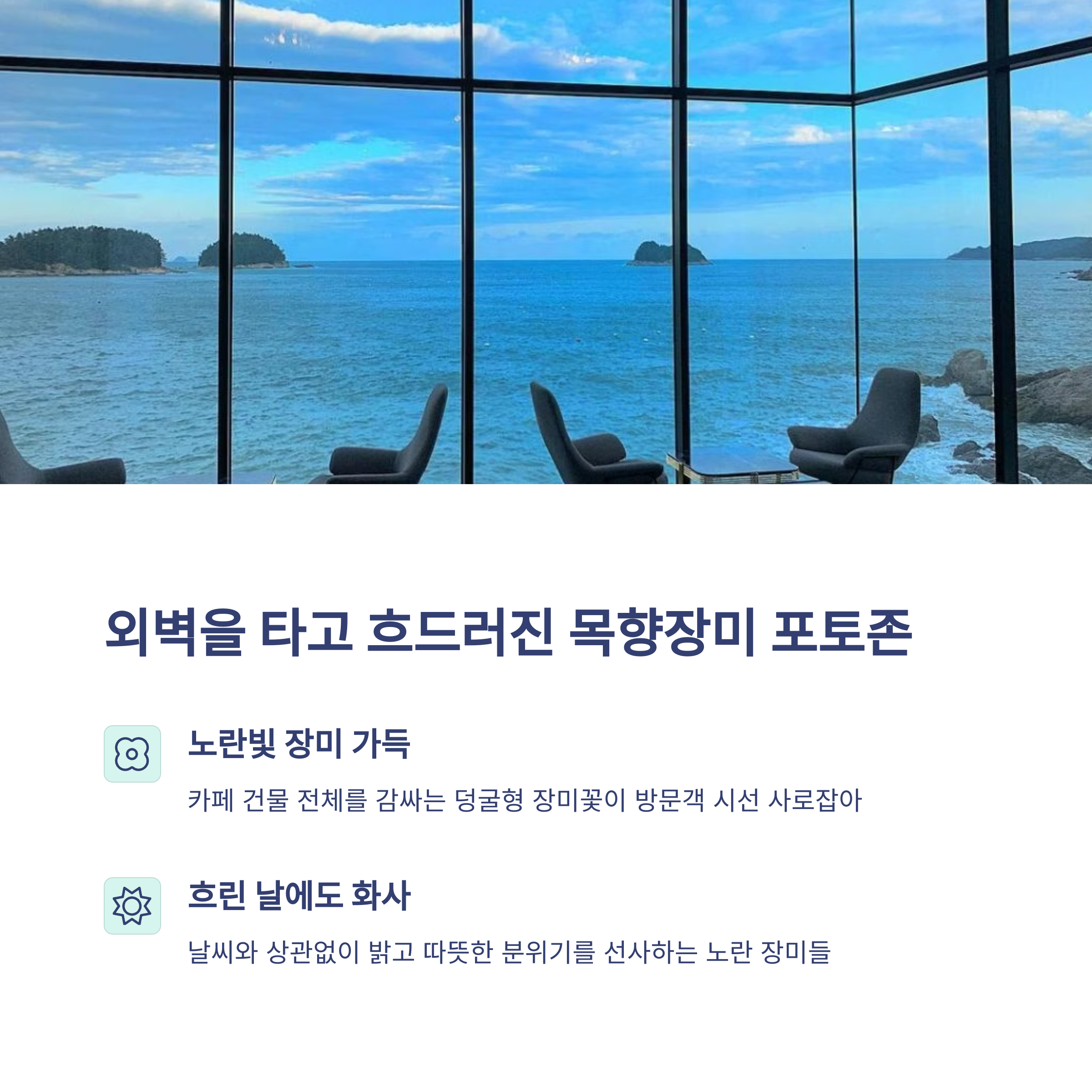 | 포인트 특징 | 목향장미 포토존, 경양식+카페 운영, 감성 인테리어, 바다 전망, 계절별 꽃 조경 |