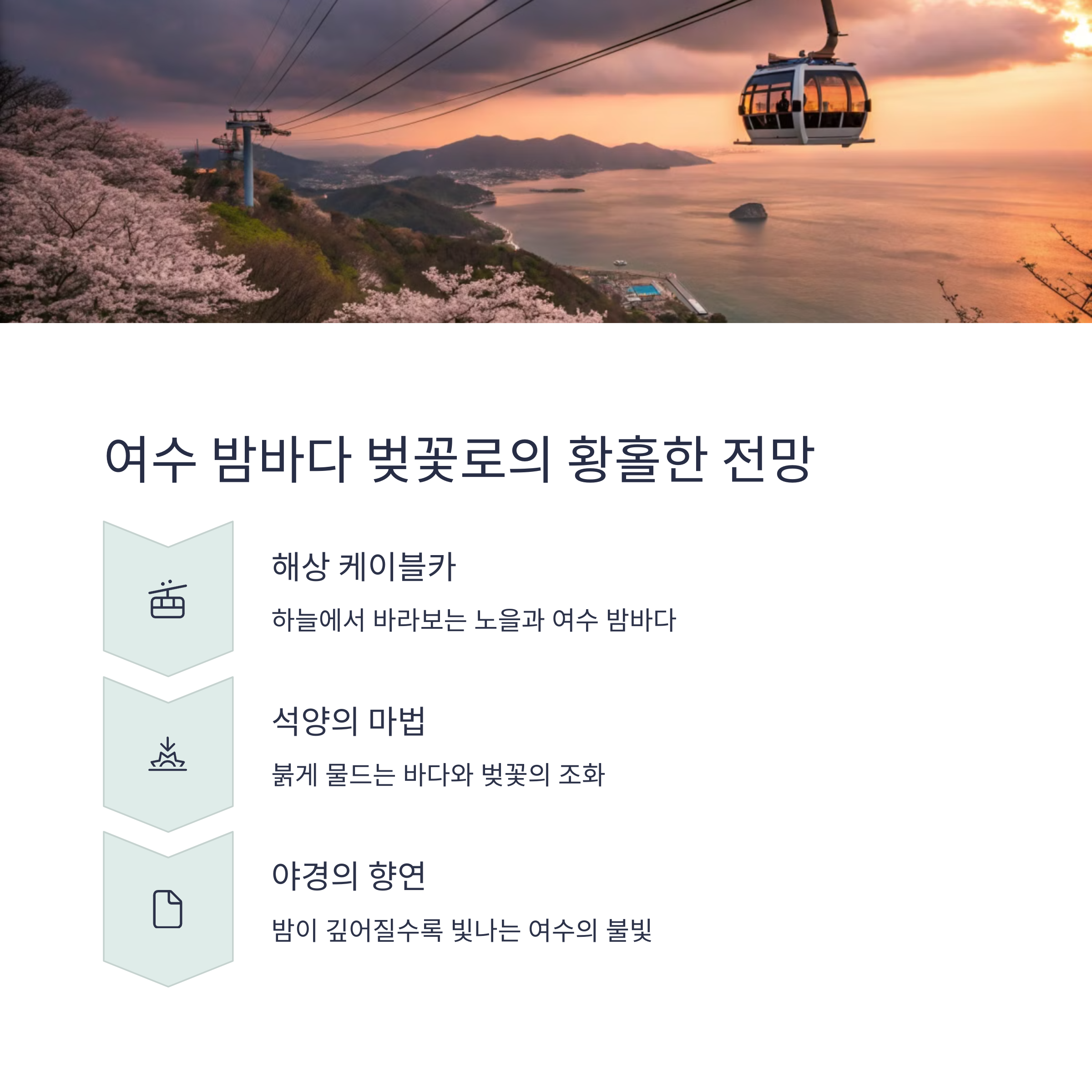 여수는 낮에는 벚꽃이 흐드러진 풍경을, 밤에는 아름다운 밤바다 야경을 함께 즐길 수 있는 최고의 여행지입니다. 봄이면 벚꽃이 만개한 도로와 공원을 따라 걷는 것만으로도 낭만적인 기분을 느낄 수 있습니다. 특히 봉황 자연휴양림과 승월마을은 벚꽃길이 조성되어 있어 드라이브 코스로도 인기가 높습니다. 해질녘이 되면 해상 케이블카를 타고 노을과 함께 야경을 감상하는 것도 강력 추천합니다.