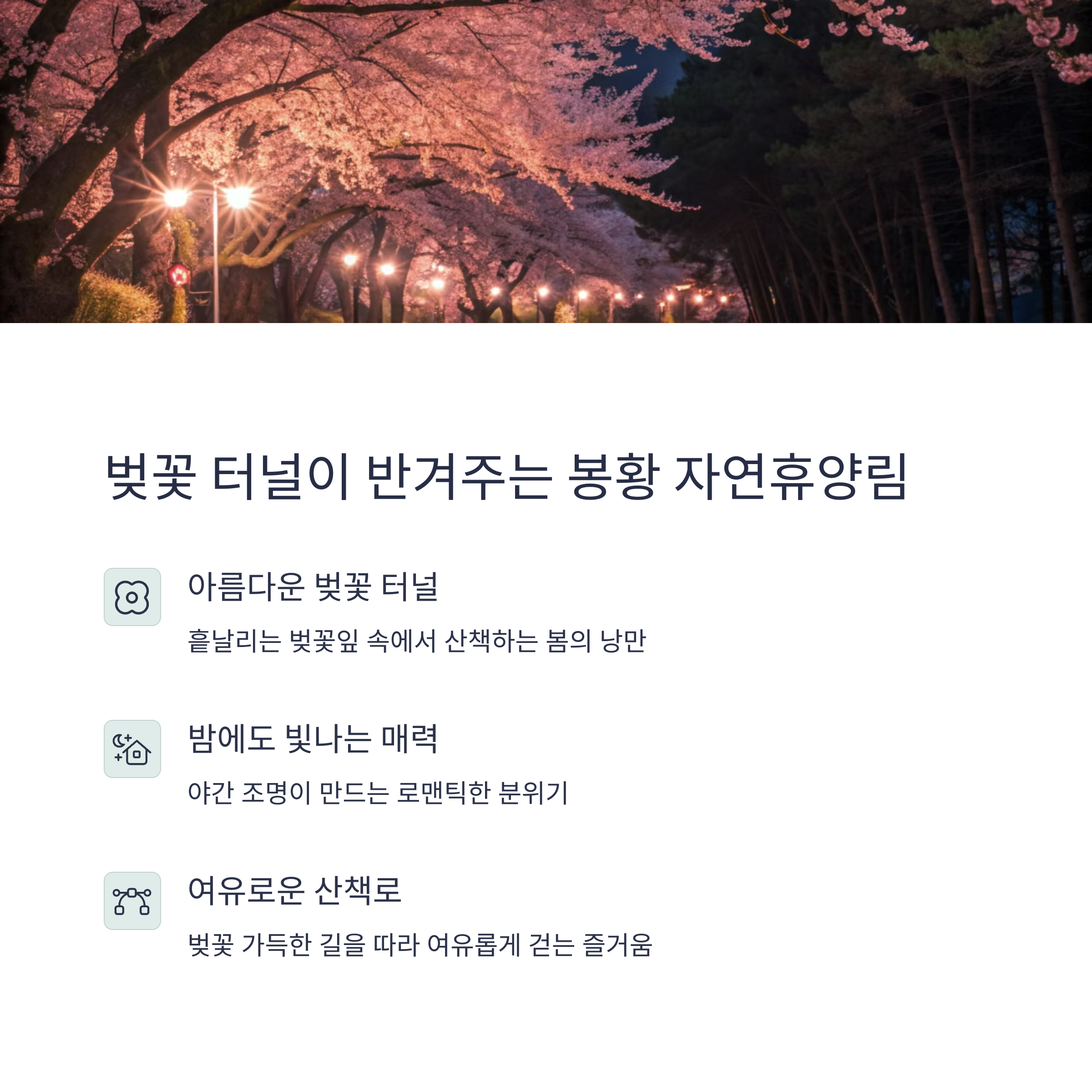 | 특징 | 벚꽃과 야경을 동시에 즐길 수 있는 낭만적인 여행지 |