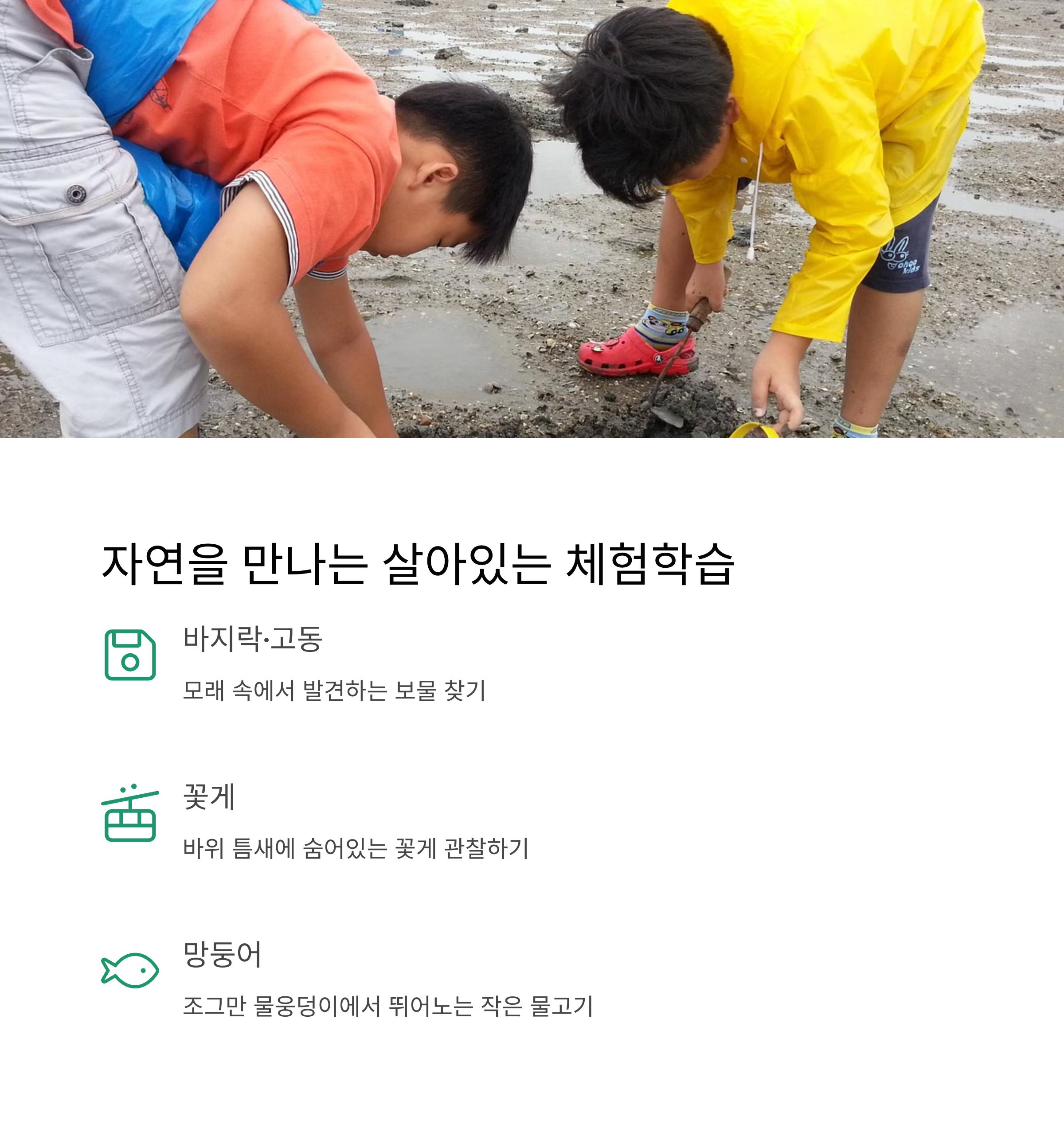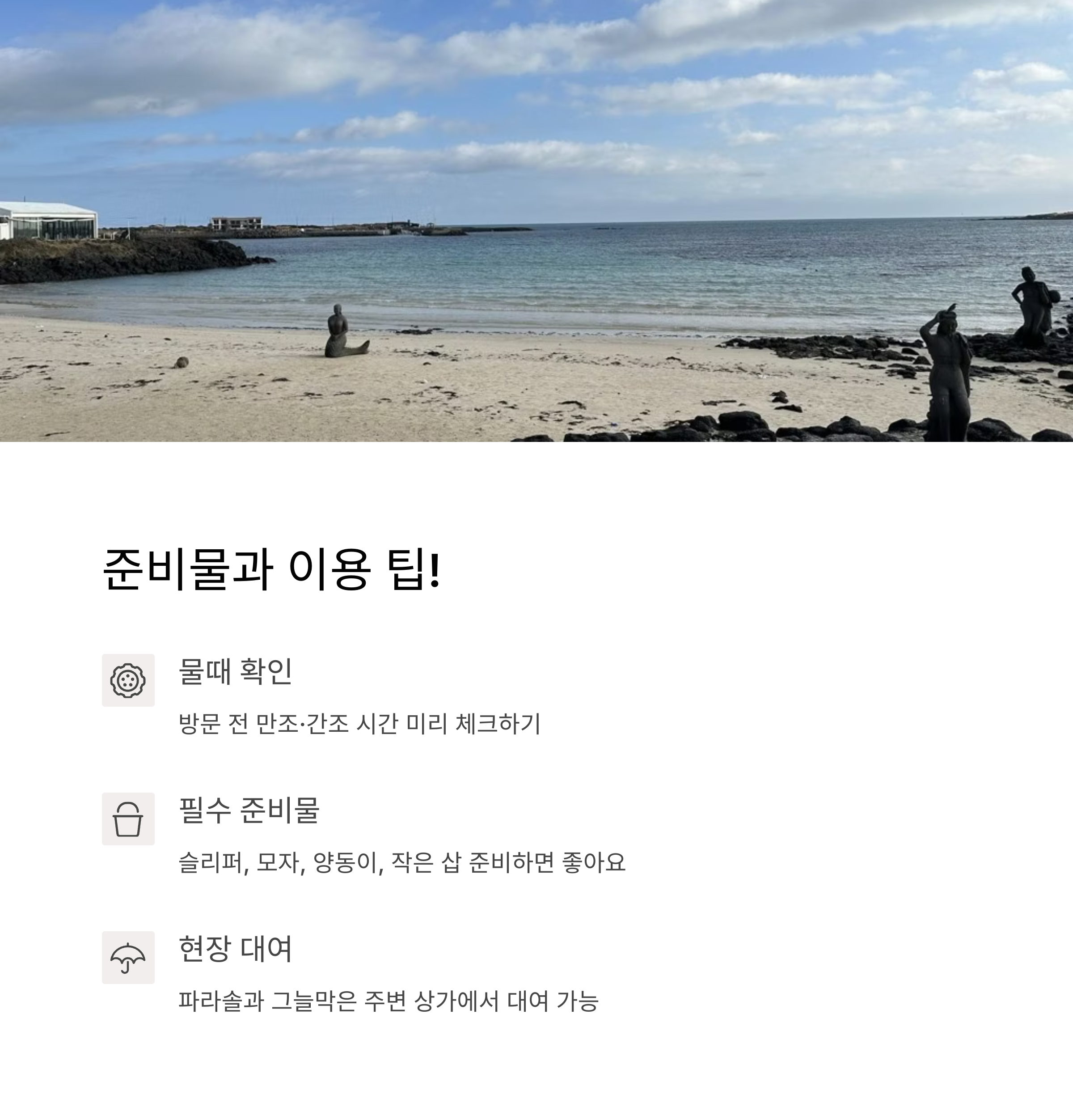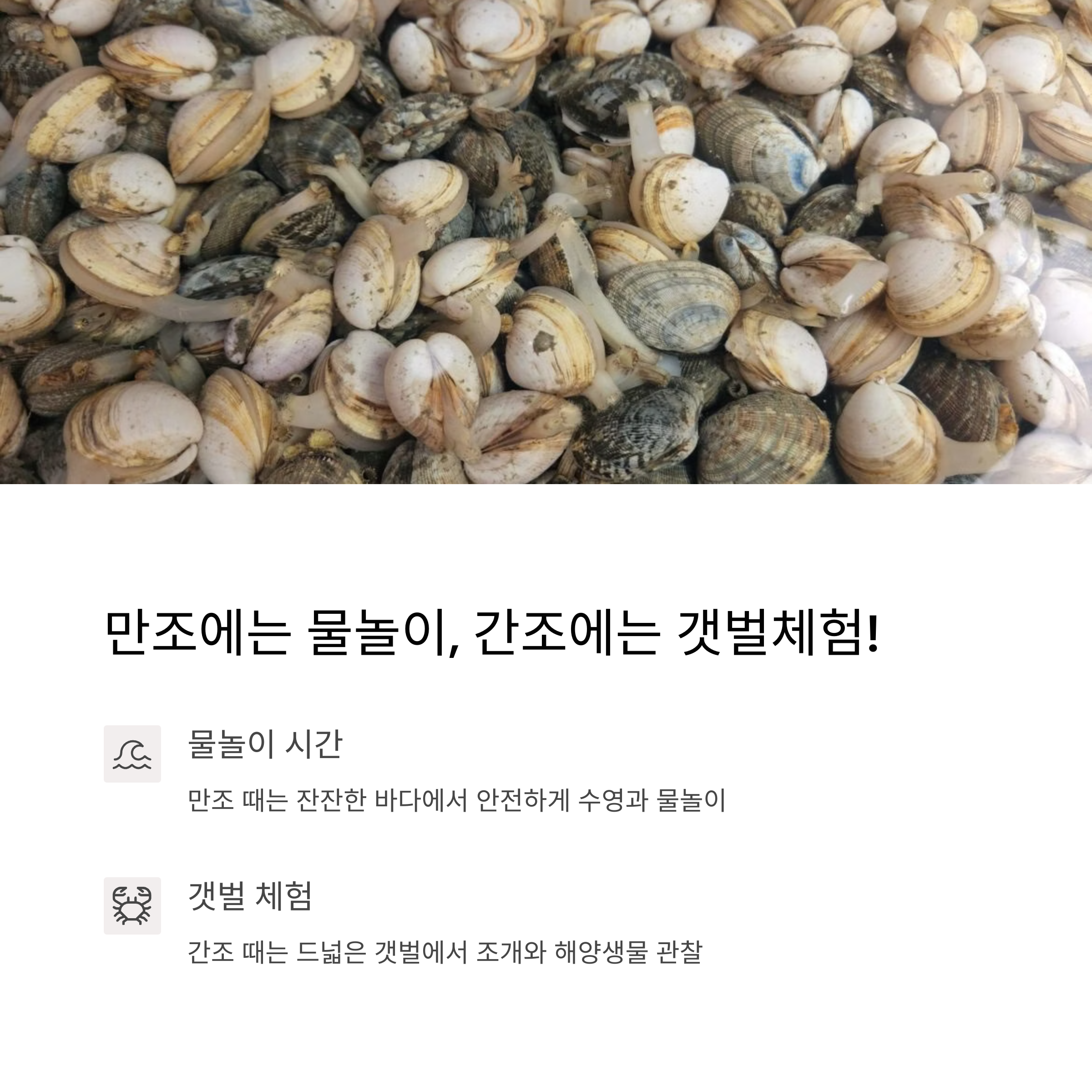 | 준비물 TIP | 모자, 슬리퍼, 여벌옷, 양동이, 물때 체크 필수 |