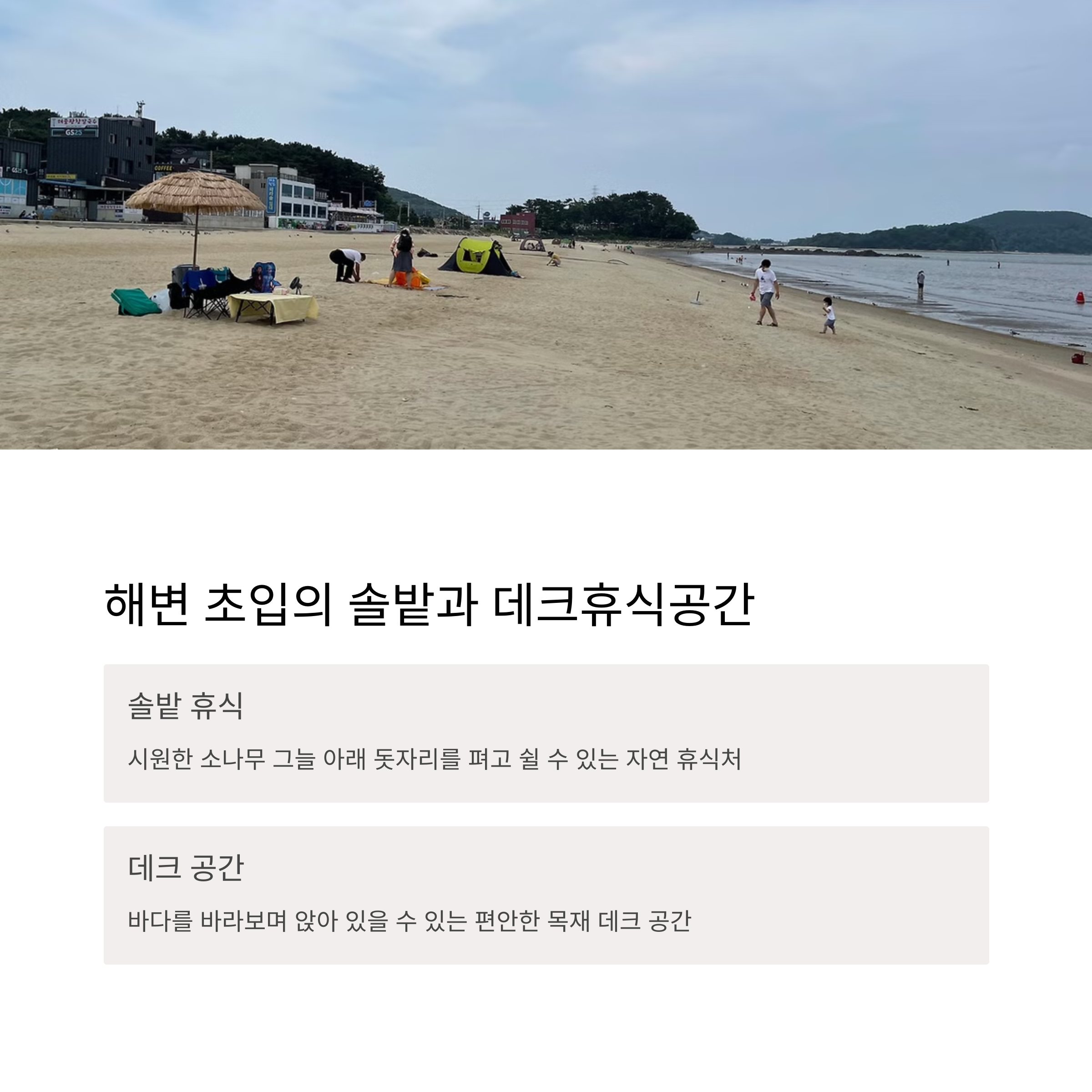 해변 초입에는 솔밭과 나무 데크존이 있어 그늘 아래 돗자리를 펴고 쉴 수 있고, 파라솔 대여도 인근 상가에서 가능합니다. 샤워실과 화장실, 무료 주차장도 잘 마련되어 있어 가족 단위 방문객에게 만족도가 높은 장소입니다. 아침 일찍 도착하면 한적한 분위기 속에서 더 여유롭게 시간을 보낼 수 있어요.