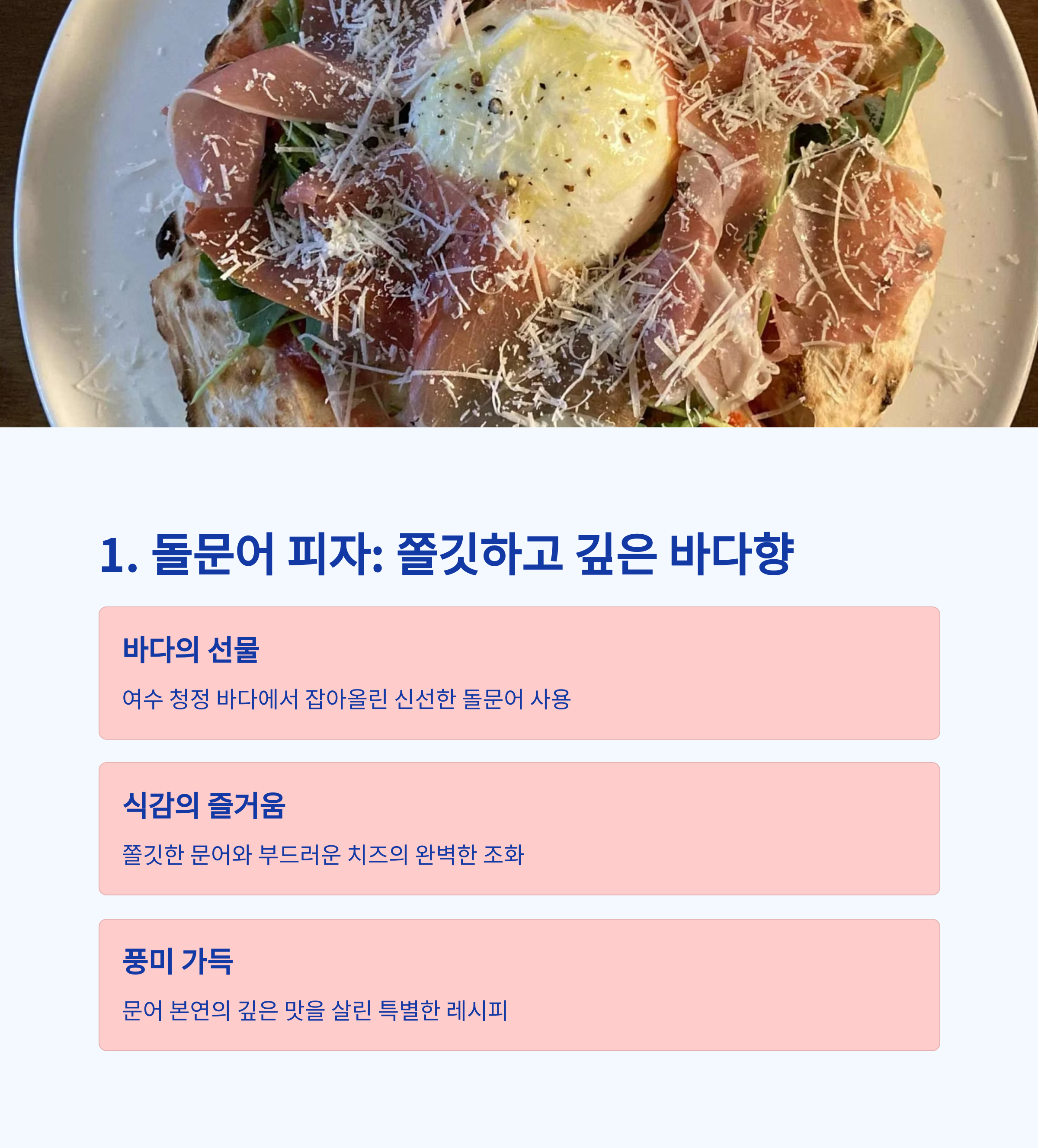 | 시그니처 메뉴 | 돌문어 피자, 여수갓 피자, 바질관자 피자, 깻잎불고기 피자 + 유자 생맥주 |