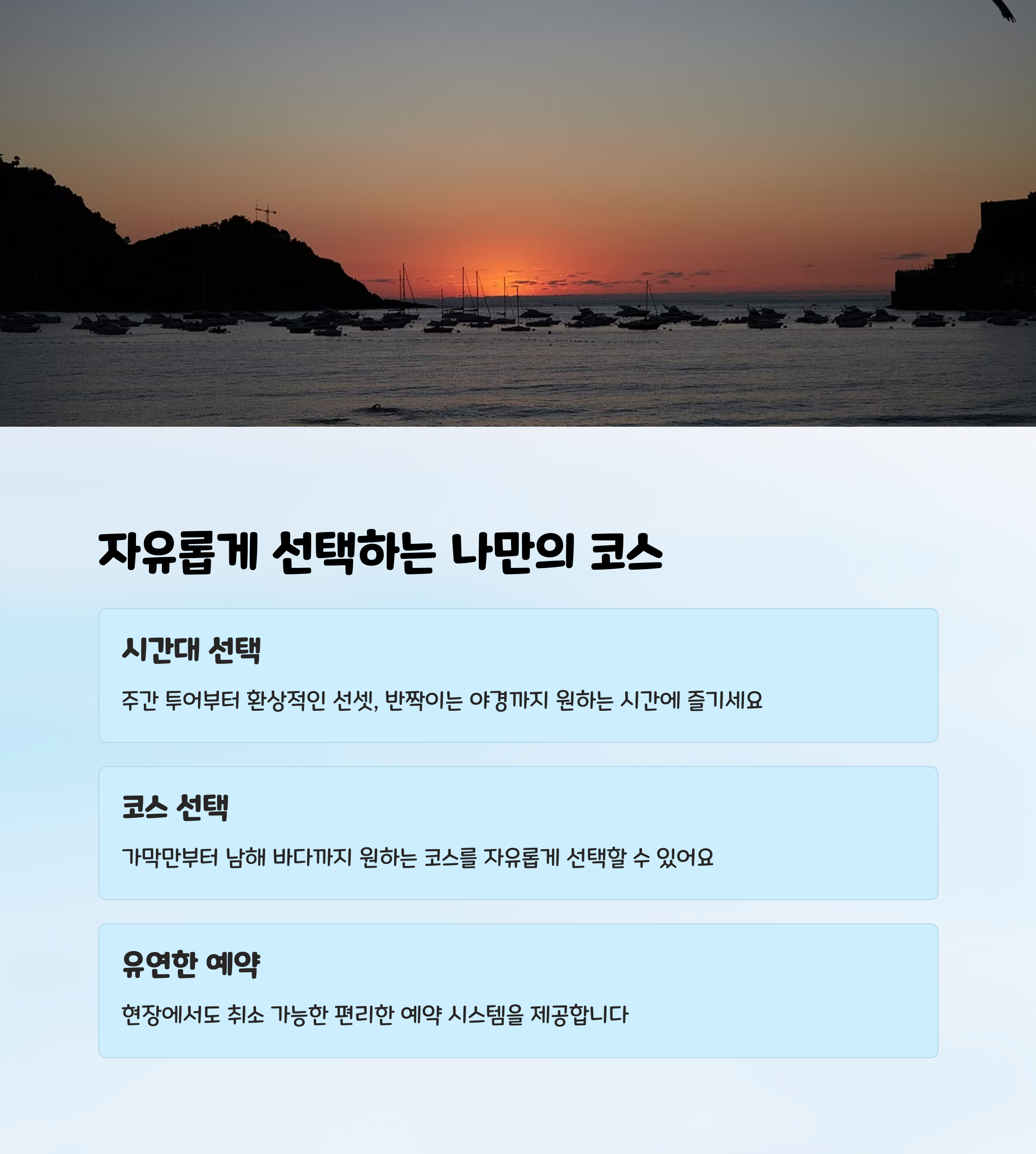 | MVG 요트투어 특징 | 프라이빗한 분위기, 시간대·코스 선택, 이벤트 가능 |