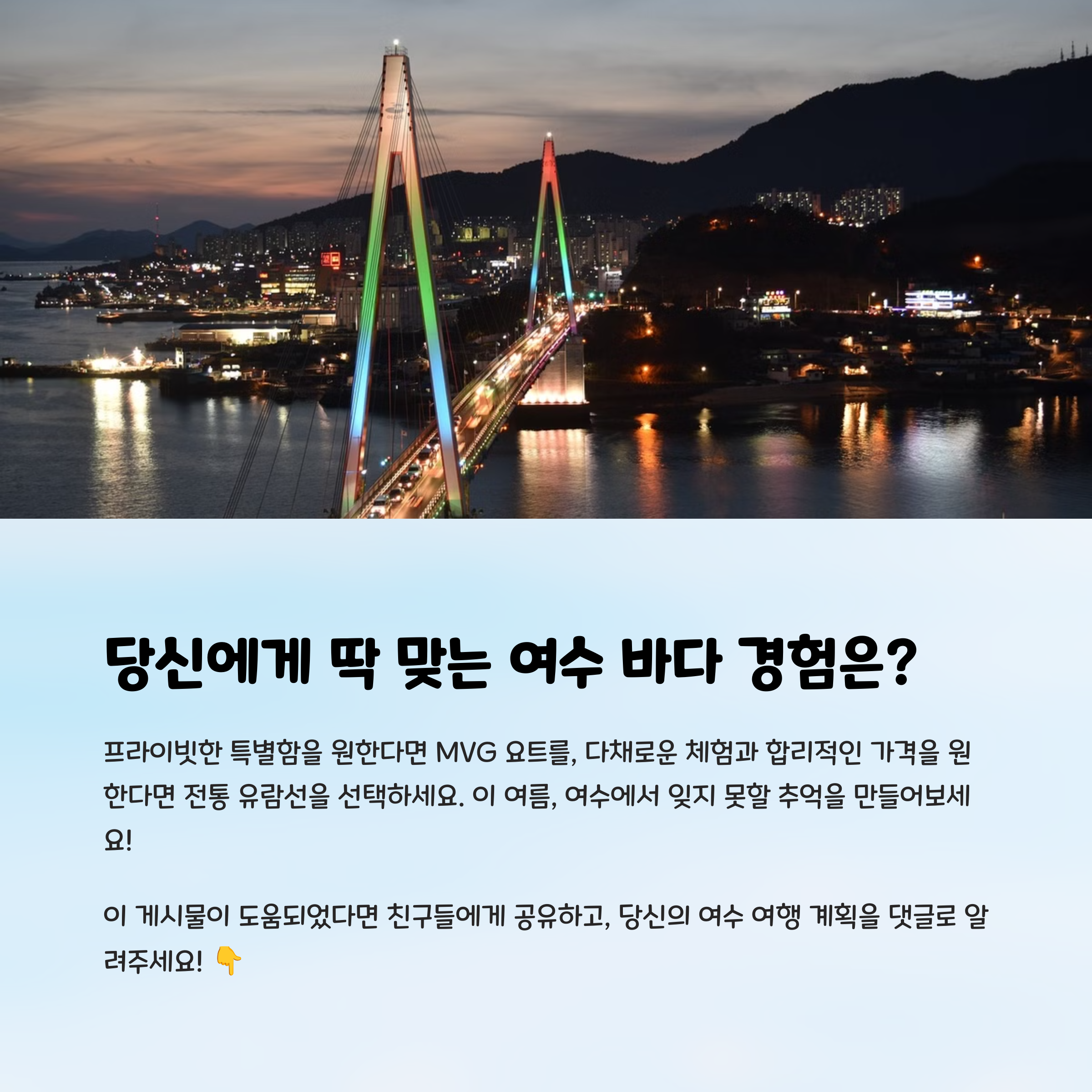 여행 스타일에 따라 선택 기준이 명확한 두 투어는 각자의 장점이 뚜렷합니다. 특별한 날, 조용하고 감성적인 바다를 느끼고 싶다면 MVG 요트투어, 여러 명이 함께, 다양한 해양 콘텐츠를 즐기고 싶다면 전통 유람선이 더욱 어울립니다. 가격대, 체험 요소, 분위기, 탑승 인원 등을 고려해 여수 바다를 나만의 방식으로 즐겨보세요!