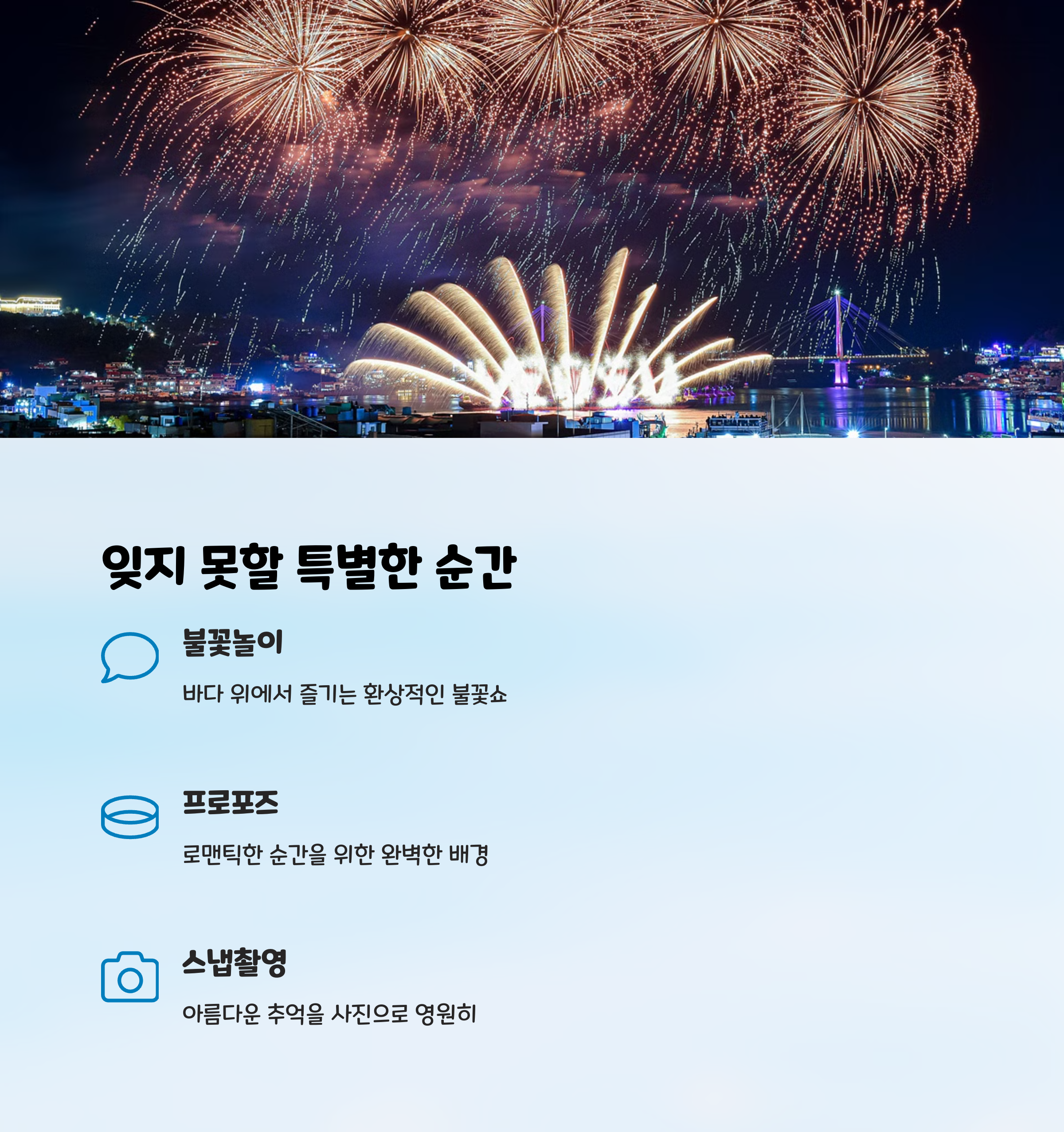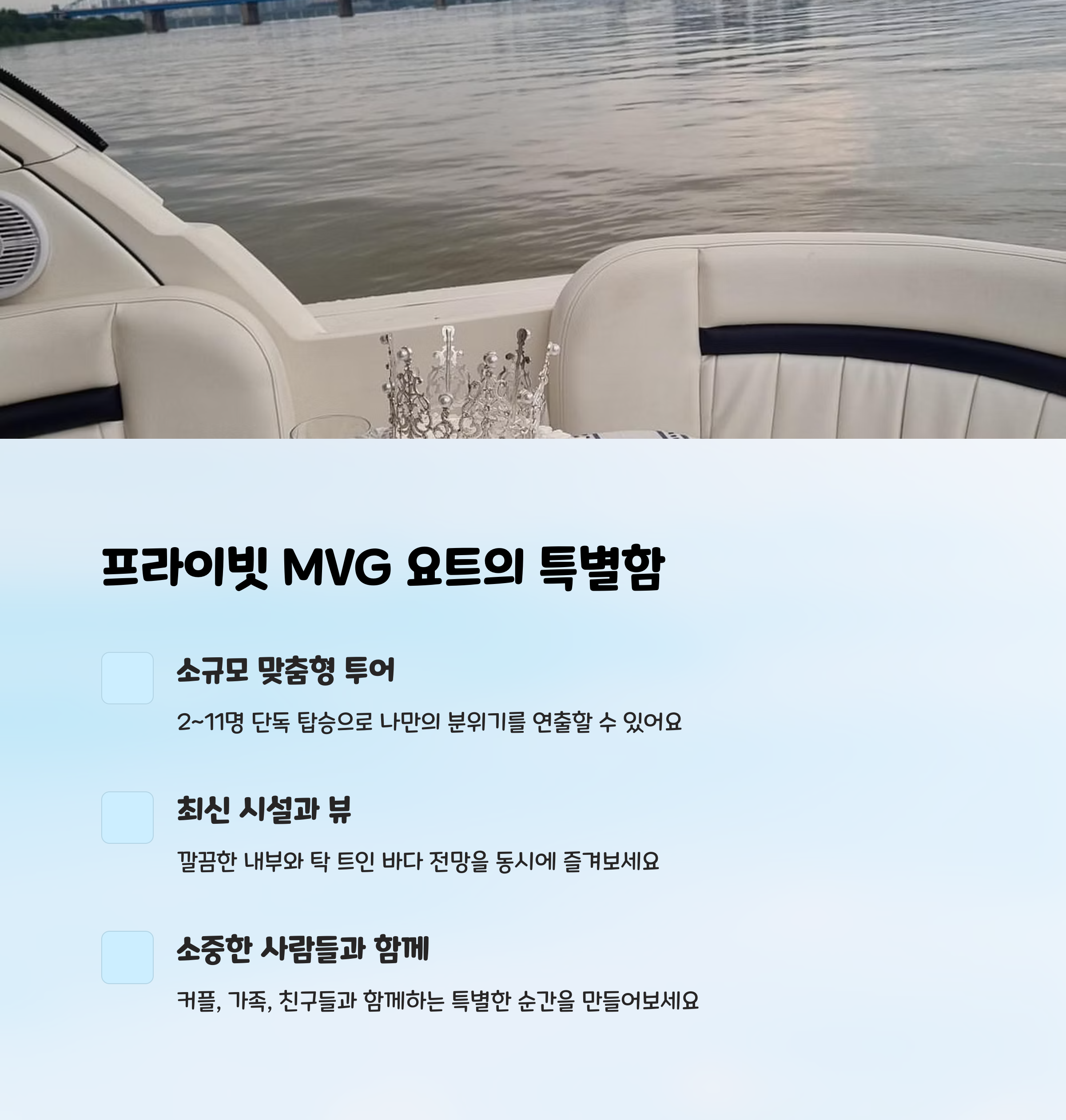 | MVG 요트투어 특징 | 프라이빗한 분위기, 시간대·코스 선택, 이벤트 가능 |