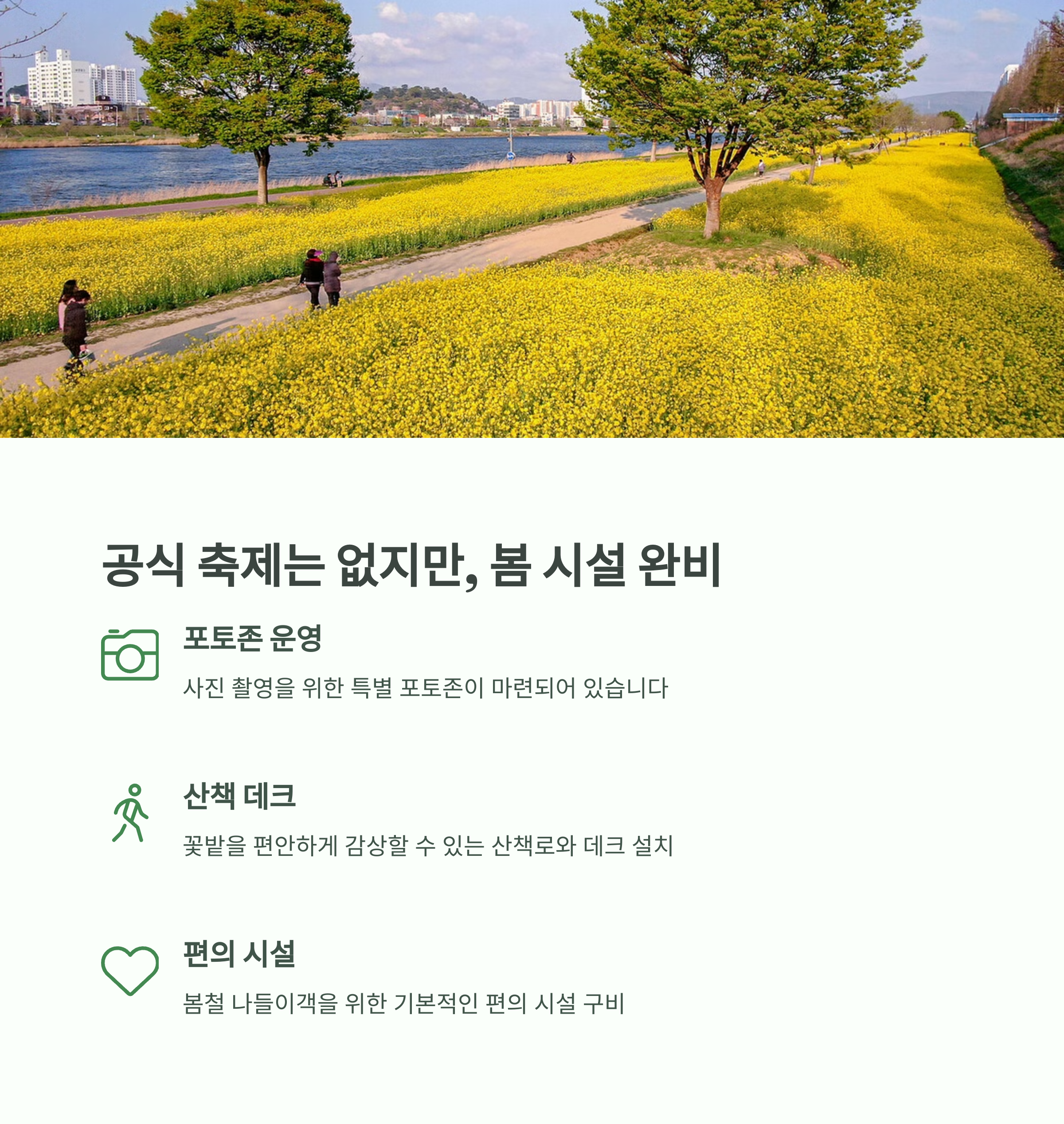 유채꽃밭은 규모가 워낙 넓기 때문에, 방문객이 많아도 붐비지 않고 여유롭게 산책할 수 있습니다. 포토존과 간단한 데크가 마련되어 있어 커플, 가족 단위 나들이객에게 모두 추천되며, 돗자리를 깔고 봄바람을 맞으며 쉬기에도 좋습니다. 특히 오전 시간대엔 빛이 부드럽고 그림자도 적어 사진 찍기에 가장 적합하니 여유 있게 이른 시간에 방문하는 것을 추천드립니다.