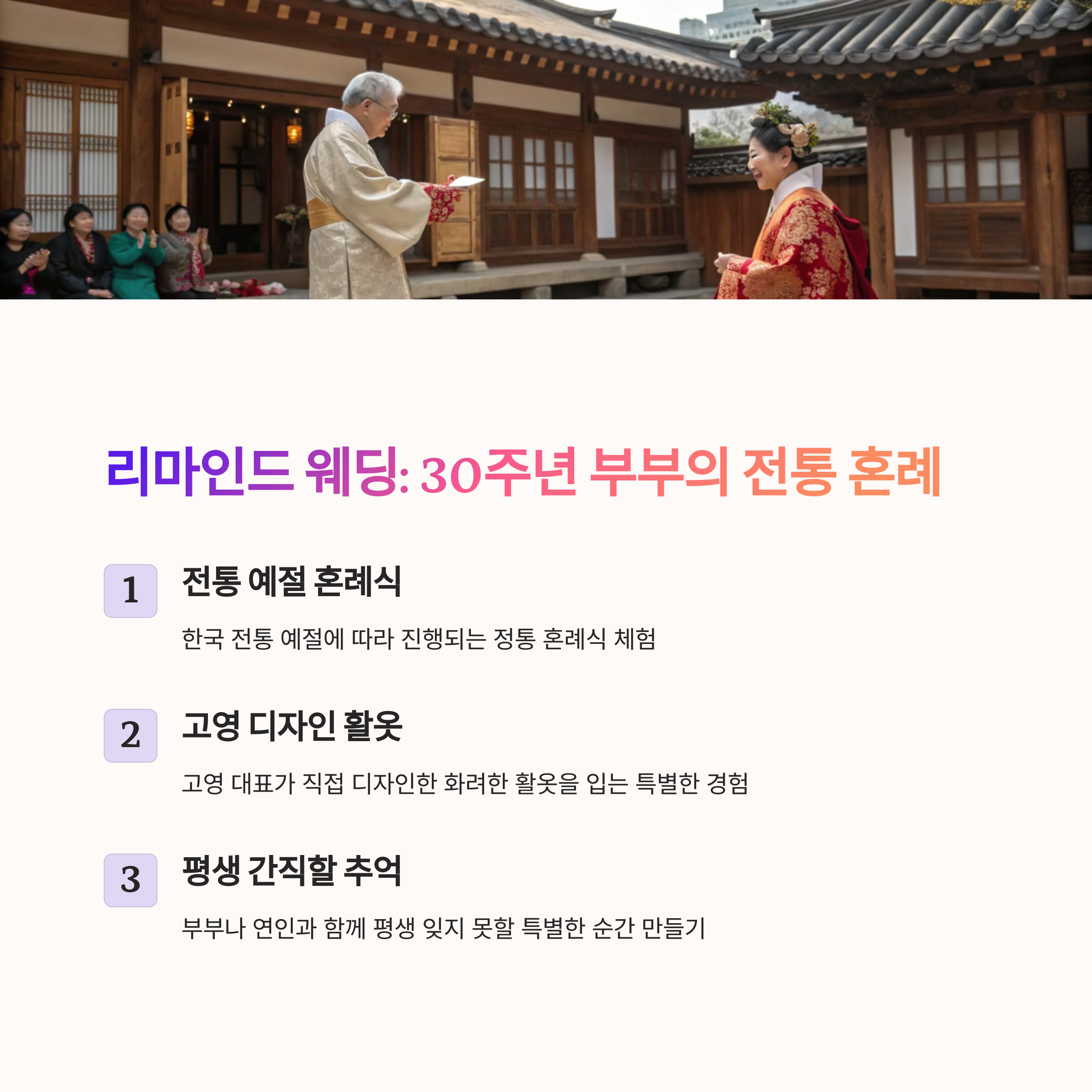 특히 리마인드 웨딩을 계획하는 부부들에게도 특별한 추억이 될 수 있는 체험이니, 이색적인 경험을 원하신다면 꼭 참여해 보세요!
