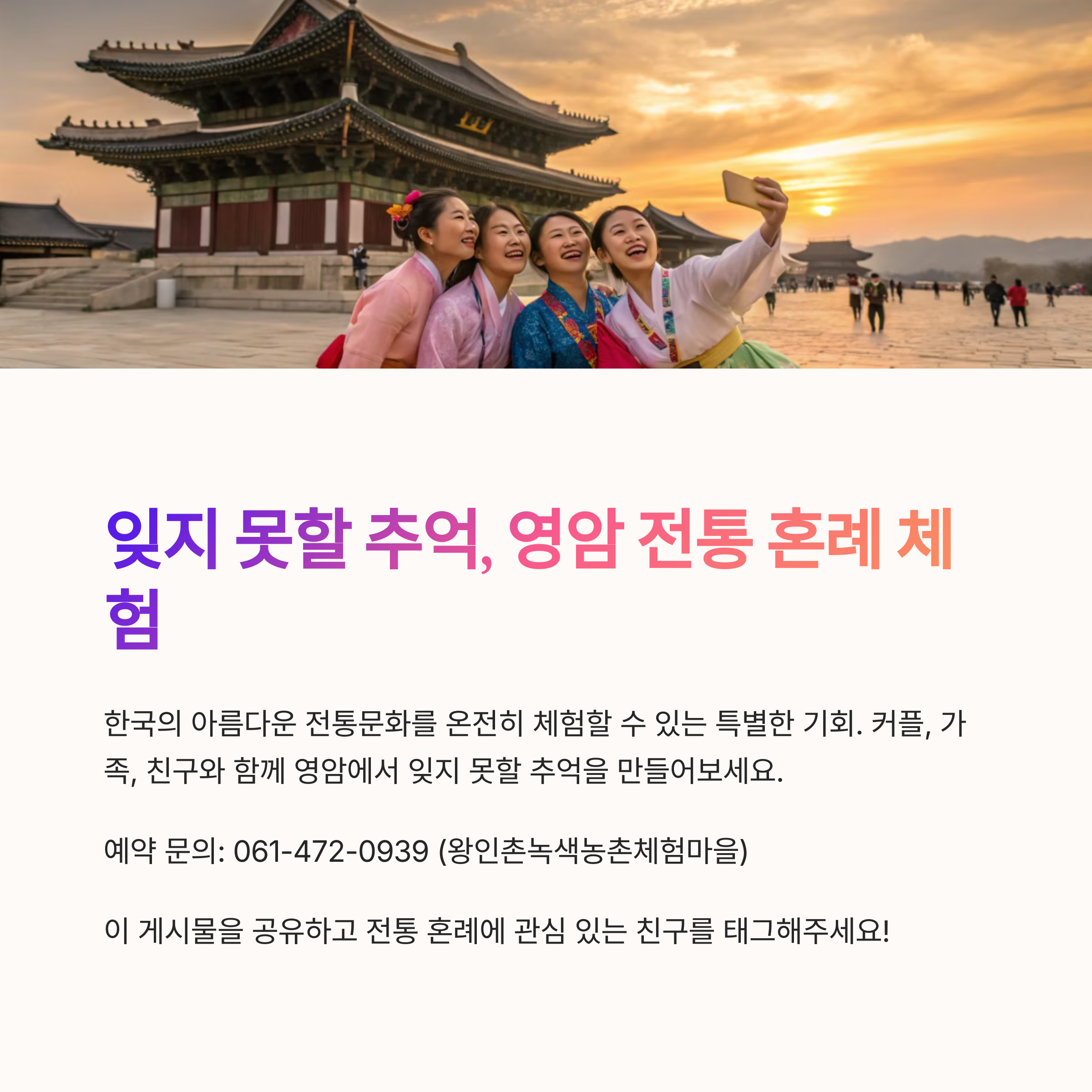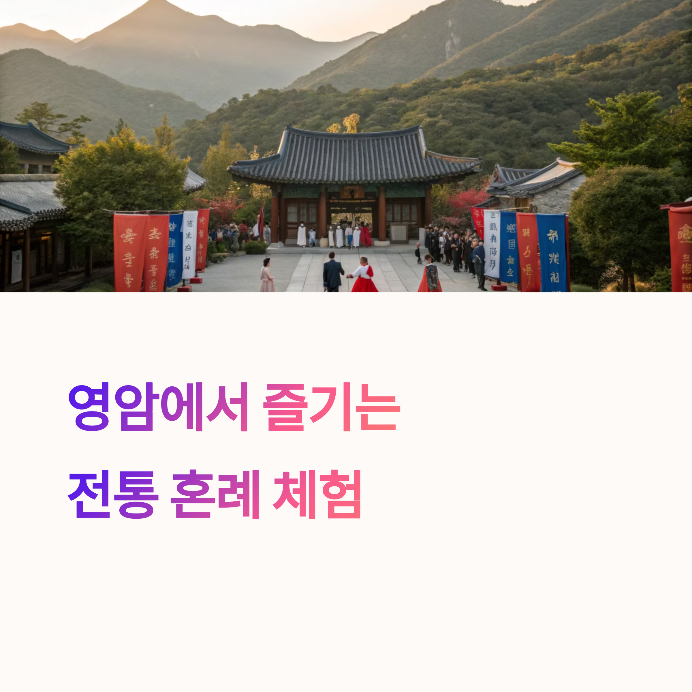 한국의 전통 문화를 직접 체험할 수 있는 기회! 영암에서 진행되는 전통 혼례 체험은 단순한 행사 그 이상입니다. 아름다운 한옥 마을에서 전통 혼례식을 경험하고, 한복을 입고 고즈넉한 마을을 거닐며 한국의 전통미를 만끽할 수 있습니다.