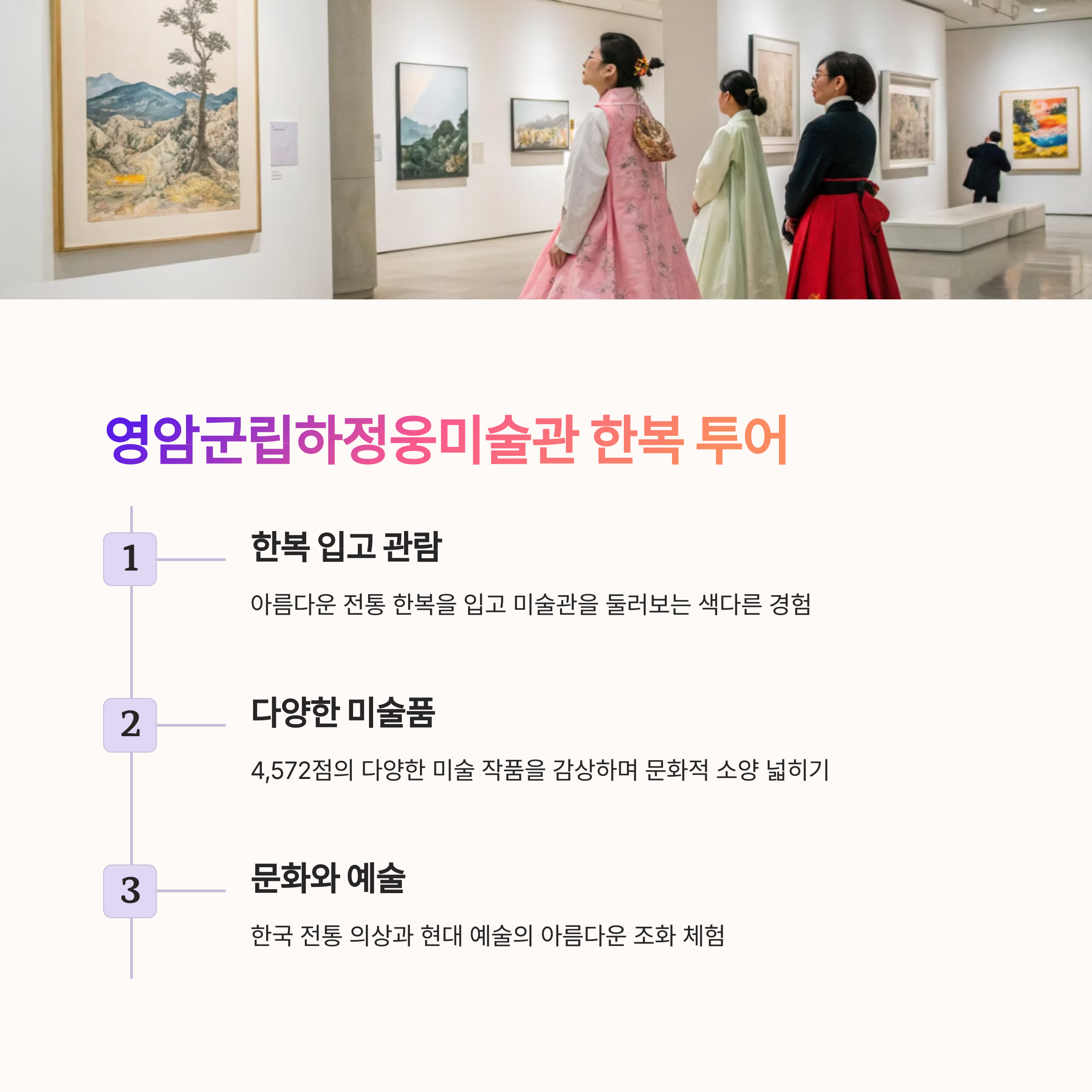 - 영암군립하정웅미술관 투어: 전통 한복을 입고 미술관을 관람하며 영암의 예술과 문화를 경험