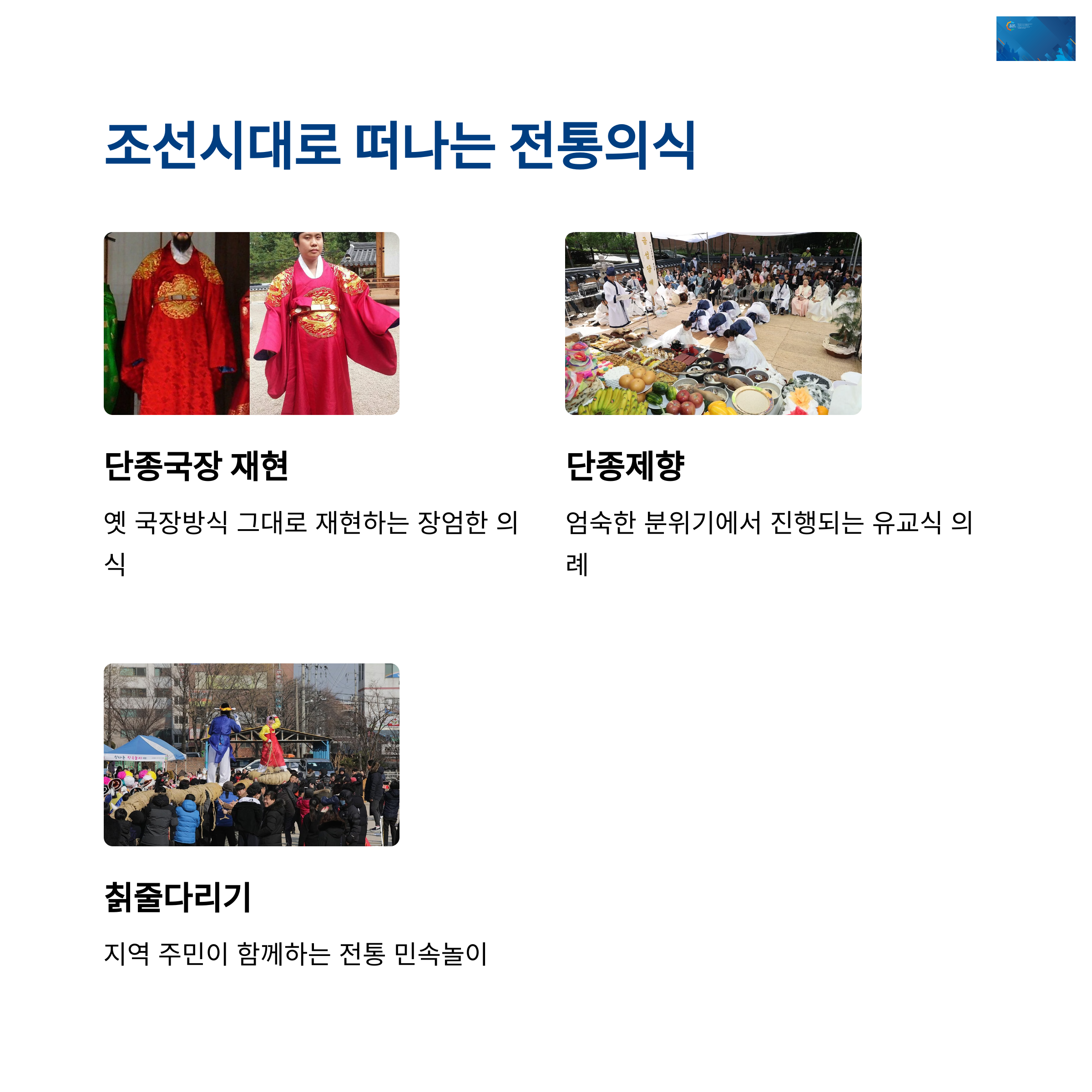영월 단종문화제는 역사와 문화, 자연이 어우러진 독특한 매력을 지닌 축제입니다. 조선의 비운의 왕 단종과 그를 따랐던 충신들을 기리는 이 축제는 단순한 행사 이상의 깊은 울림을 전달합니다. 해마다 열리는 이 문화제는 전통의식을 바탕으로 현대적 감성을 더해 남녀노소 누구나 참여할 수 있는 행사로 자리 잡았습니다. 특히 세계유산 장릉에서 열리는 단종제향과 국장 재현은 정제된 격식과 감동을 함께 느낄 수 있는 대표 프로그램으로 관람객들의 큰 호응을 얻고 있습니다.