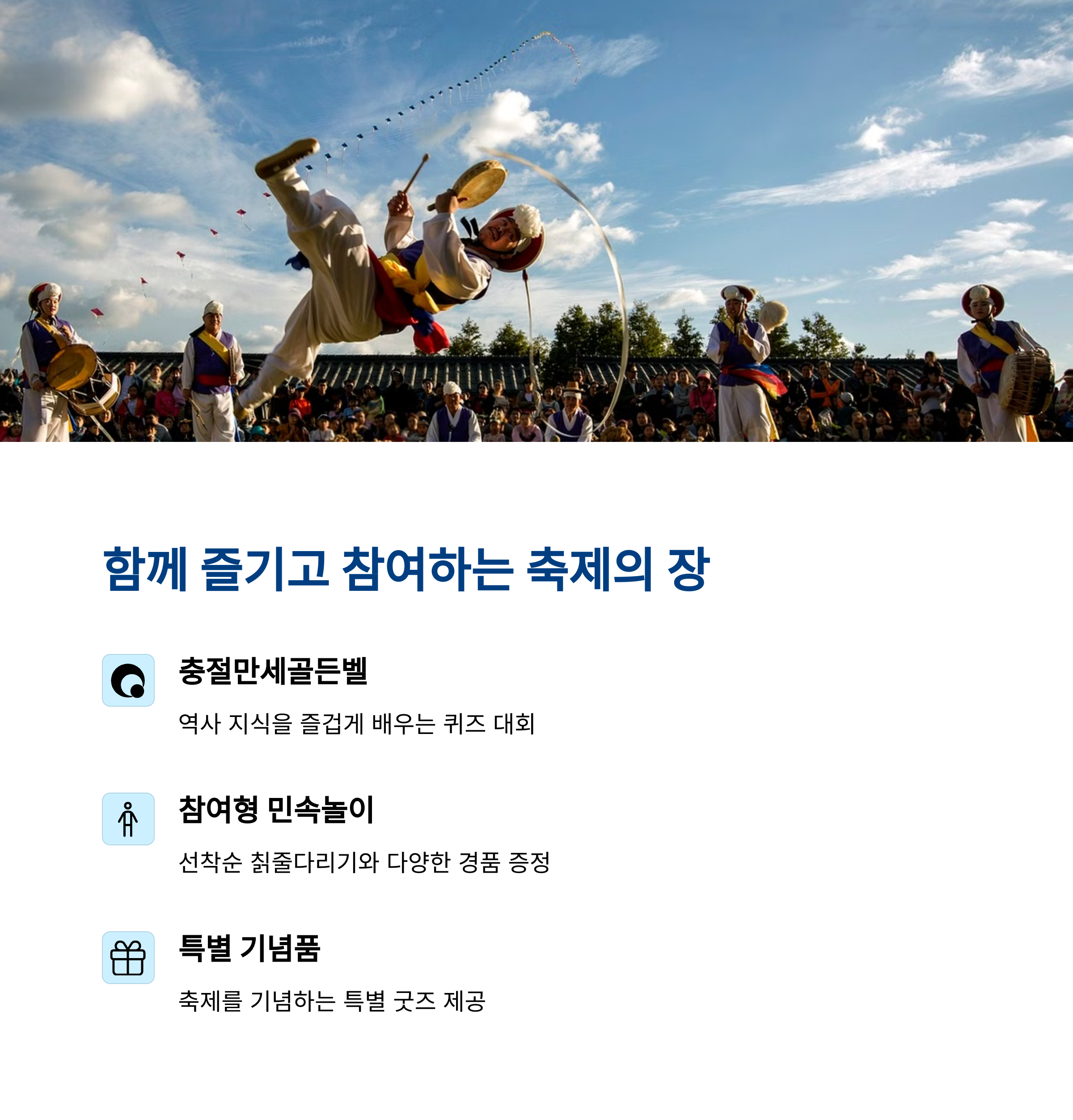 영월 단종문화제는 역사 교육과 힐링 여행을 동시에 즐길 수 있는 특별한 기회를 제공합니다. 조용한 산책길과 활기찬 퍼포먼스, 체험 프로그램이 절묘하게 조화를 이루며, 방문객들에게 잊지 못할 추억을 남겨줍니다. 봄의 정취가 가득한 4월의 영월에서 가족과 친구, 연인과 함께 축제의 흥겨움과 감동을 직접 체험해보시길 바랍니다.