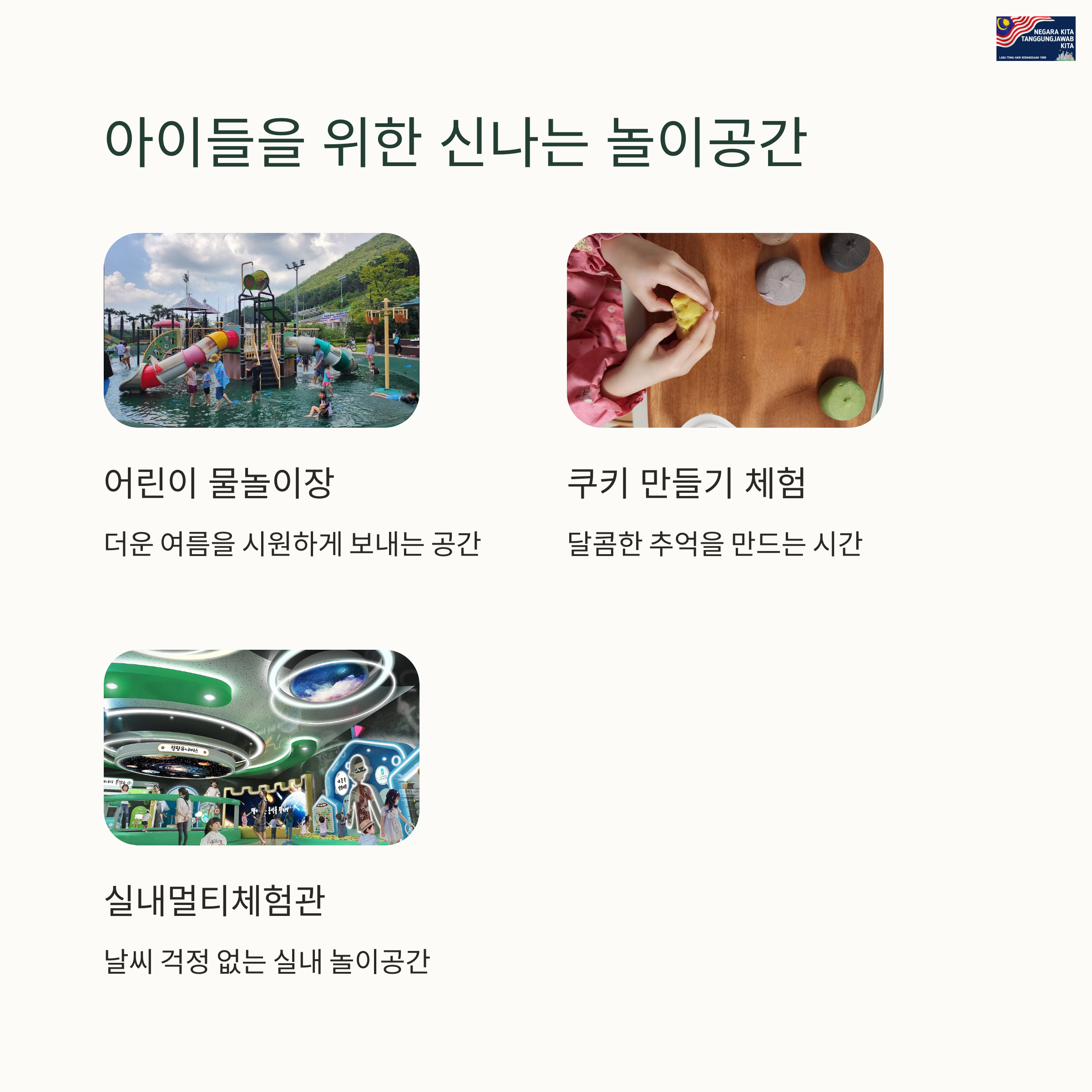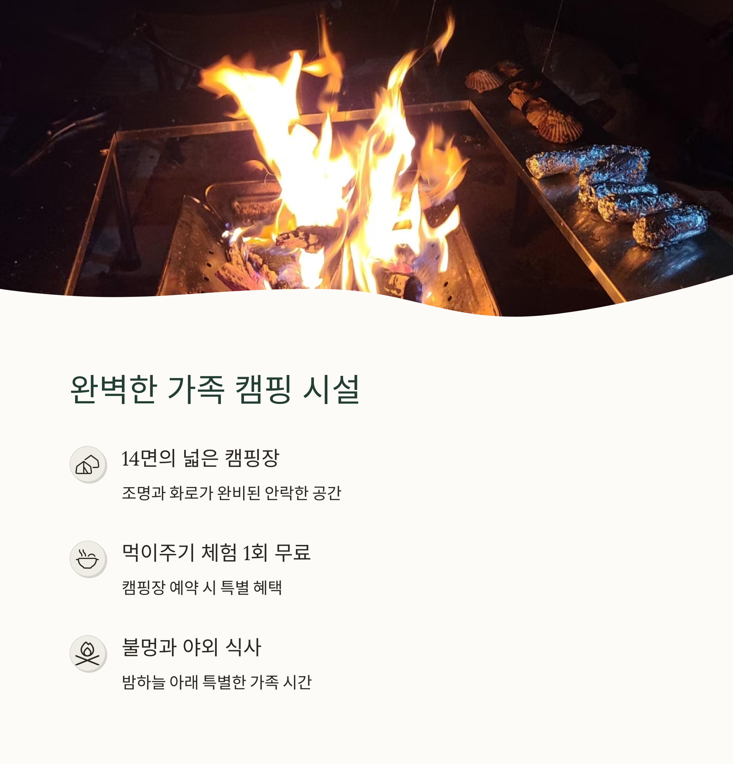 저녁 시간이 되면 캠핑장 분위기는 더욱 특별해집니다. 텐트 조명과 감성 화로로 꾸며진 사이트마다 불멍을 즐기거나, 가족끼리 고기를 구워 먹는 모습이 가득하고, 조용한 숲속 분위기와 동물 소리가 어우러지며 아이에게도 잊지 못할 추억이 됩니다. 여름에는 작은 수영장과 잔디밭 놀이터도 함께 운영돼 낮 시간도 알차게 보낼 수 있습니다.