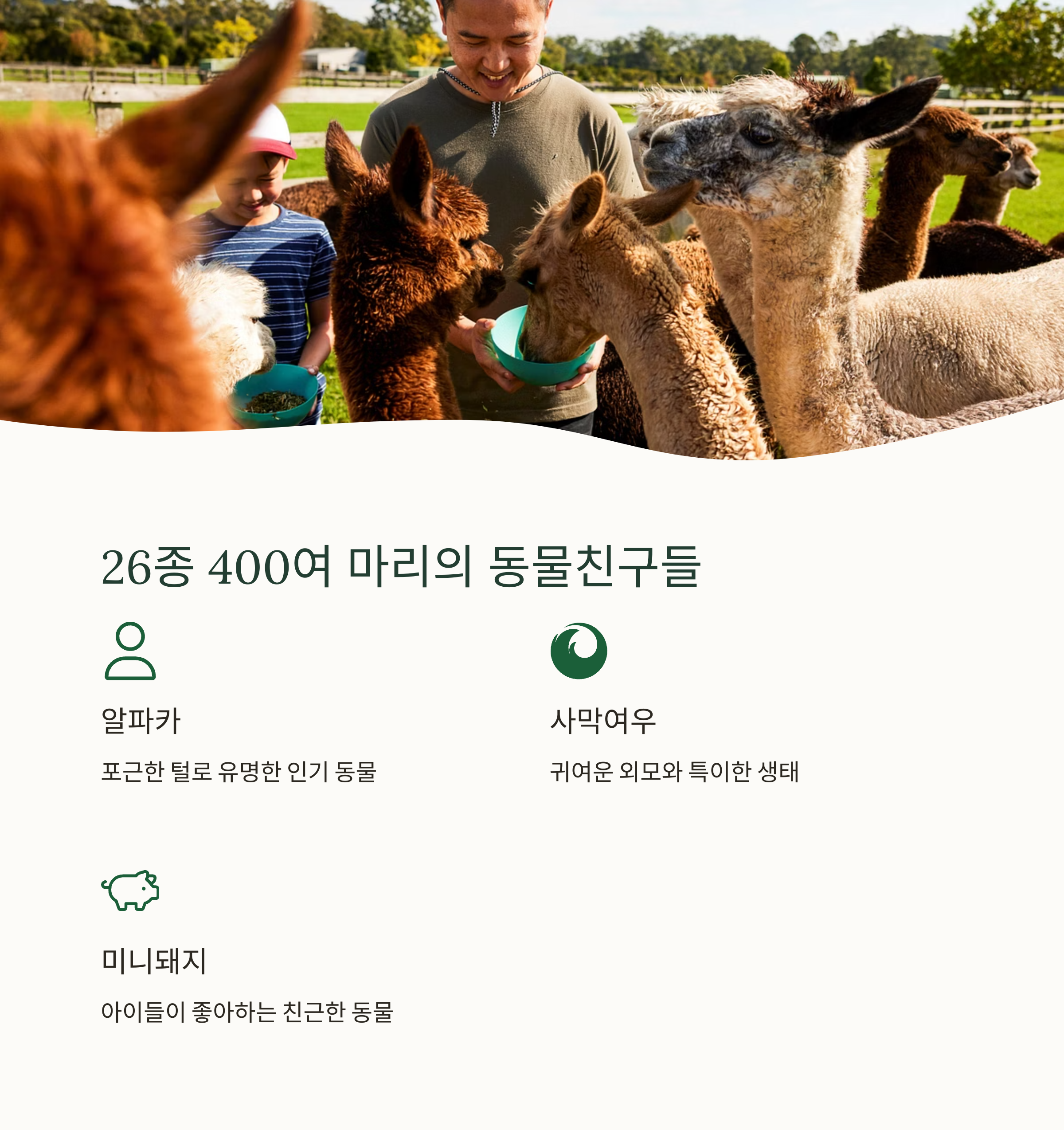 | 사전예약제 / 캠핑 + 체험 | 동물원 단독 방문도 가능 | 아이와 함께 안전하게 즐기는 공간 |