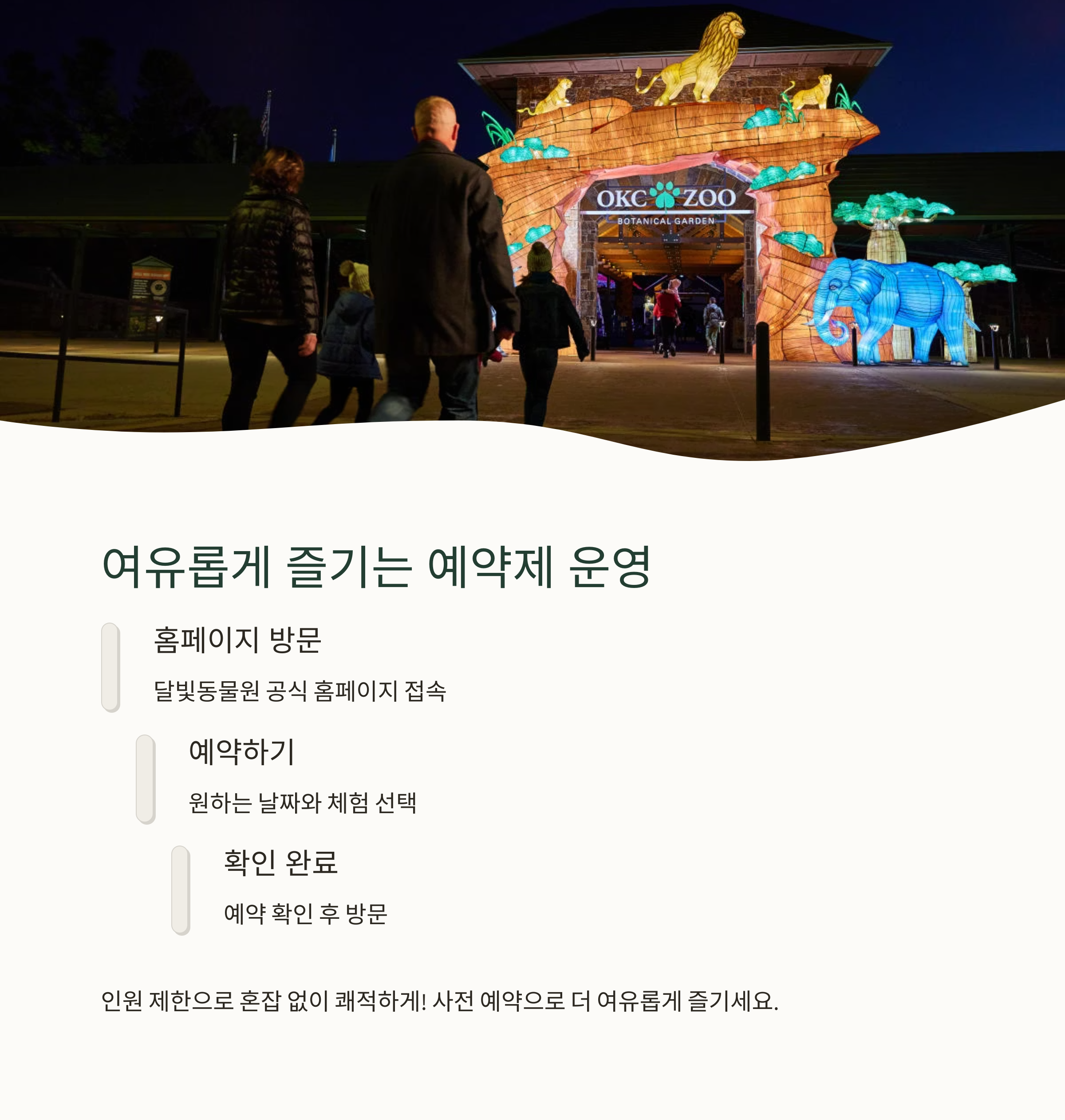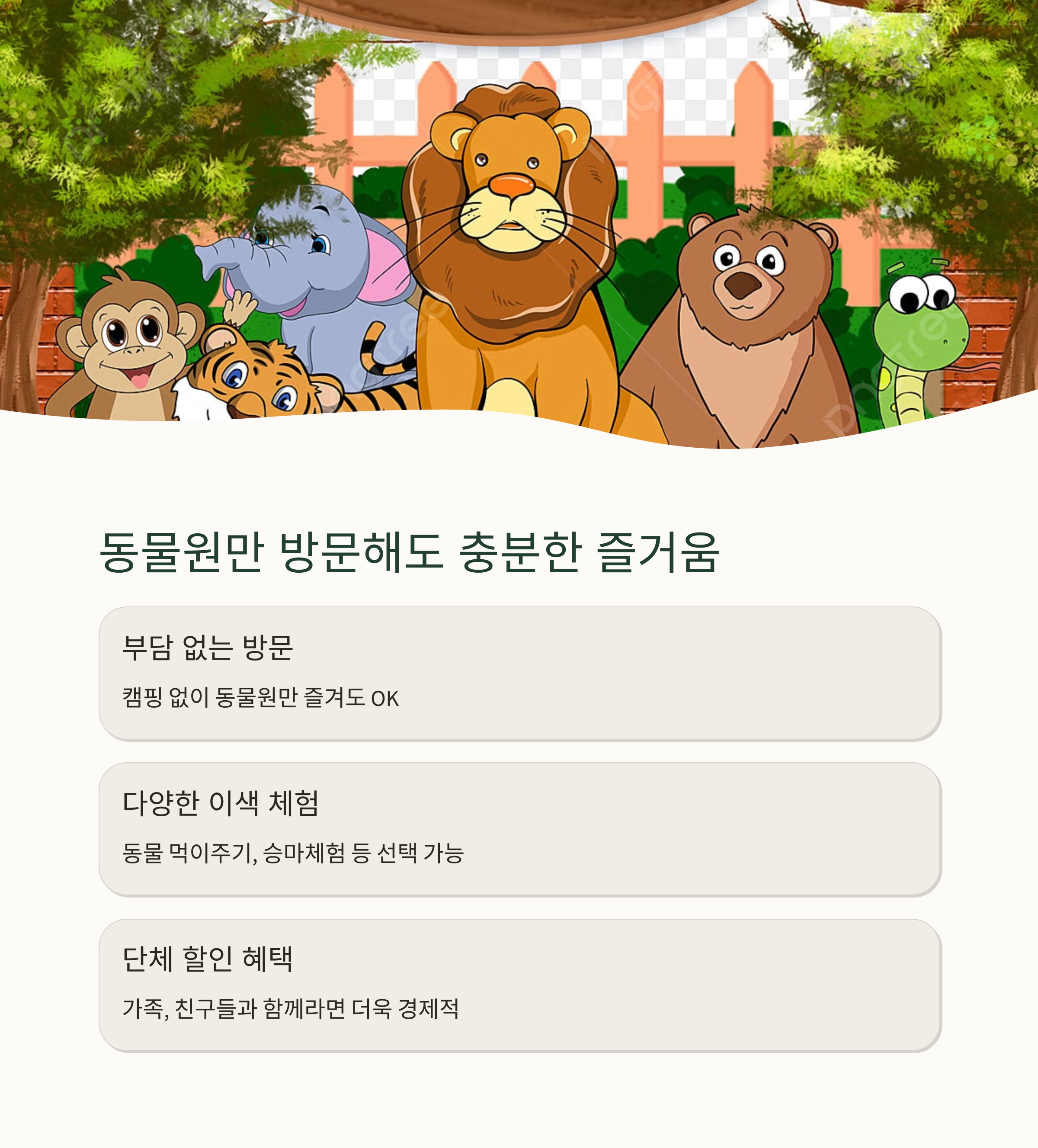 운영 방식 사전 예약제 / 캠핑 + 체험 패키지 가능 / 동물원 단독 입장도 가능