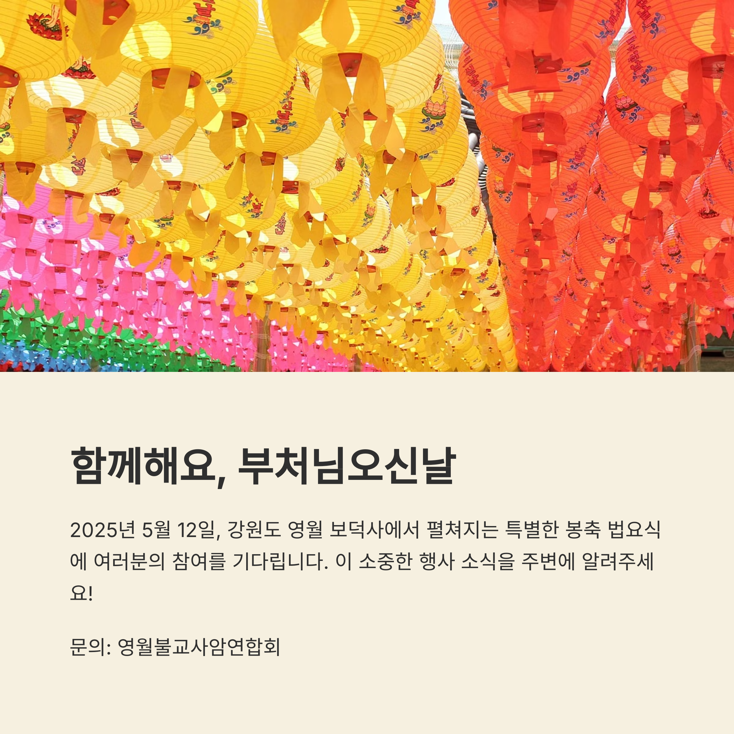 영월 보덕사의 부처님오신날 행사에 대해 궁금한 점이나 다녀오신 경험이 있다면 댓글로 공유해주세요. 지역 문화에 대한 생생한 이야기는 많은 분들께 큰 도움이 됩니다!