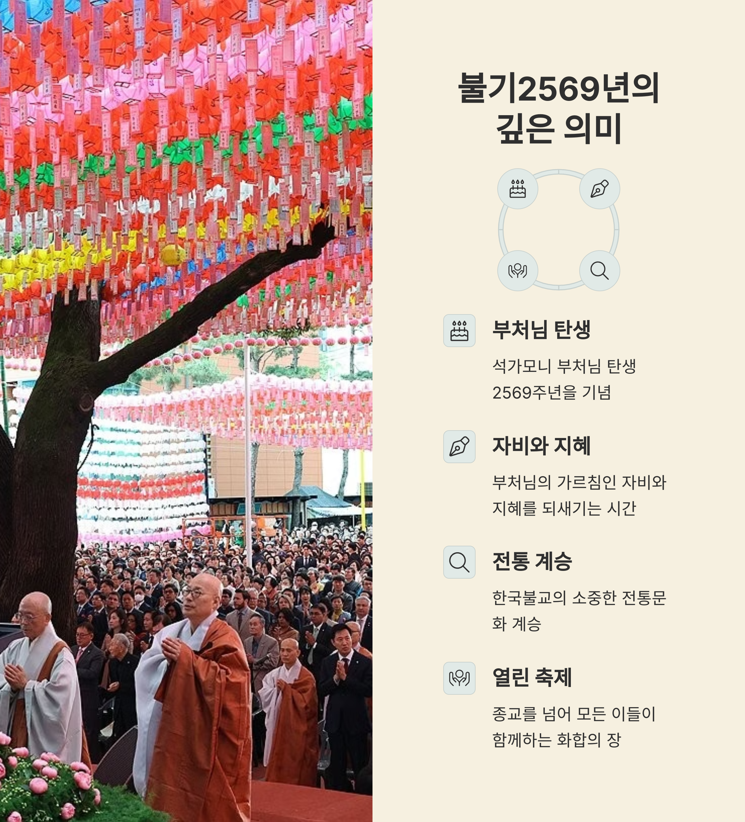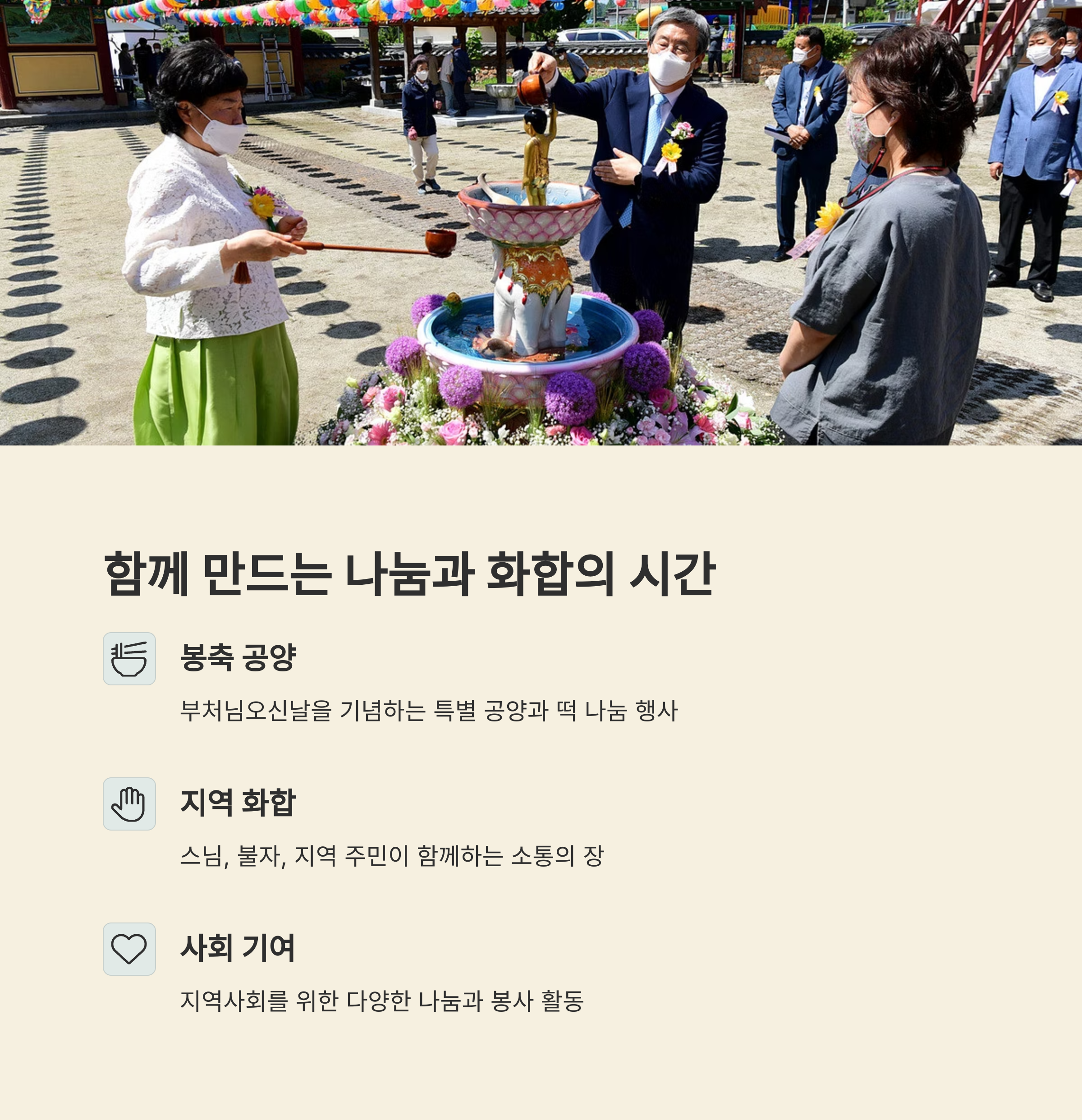 | 전통 불교 + 지역 역사문화 결합 | 누구나 참여 가능한 열린 행사 | 공동체 화합과 나눔 실천의 장 |