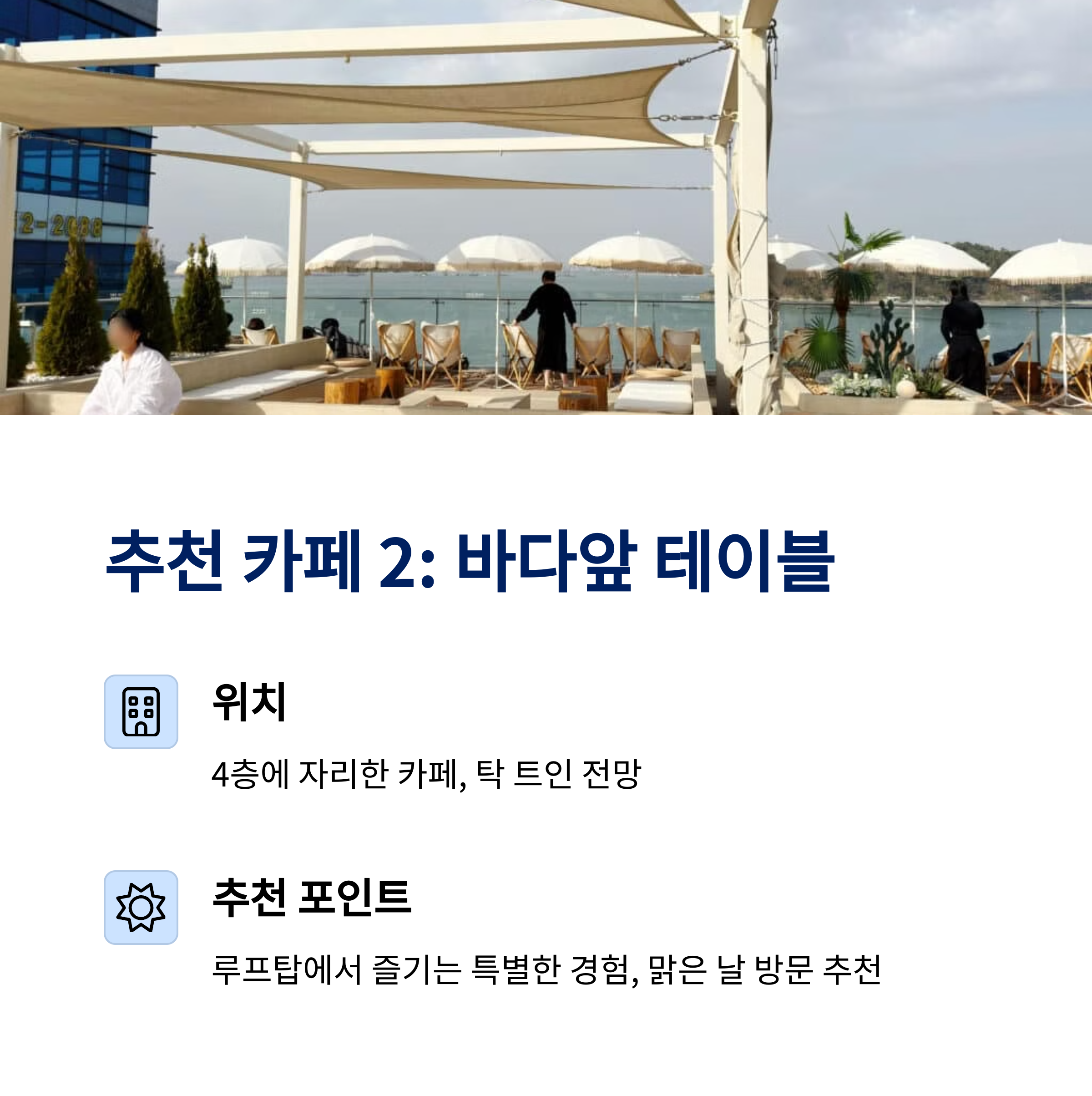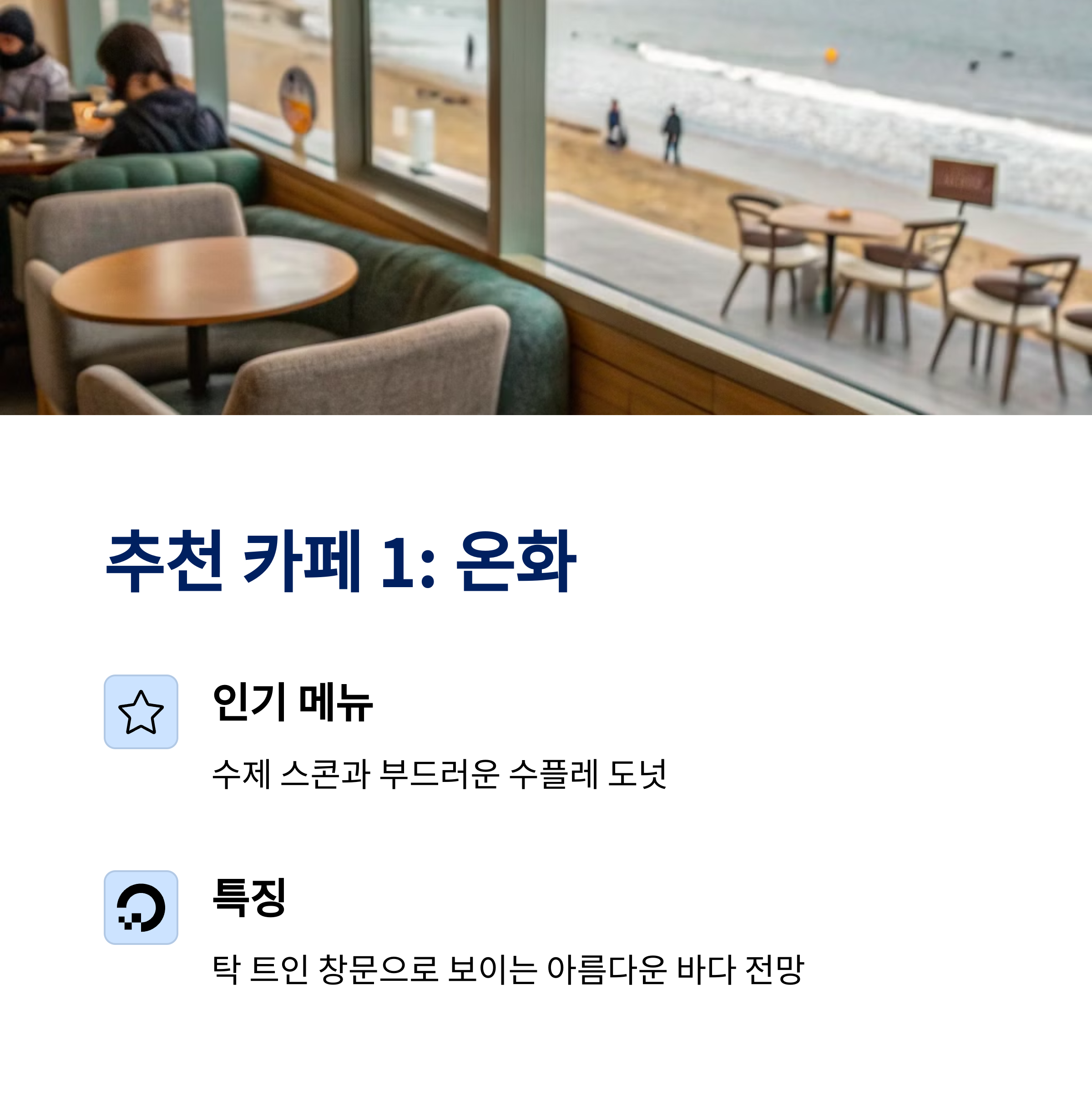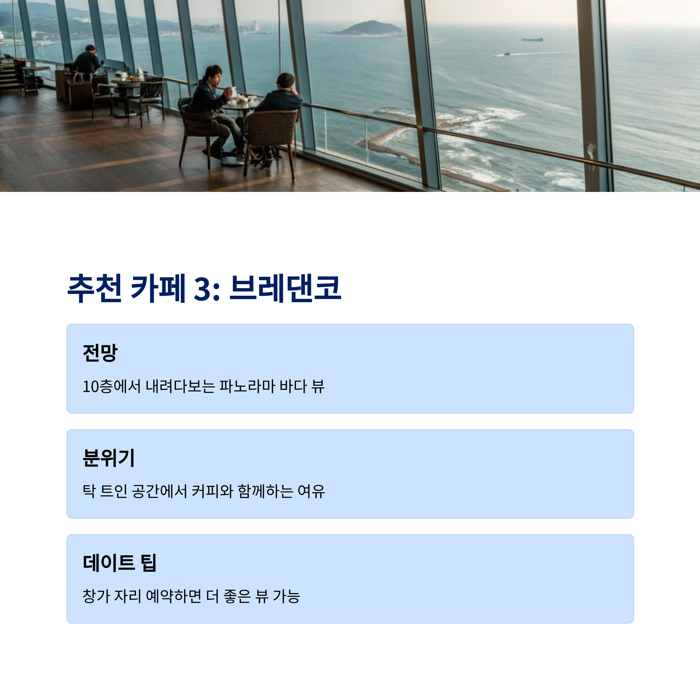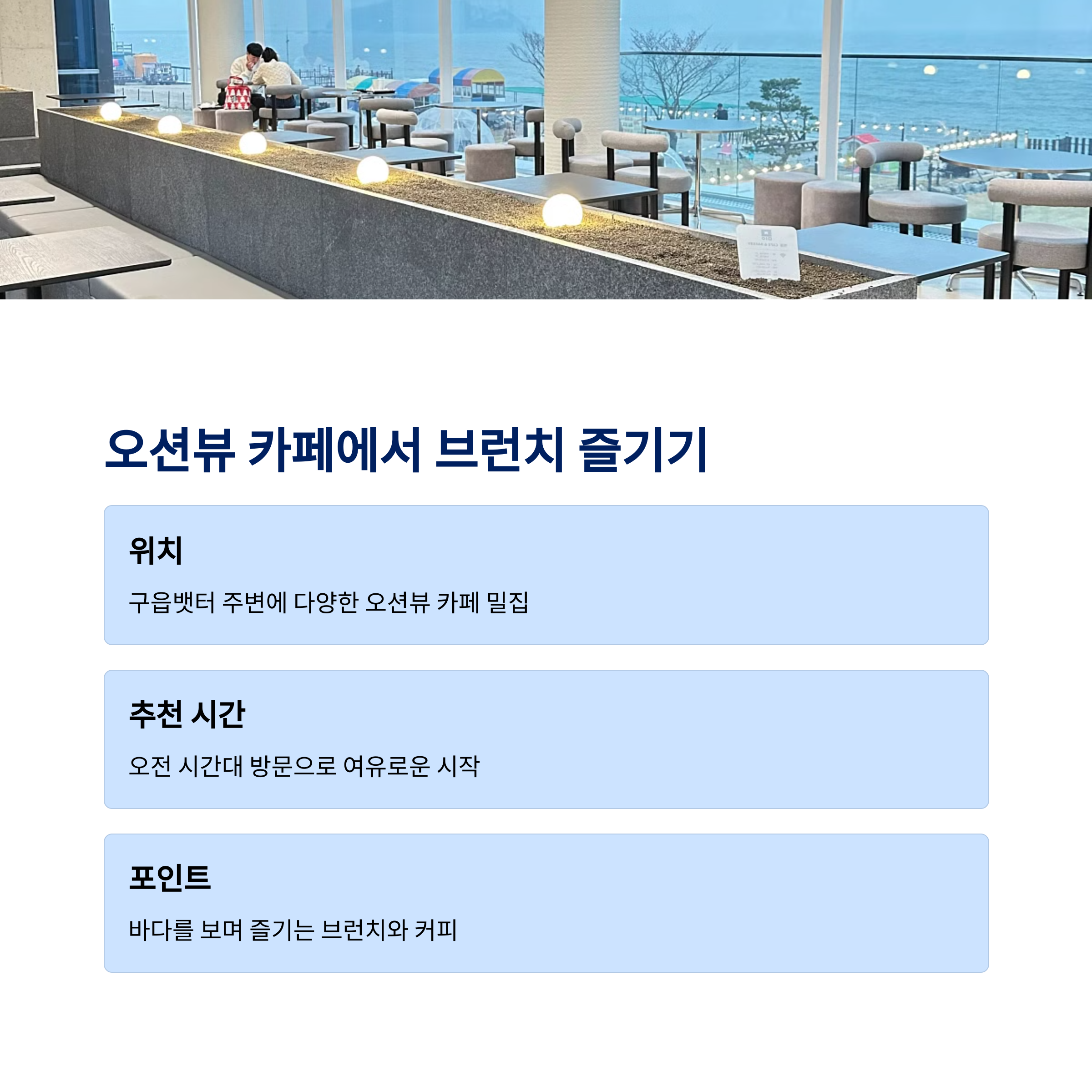 바다 전망 & 브런치 모두 만족 가능 다양한 해산물 합리적 가격에 맛보기 짧지만 알찬 일정 구성에 적합