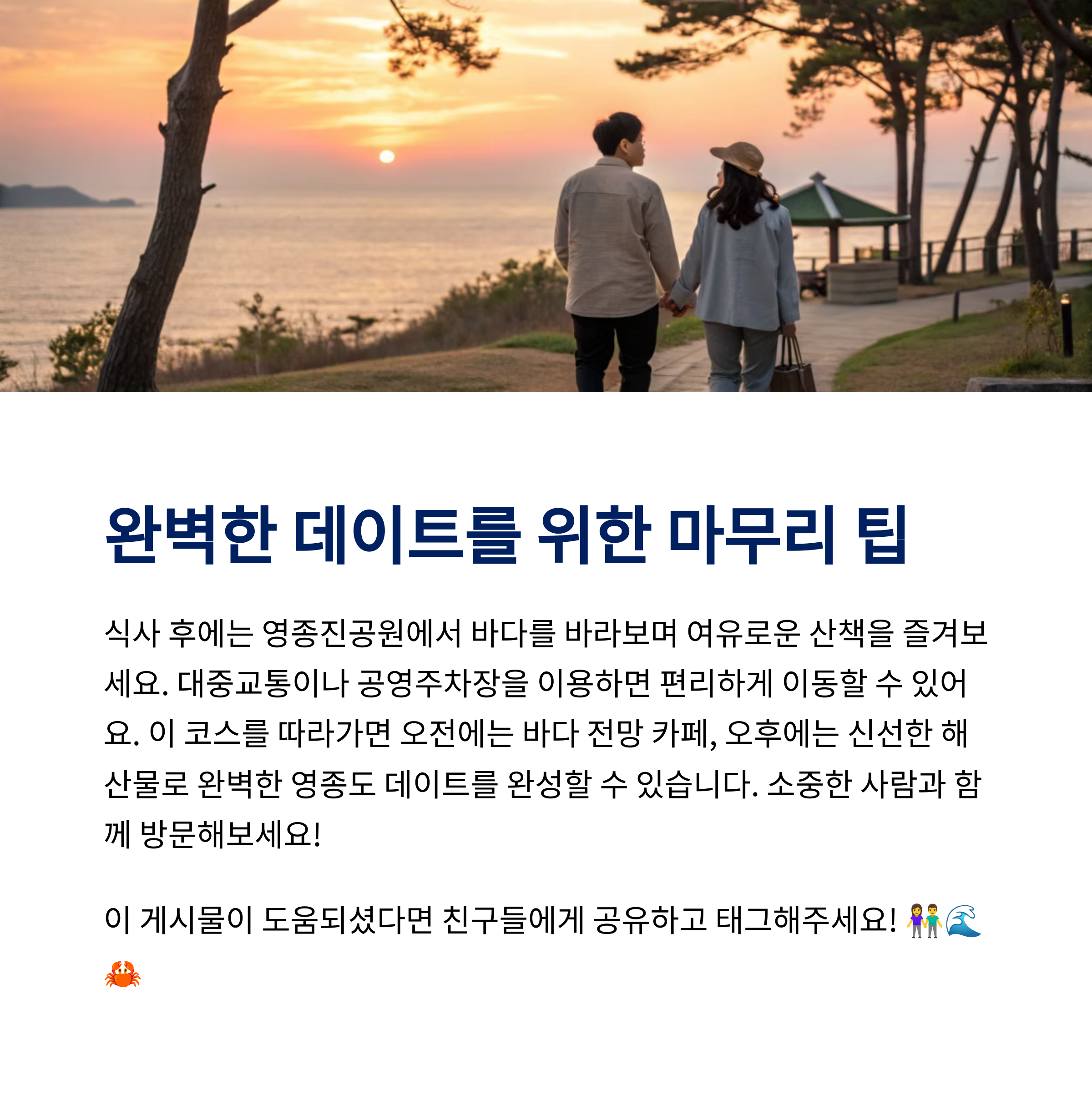 영종도는 특별한 준비 없이도 훌쩍 떠날 수 있는 매력적인 반나절 여행지입니다. 오션뷰 카페의 감성과 신선한 해산물의 풍미는 평범한 하루를 특별한 데이트로 만들어줍니다. 시간 여유에 따라 자유롭게 코스를 조정할 수 있고, 대중교통과 차량 모두 접근성이 좋아 누구나 쉽게 즐길 수 있다는 점도 장점입니다. 오늘 소개한 루트로 사랑하는 사람과 함께 소중한 추억을 만들어보시길 바랍니다.