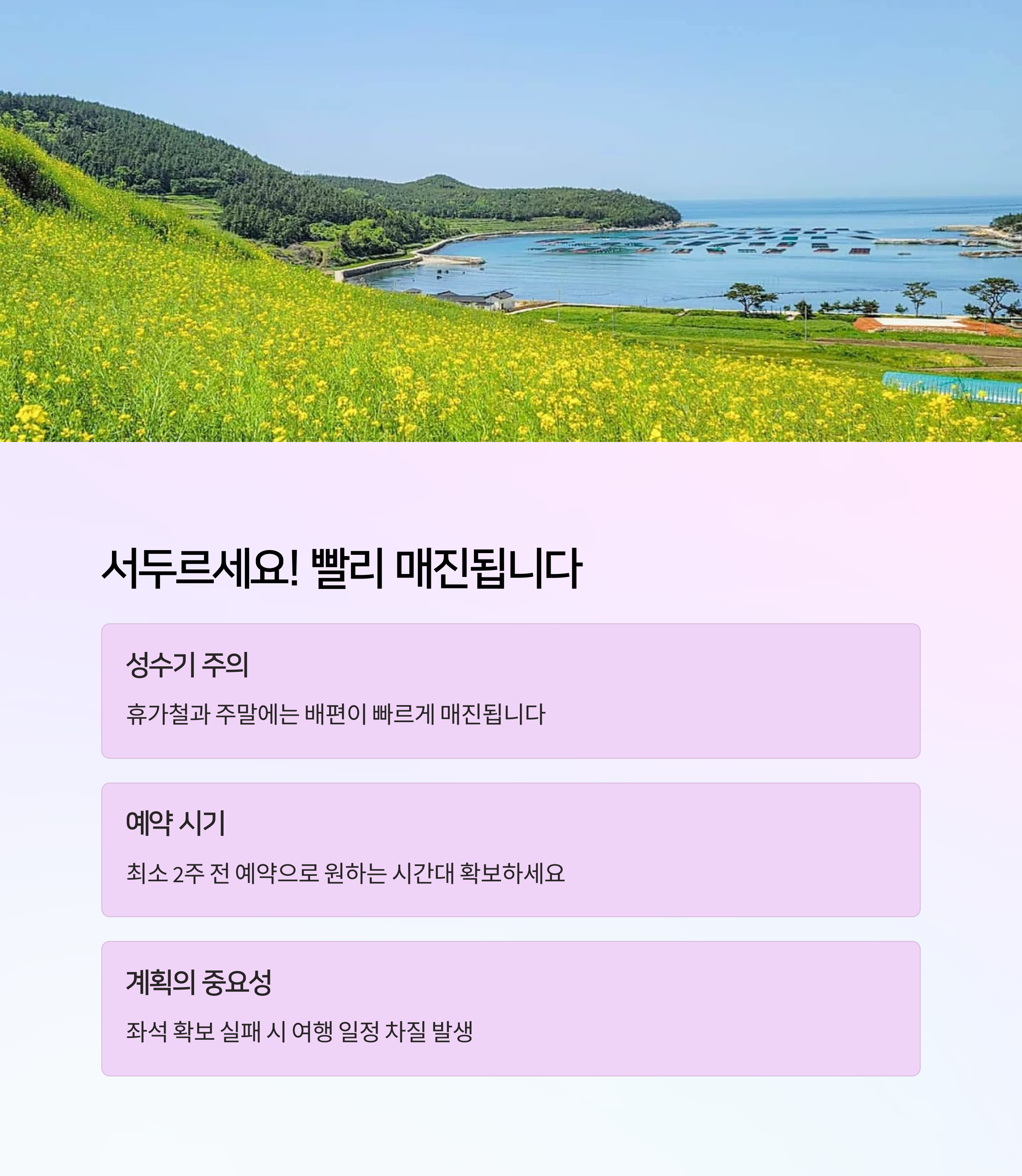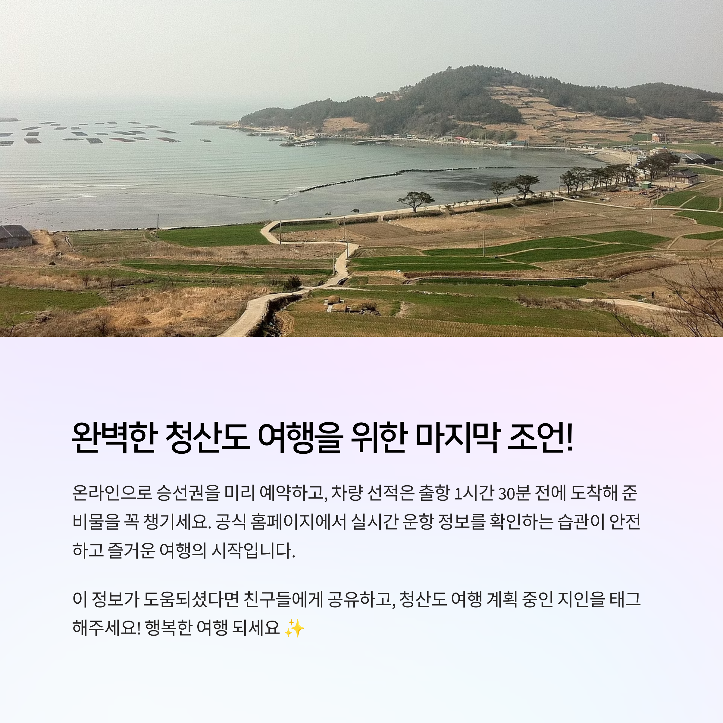 청산도 여행을 다녀오셨다면, 배편 예약이나 차량 선적 관련 꿀팁을 댓글로 공유해주세요. 여러분의 실제 경험이 처음 여행을 준비하는 분들에게 큰 도움이 될 수 있습니다!