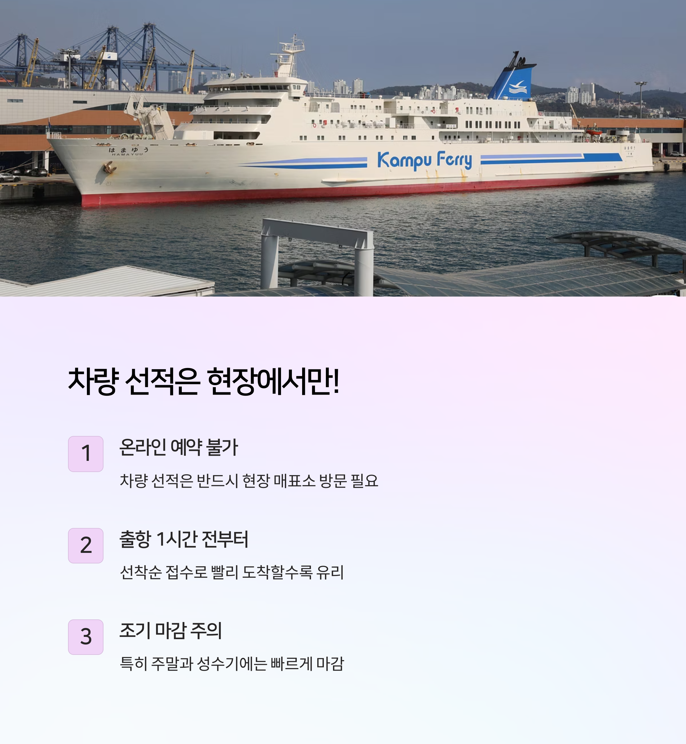 성수기나 주말에는 차량 선적 대기 인원이 많아 조기 마감되기도 합니다. 선착순 접수이므로 최소 1시간 이상 여유를 두고 도착하는 것이 좋습니다.