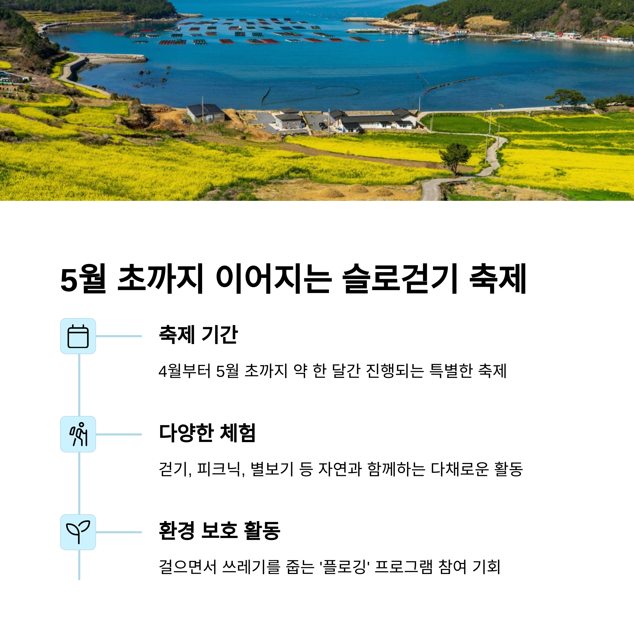 ‘슬로걷기 축제’는 5월 초까지 이어지며, 주요 슬로길 구간 곳곳에 포토존, 쉼터, 테마 피크닉존이 마련되어 있어 자연과 함께하는 걷기 여행이 가능합니다. 별보기, 감성 야간산책 등 청산도의 밤 풍경을 즐길 수 있는 프로그램도 시기에 따라 운영되며, 도보 여행자 중심의 동선이 잘 설계된 섬이라 렌트 없이도 하루 코스로 섬 전체를 감상할 수 있습니다.