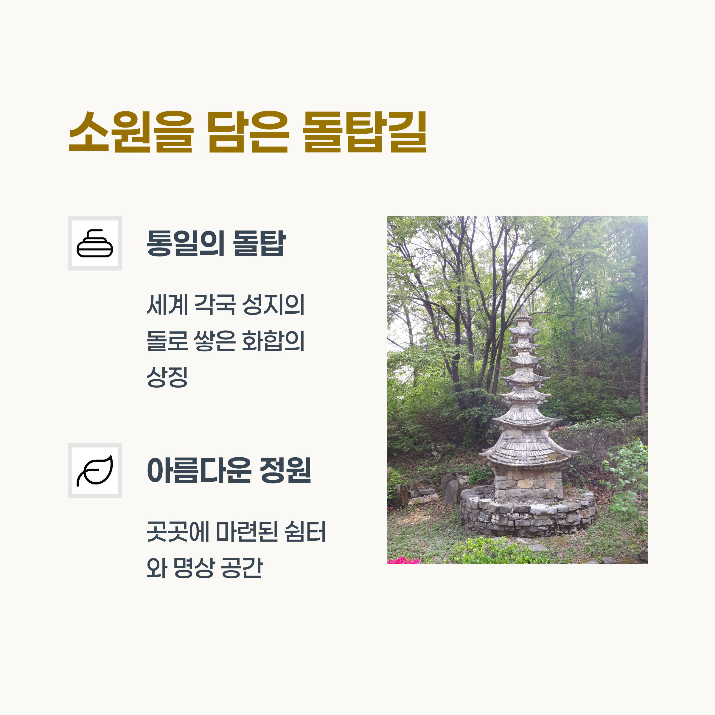 와우정사는 입장료와 주차료가 모두 무료이며 조용한 분위기 속에서 산책을 즐길 수 있는 힐링 명소입니다. 곳곳에 돌탑을 쌓고 소원을 비는 공간과 정자 쉼터, 작은 정원이 조성되어 있어 어르신부터 아이까지 모두가 편안하게 머무를 수 있습니다. 또한 근처에 위치한 용인농촌테마파크와 연계해 하루 코스로 여유 있게 둘러보기에도 좋습니다. 사진 촬영을 좋아하는 분들에게도 만족스러운 장소로 사계절 내내 변화하는 자연 경관을 감상할 수 있어 재방문 의사를 높이는 매력적인 여행지입니다.