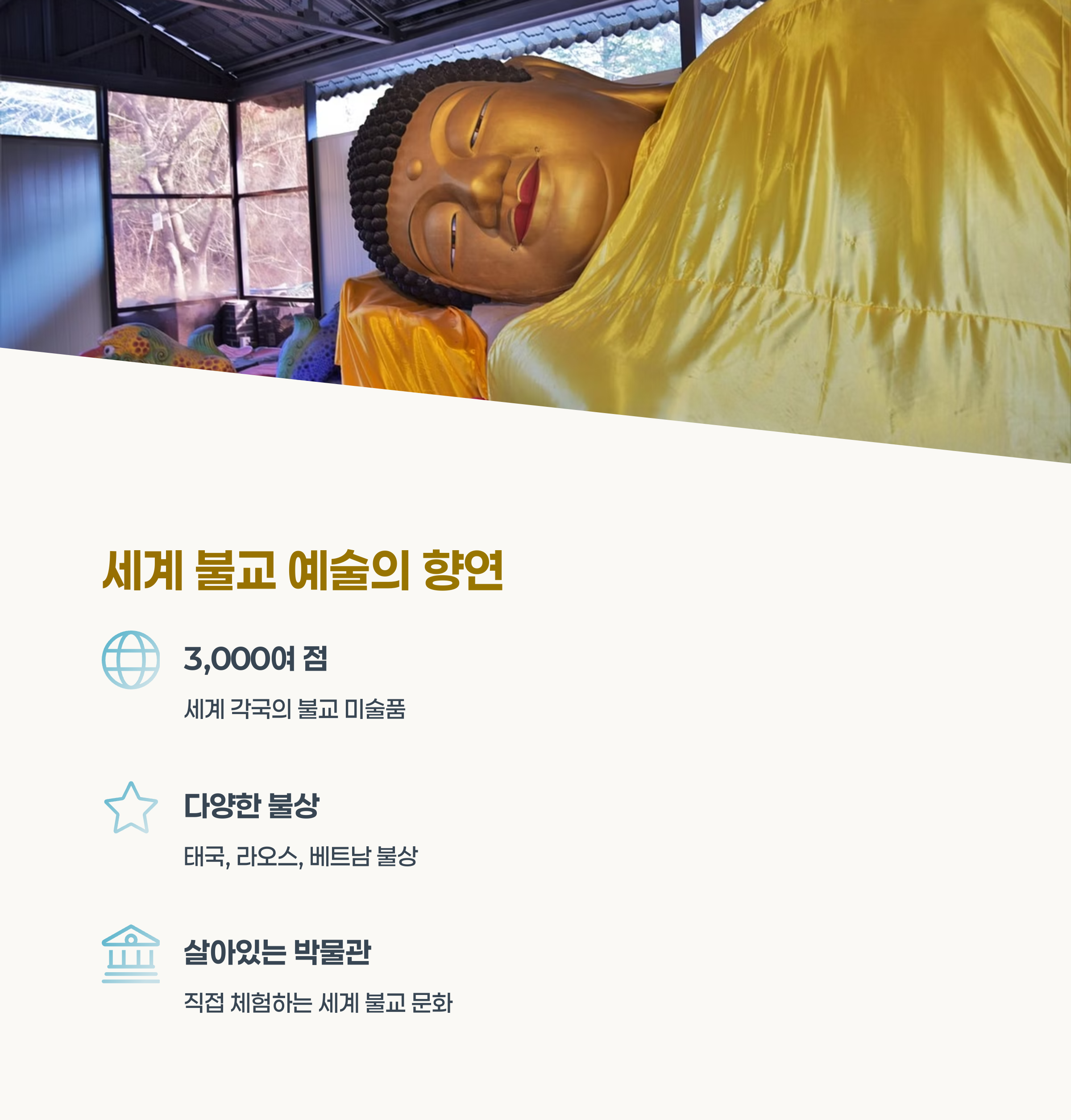 세계 최대 규모의 목재 와불상 감상 입장료와 주차비 부담 없이 즐기는 힐링 다양한 국가의 불상과 불교미술품 전시